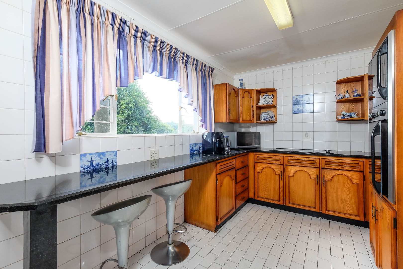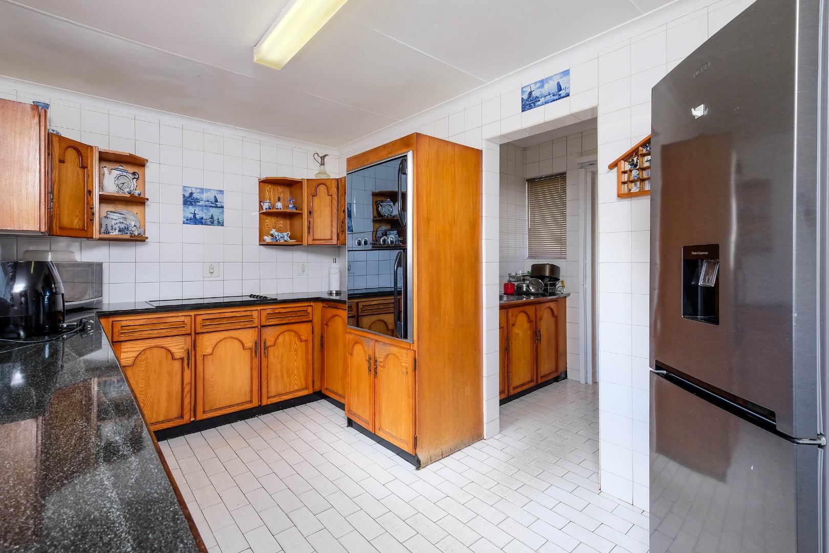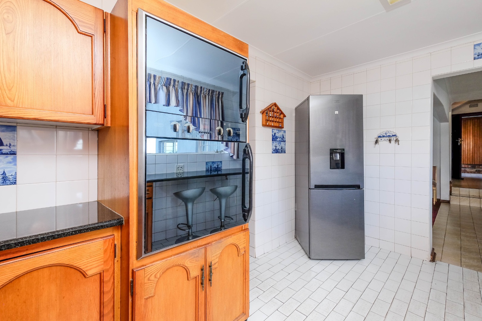 The well-appointed kitchen offers granite countertops, wooden cabinetry, an eye-level dual oven, a breakfast nook, and ample space for appliances. A separate scullery adds extra convenience.
