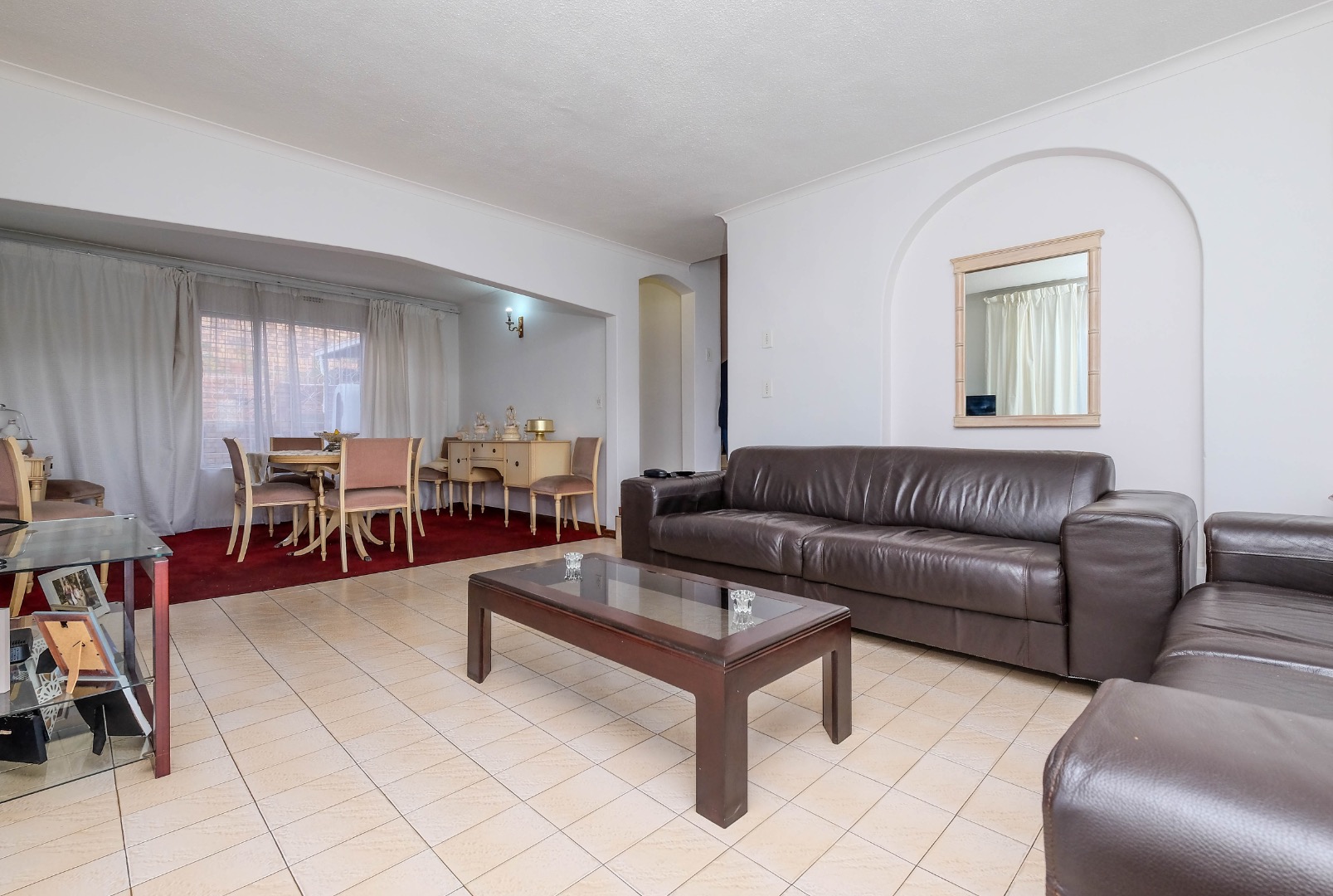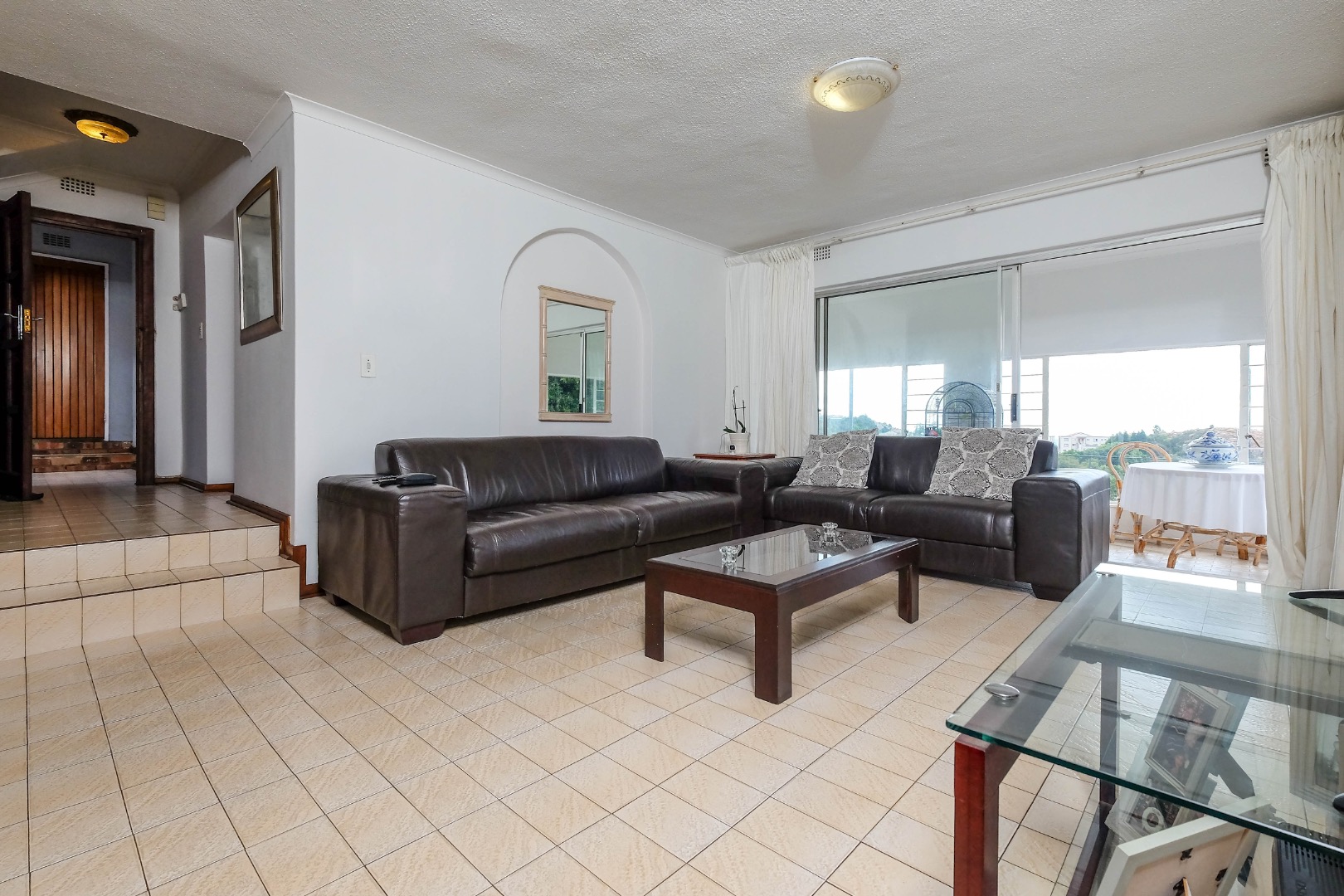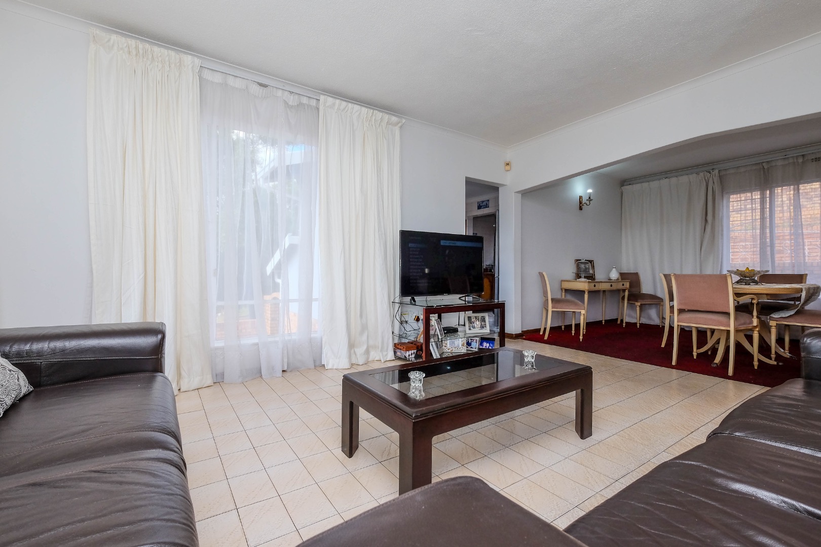 The home flows into spacious open-plan dining and living areas, further extended by an additional living space through glass sliding doors. This versatile area can be used as an enclosed patio, offering stunning views and direct access to the front garden.
