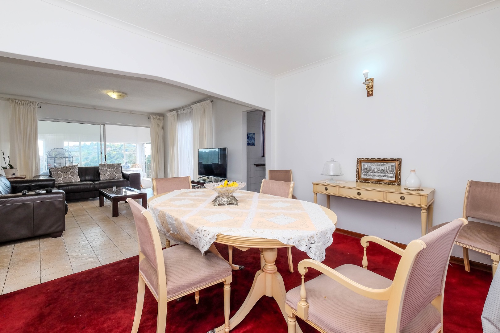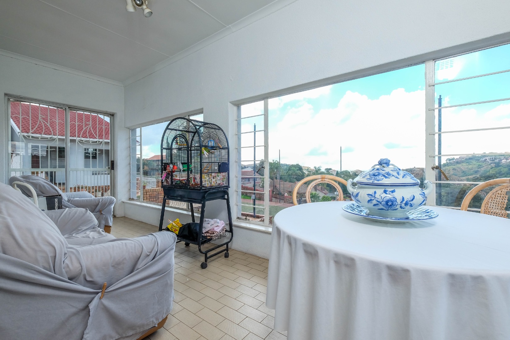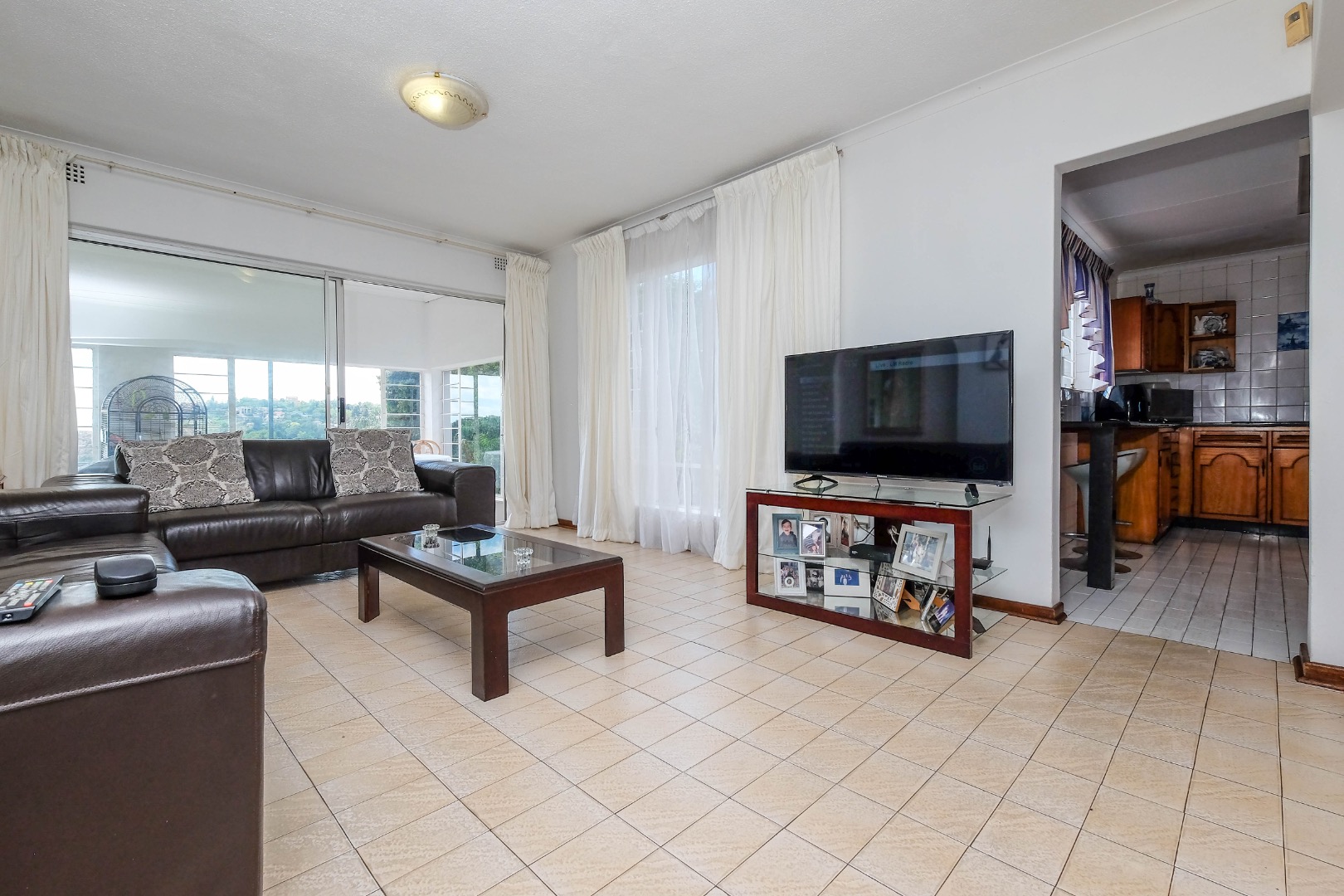 The home flows into spacious open-plan dining and living areas, further extended by an additional living space through glass sliding doors. This versatile area can be used as an enclosed patio, offering stunning views and direct access to the front garden.