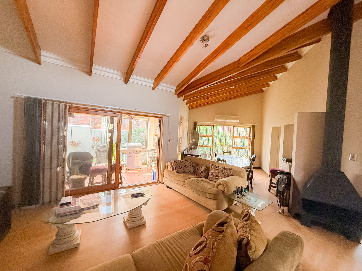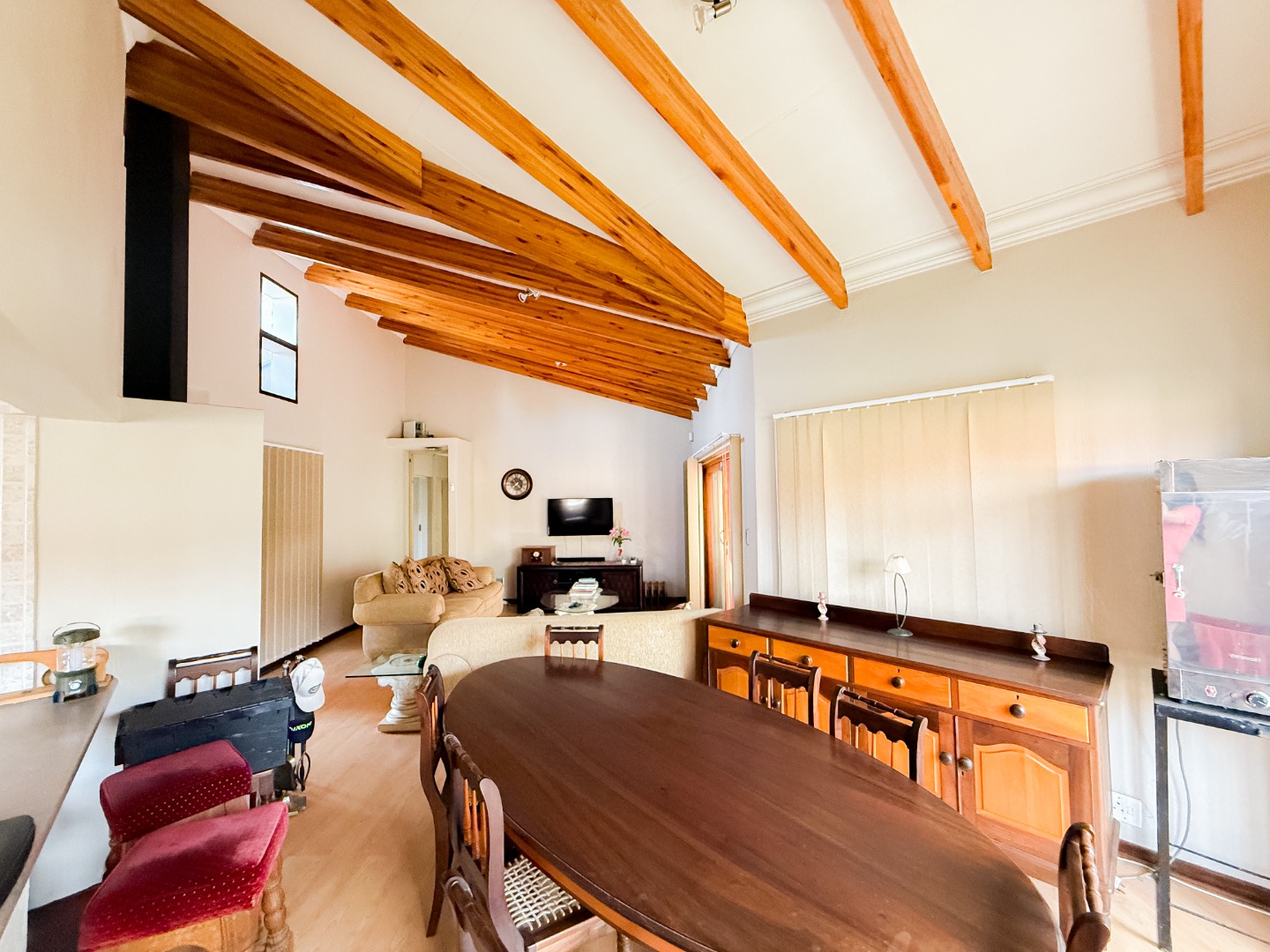 Upon entering, you are welcomed into a spacious open-plan living area that flows effortlessly between the TV room, dining area, and kitchen. The kitchen is well-equipped with a gas stove, new tiles to be done in the kitchen, and ample cupboard space, creating a practical and convenient space for everyday cooking. Its layout allows easy access to the living and entertainment areas, making it ideal for hosting family gatherings or social occasions.