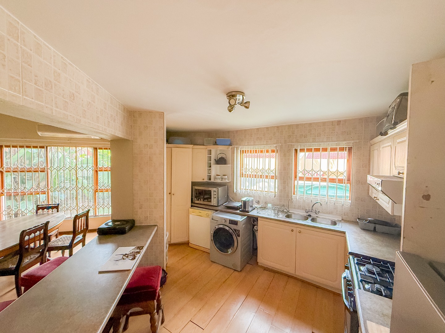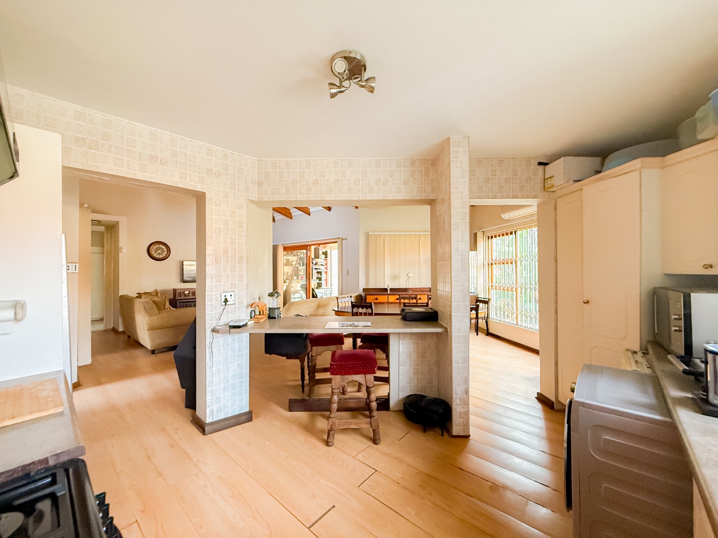 Upon entering, you are welcomed into a spacious open-plan living area that flows effortlessly between the TV room, dining area, and kitchen. The kitchen is well-equipped with a gas stove, new tiles to be done in the kitchen, and ample cupboard space, creating a practical and convenient space for everyday cooking. Its layout allows easy access to the living and entertainment areas, making it ideal for hosting family gatherings or social occasions.