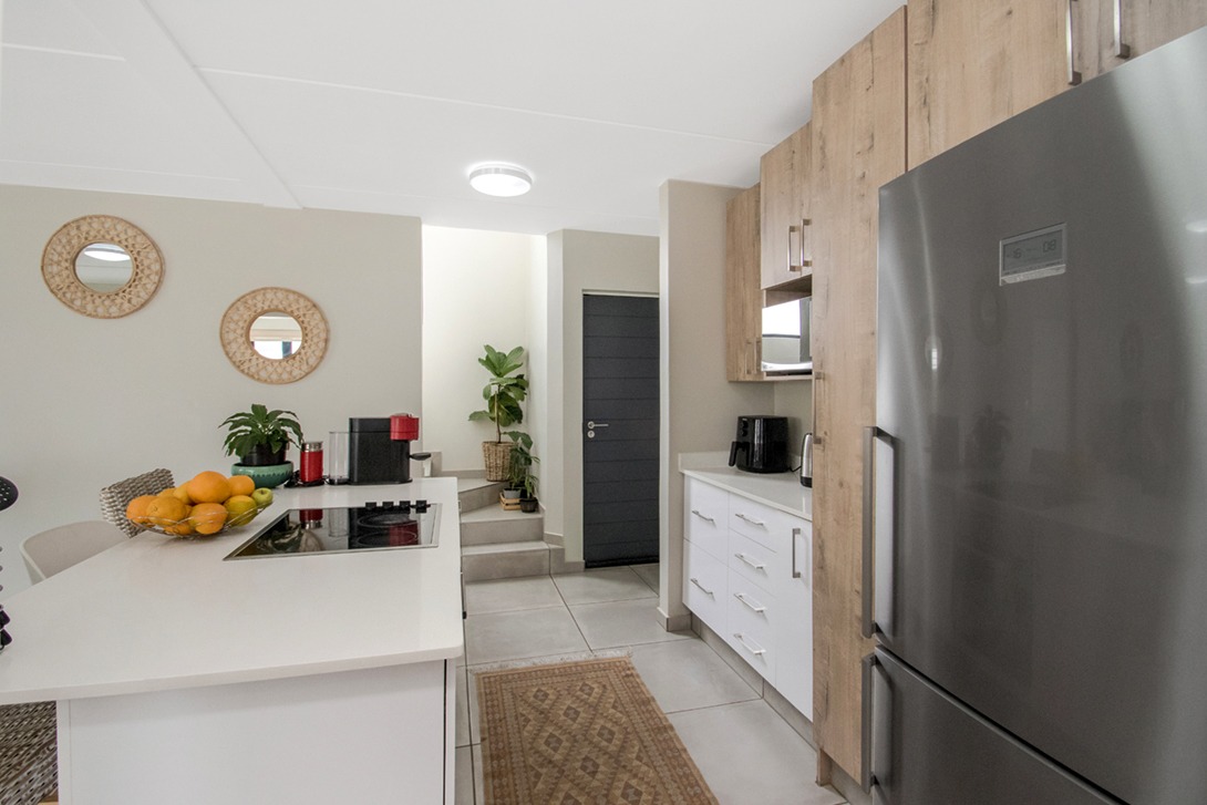 The sleek, modern kitchen is a chef’s dream, equipped with high-quality quartz countertops, a 4-plate hob, and an under-counter oven. With generous cupboard space, the kitchen ensures an organized and clutter-free environment. The adjoining scullery offers additional storage and utility space, while the automated garage—tiled for easy maintenance—provides direct access to the home and includes room for a top-loader washing machine.