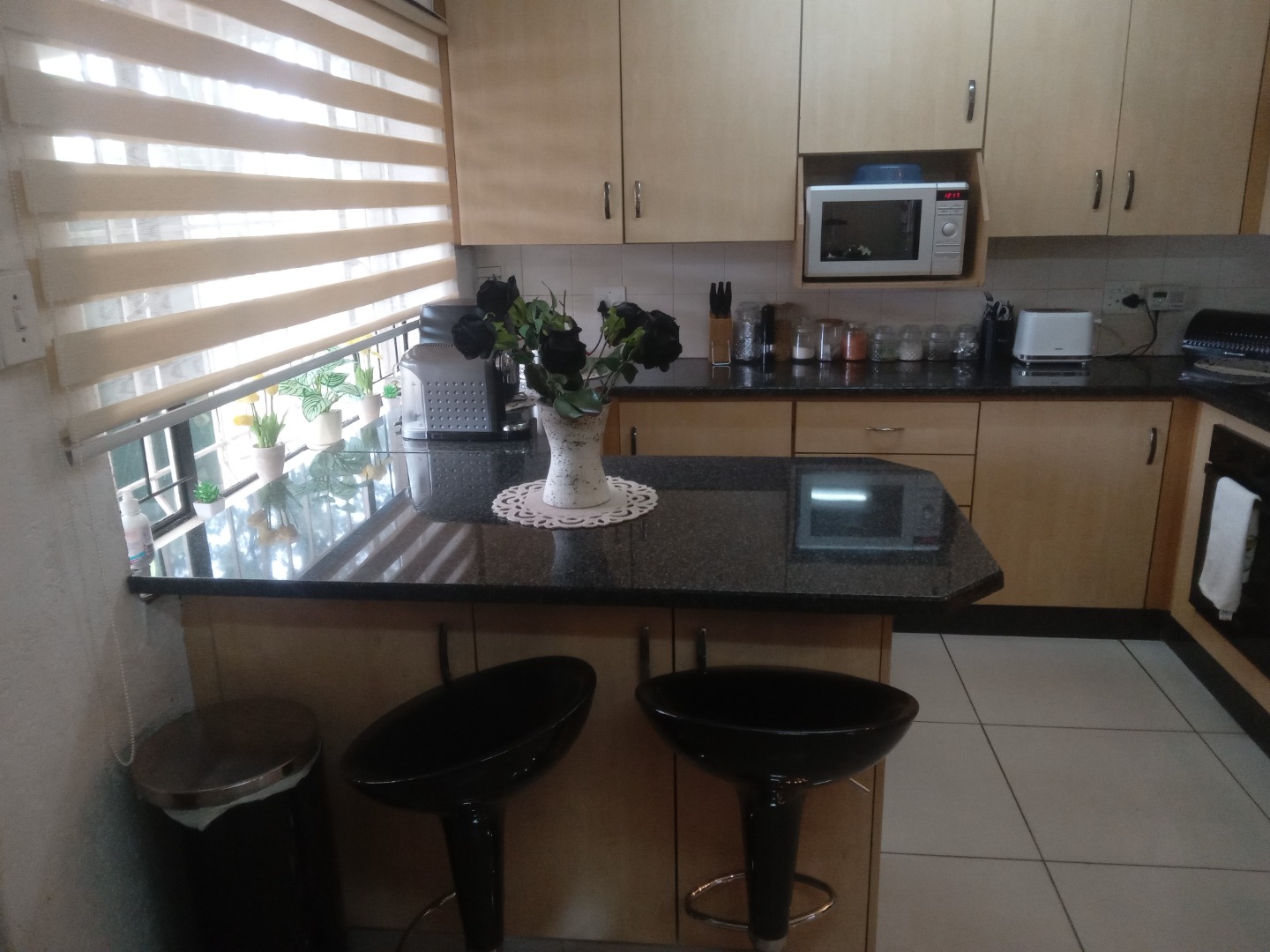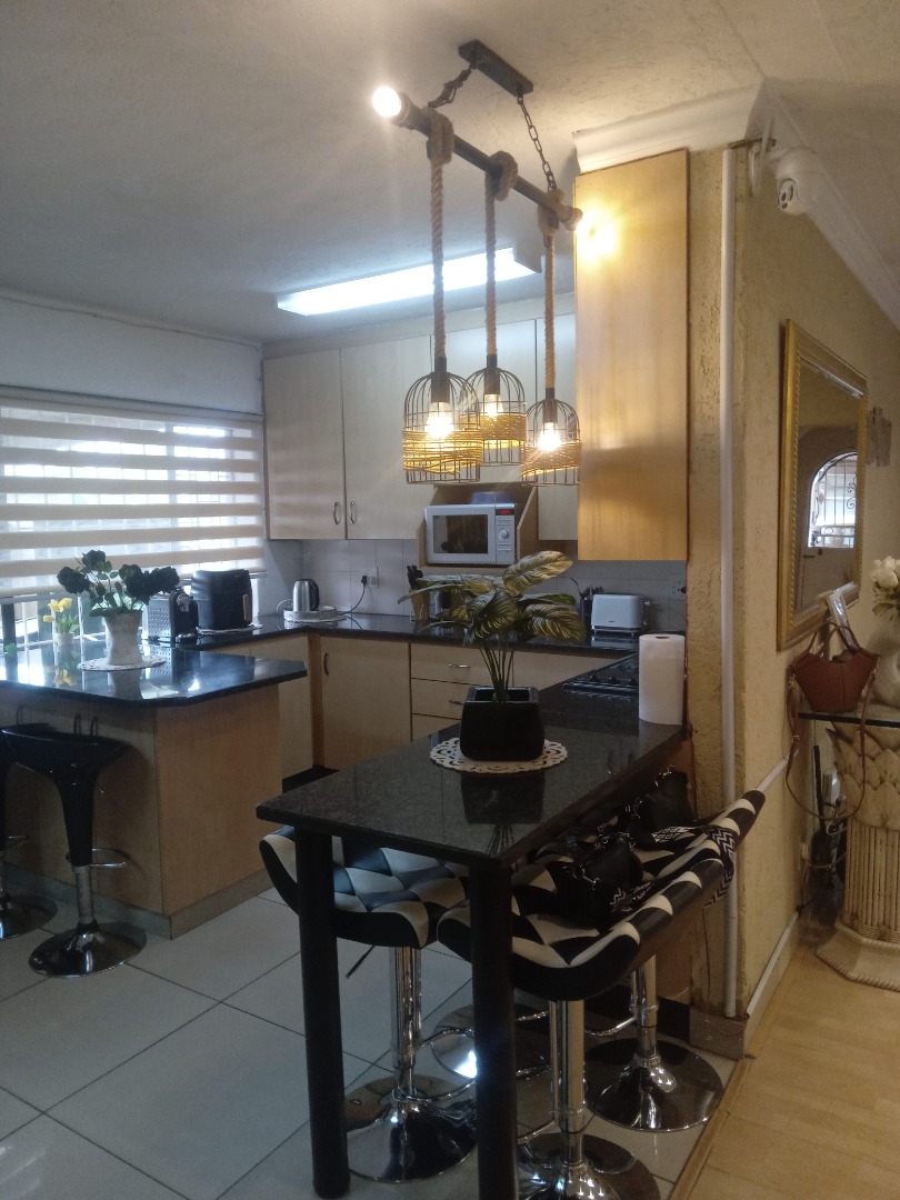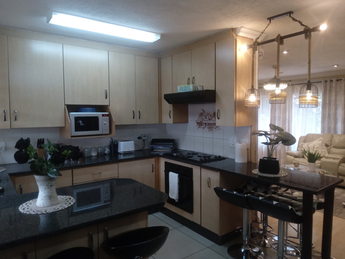 *Kitchen finished with granite countertops, extensive cabinetry, and statement lighting that elevates the home’s modern aesthetic