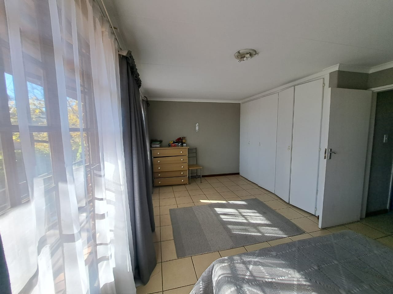 Upstairs, two comfortable bedrooms offer private retreats, each benefiting from abundant natural light through large windows. Both bedrooms feature tiled flooring and neutral walls, with one including a built-in wardrobe for efficient storage. The single bathroom serves these rooms, completing the private quarters.