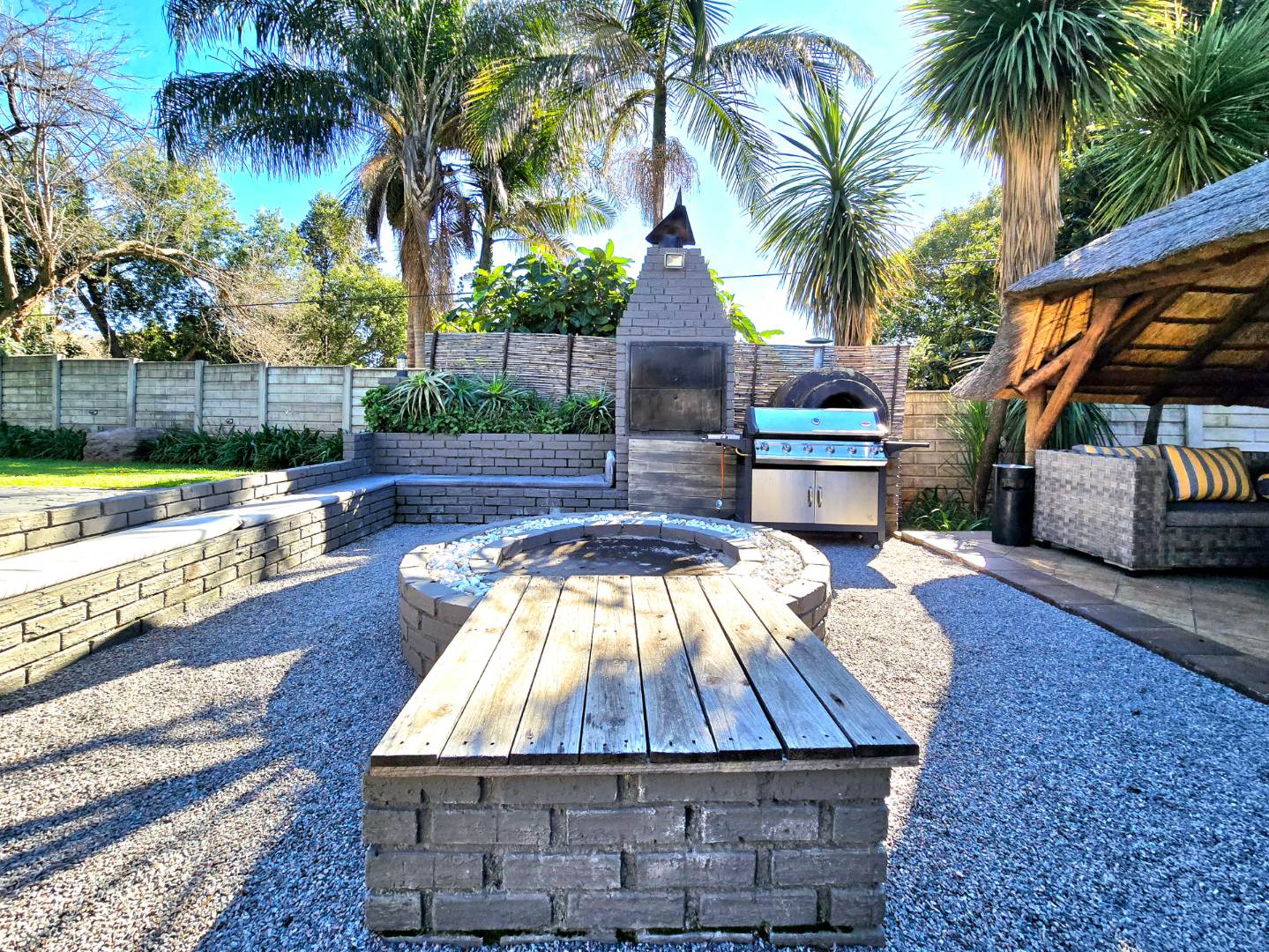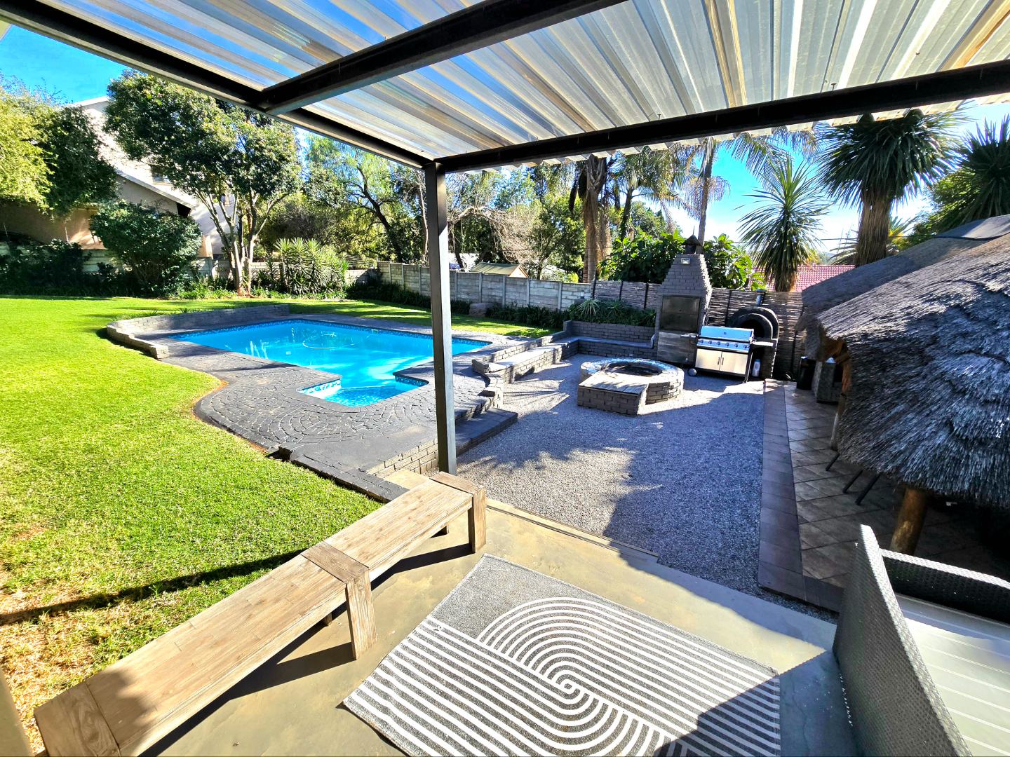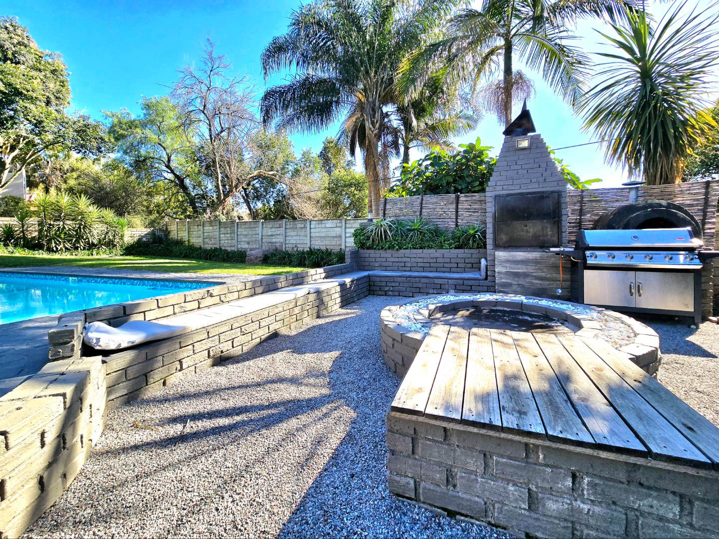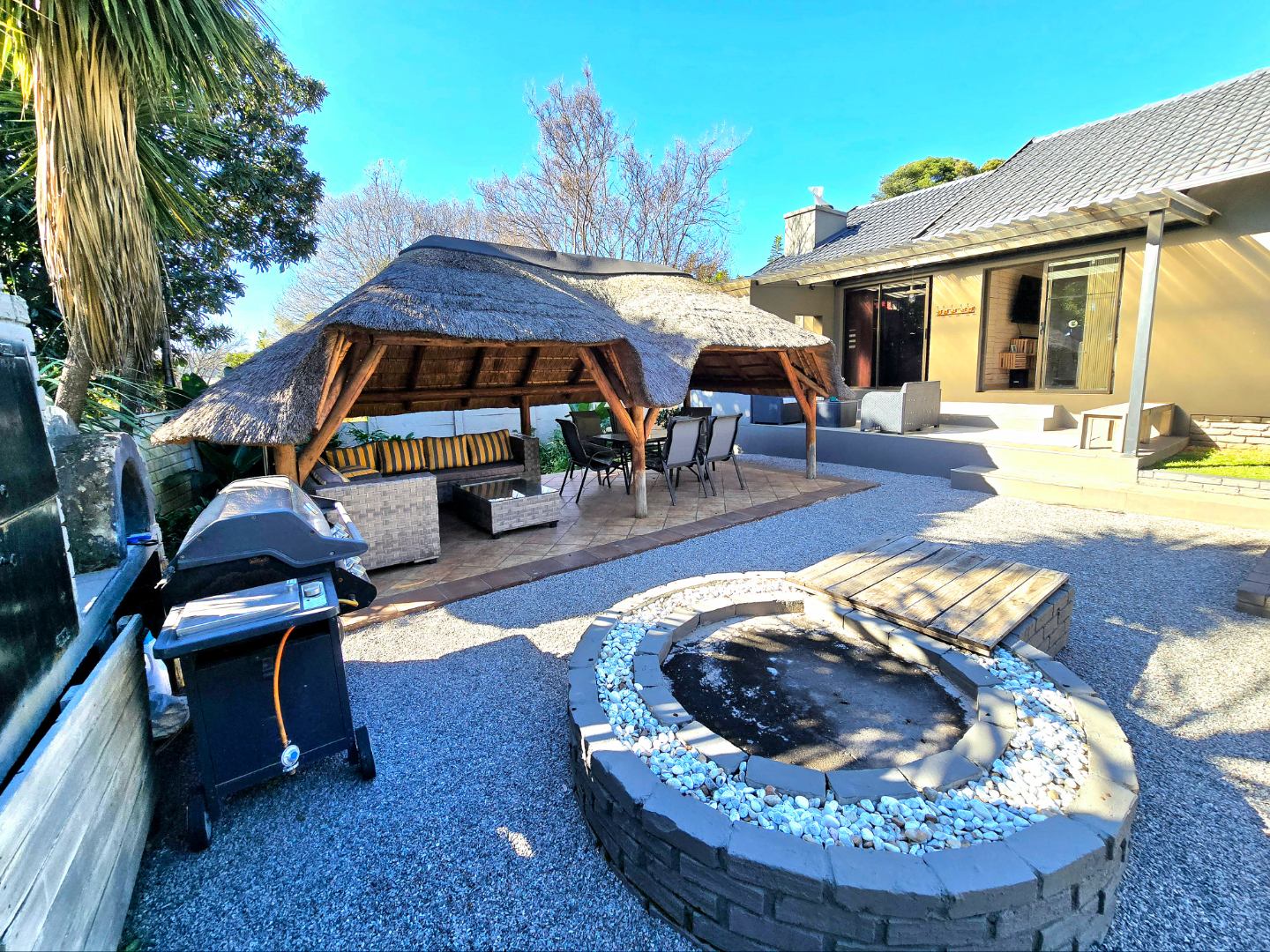 Now for the fun part, this home was made for entertaining. Inside, there’s a great bar area and built-in braai. Outside, things get even better: a lapa, pizza oven, second built-in braai, boma for those open-fire evenings, and even a guest toilet outside so everyone’s comfortable.