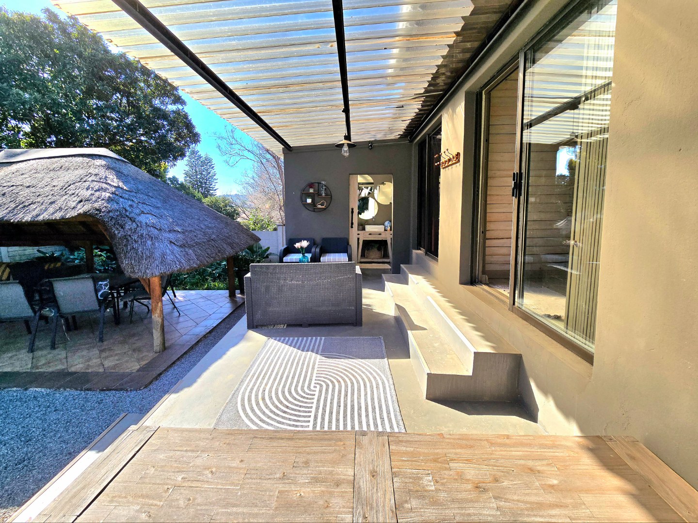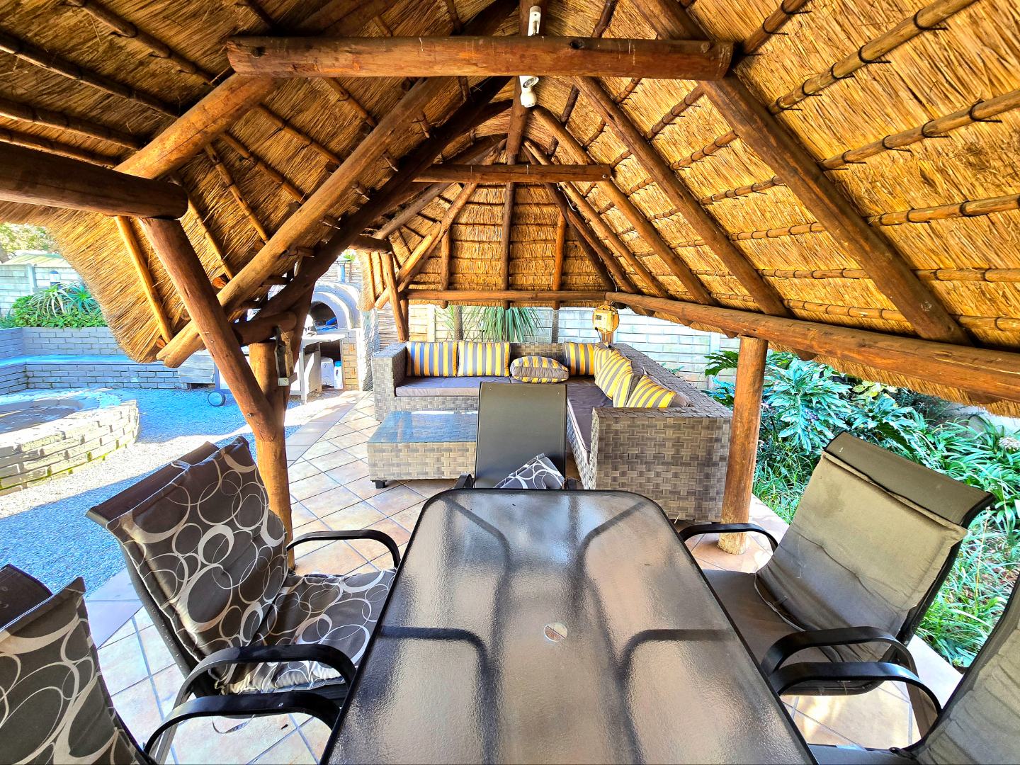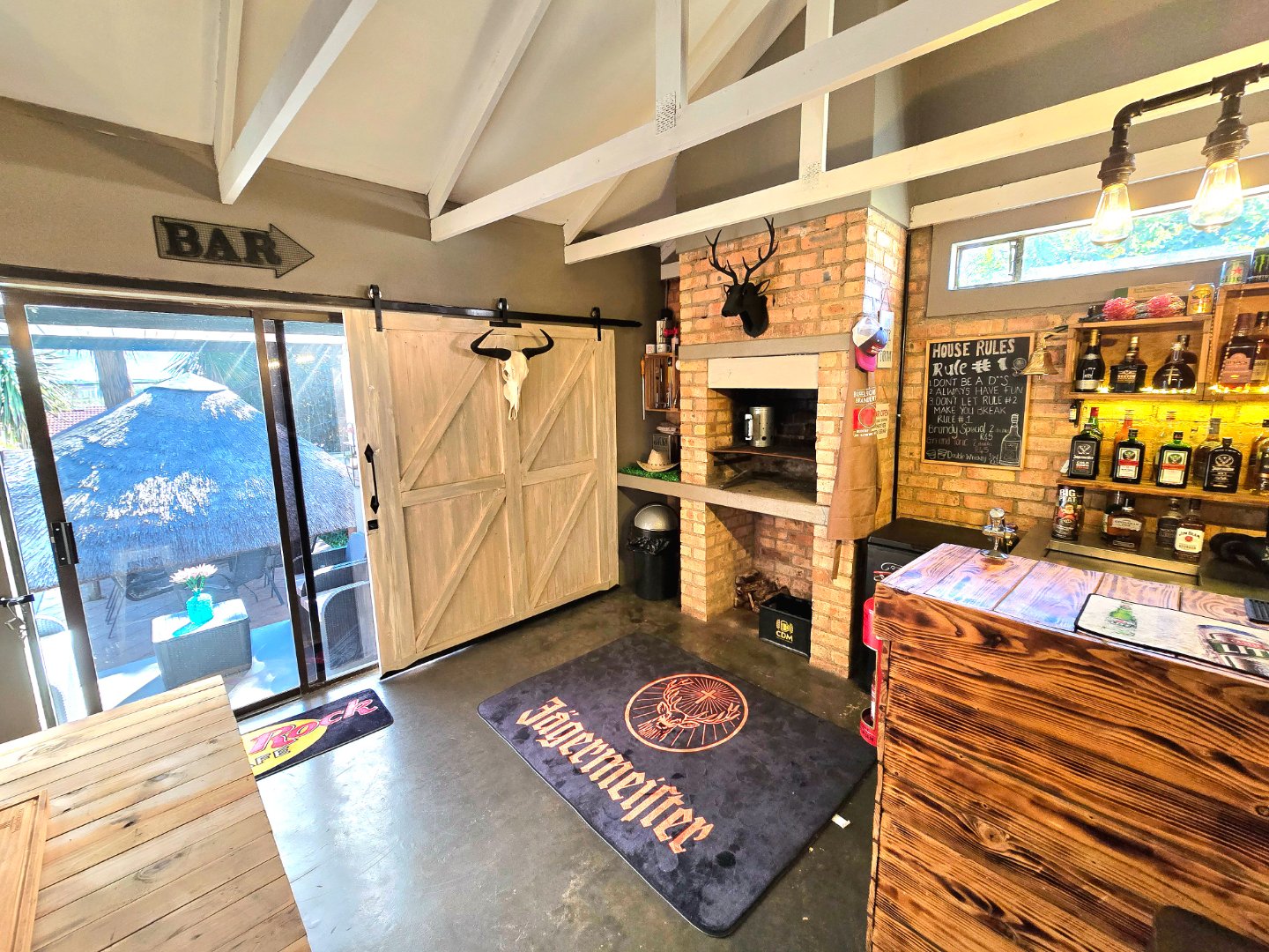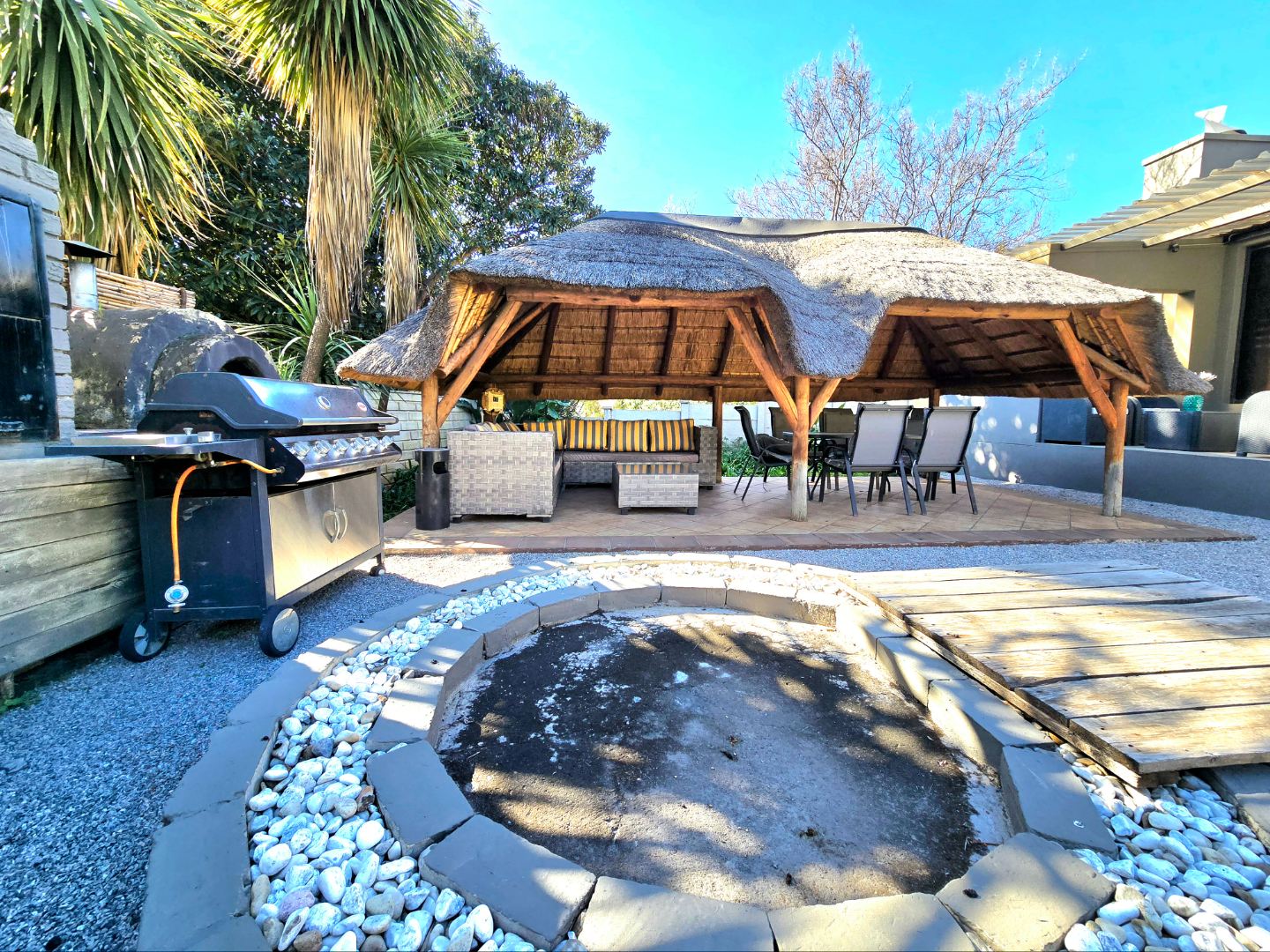 Now for the fun part, this home was made for entertaining. Inside, there’s a great bar area and built-in braai. Outside, things get even better: a lapa, pizza oven, second built-in braai, boma for those open-fire evenings, and even a guest toilet outside so everyone’s comfortable.