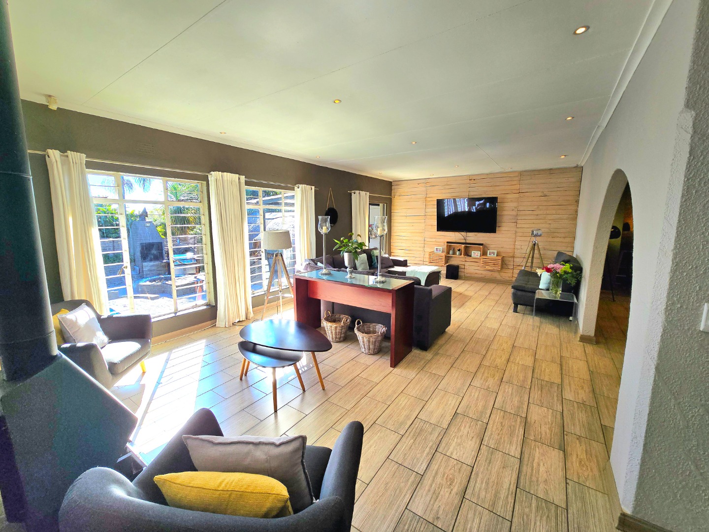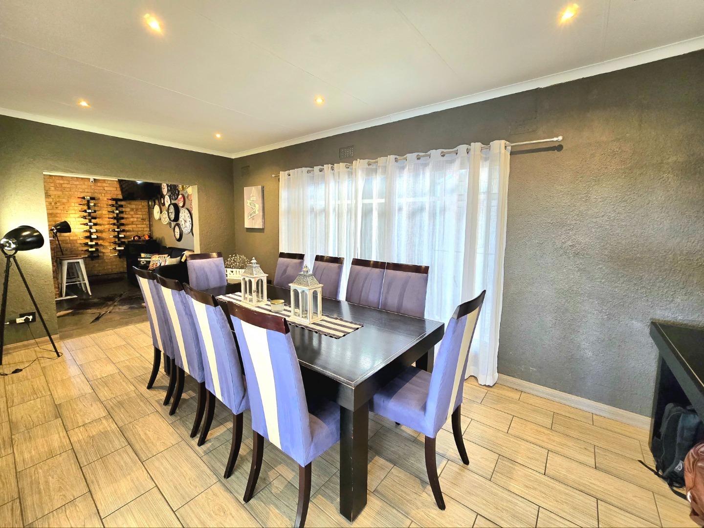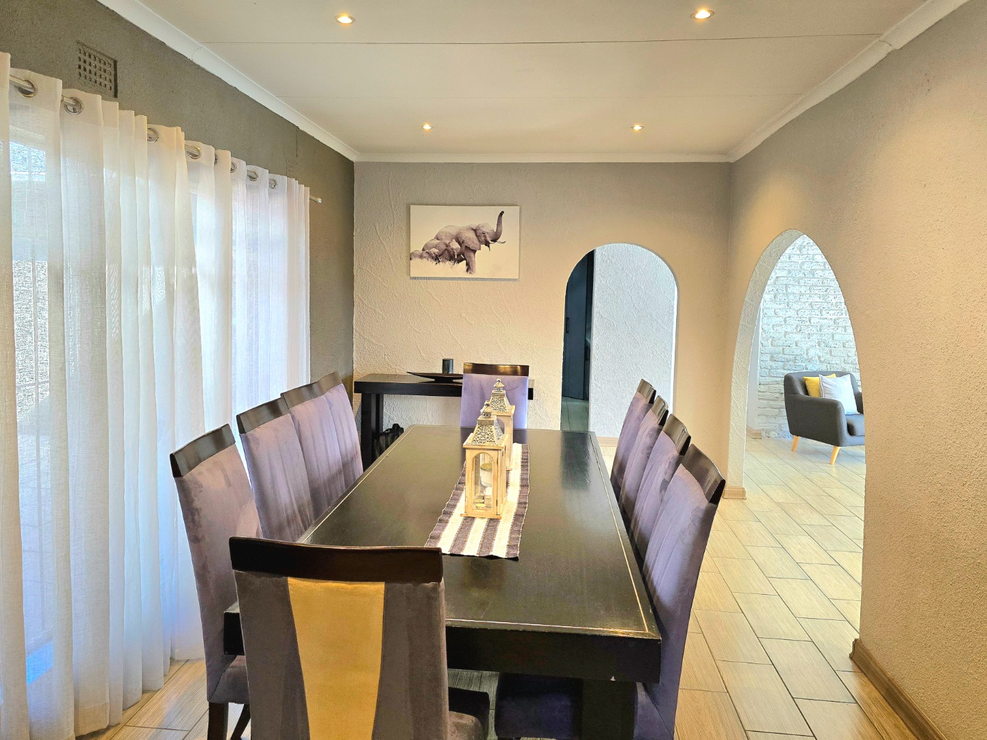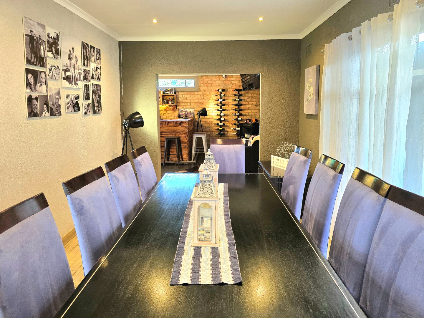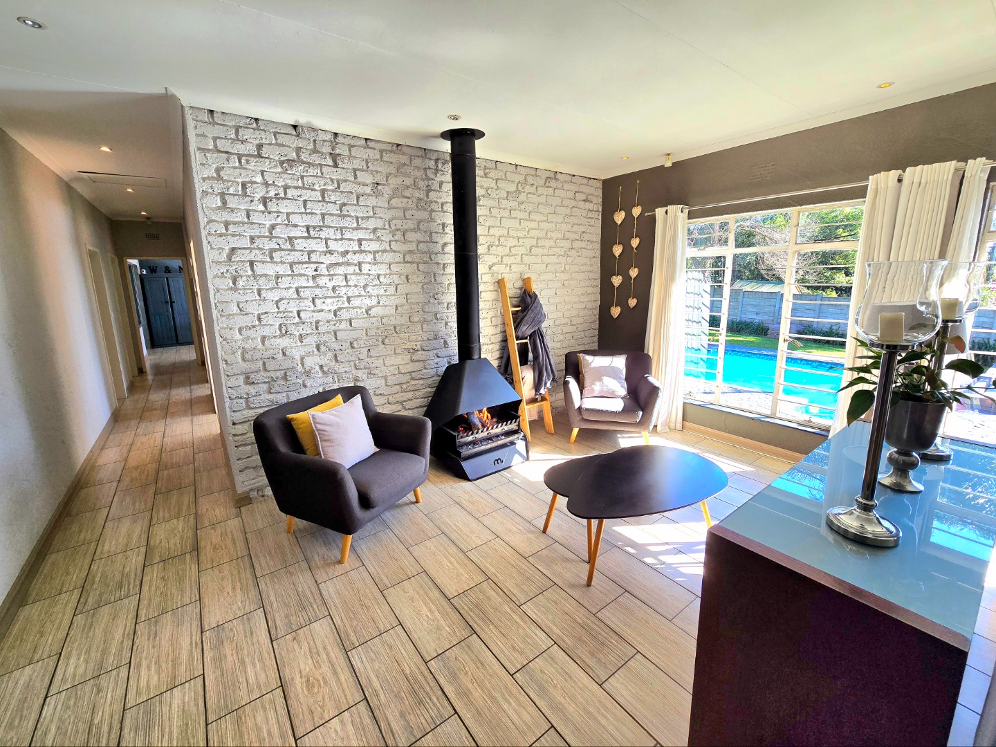 The lounge is warm and welcoming, with a built-in fireplace that’s perfect for those chilly Roodepoort winters. The dining area fits a 10-seater table comfortably, perfect for birthdays, Sunday lunches, or relaxed get-togethers.