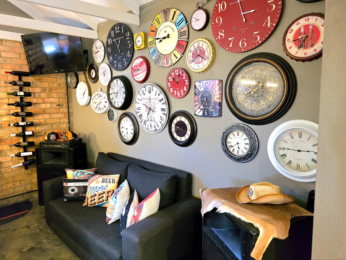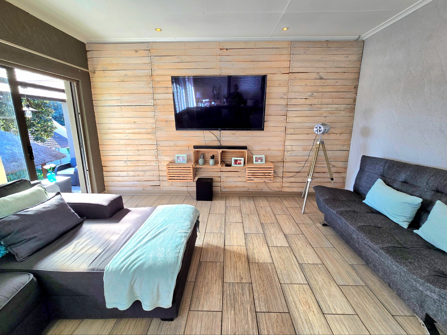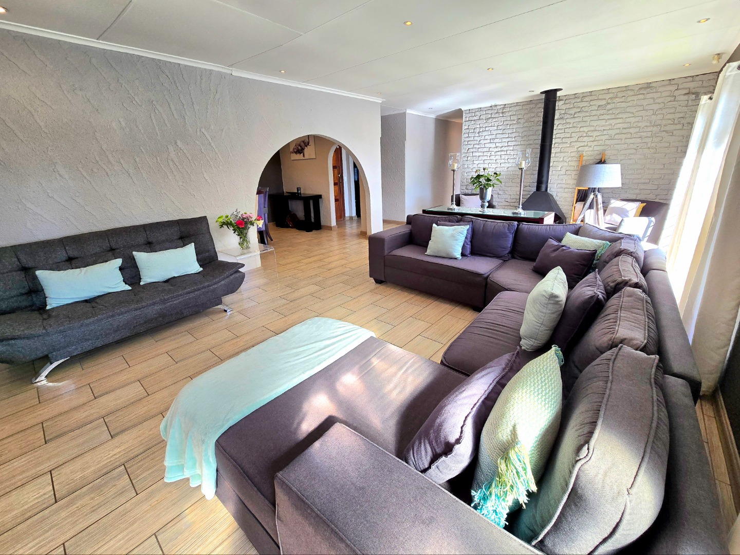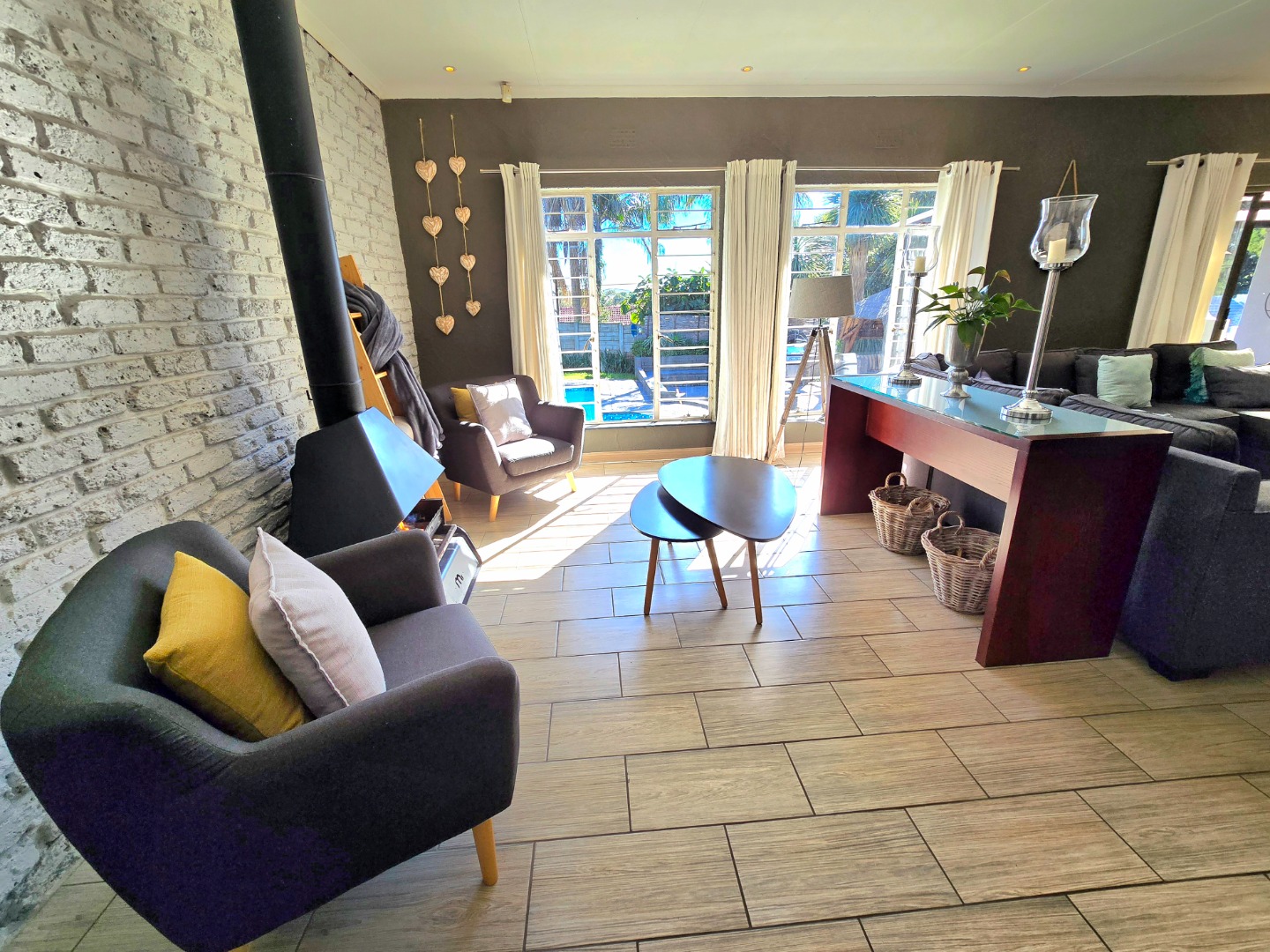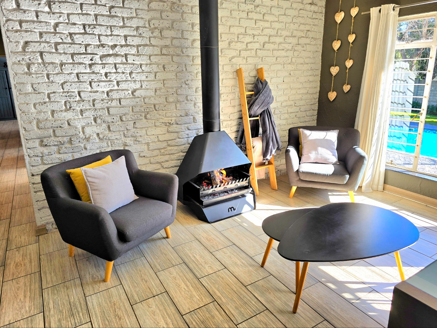 The lounge is warm and welcoming, with a built-in fireplace that’s perfect for those chilly Roodepoort winters. The dining area fits a 10-seater table comfortably, perfect for birthdays, Sunday lunches, or relaxed get-togethers.