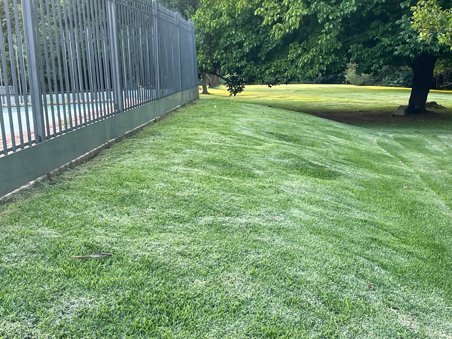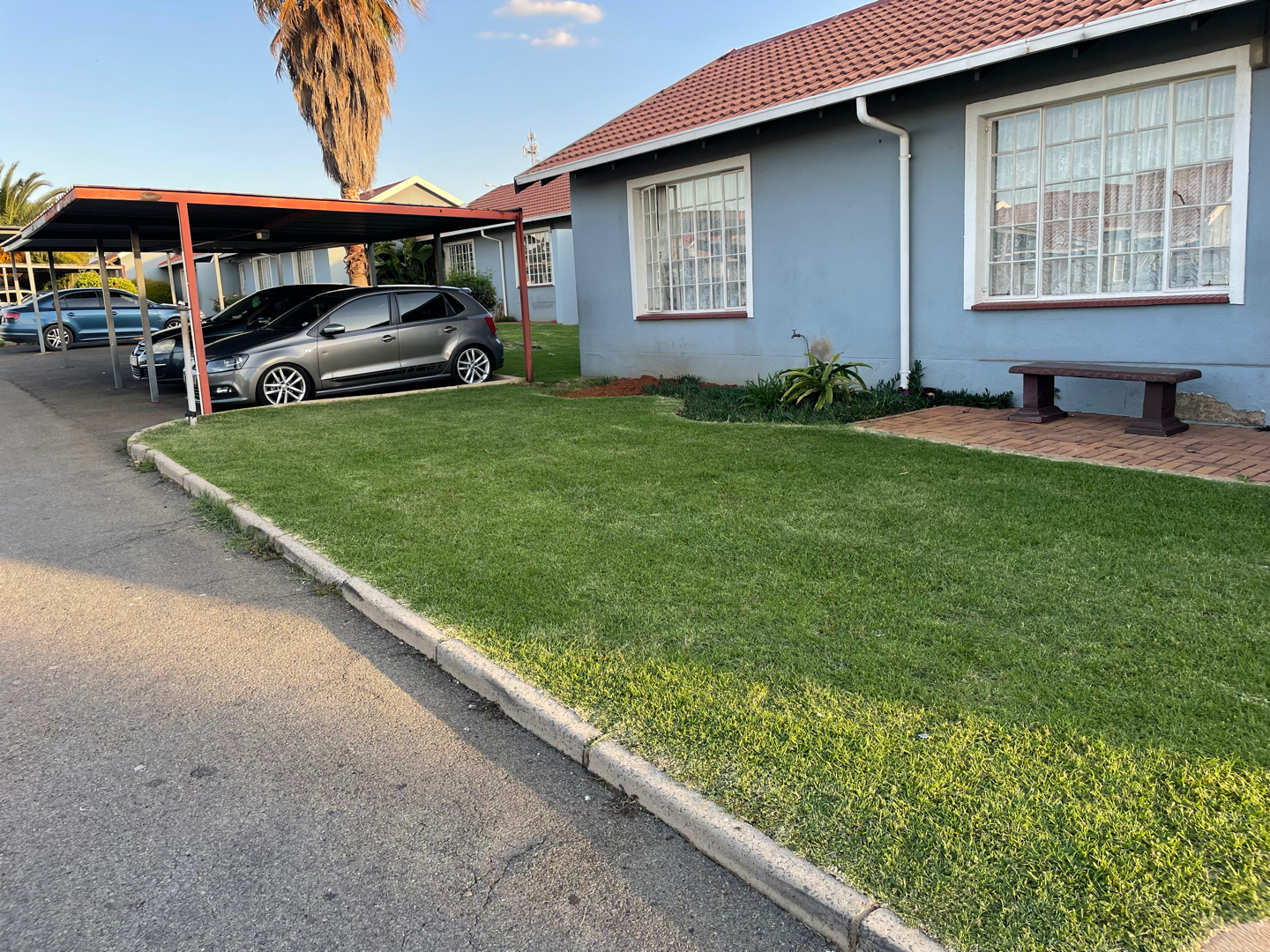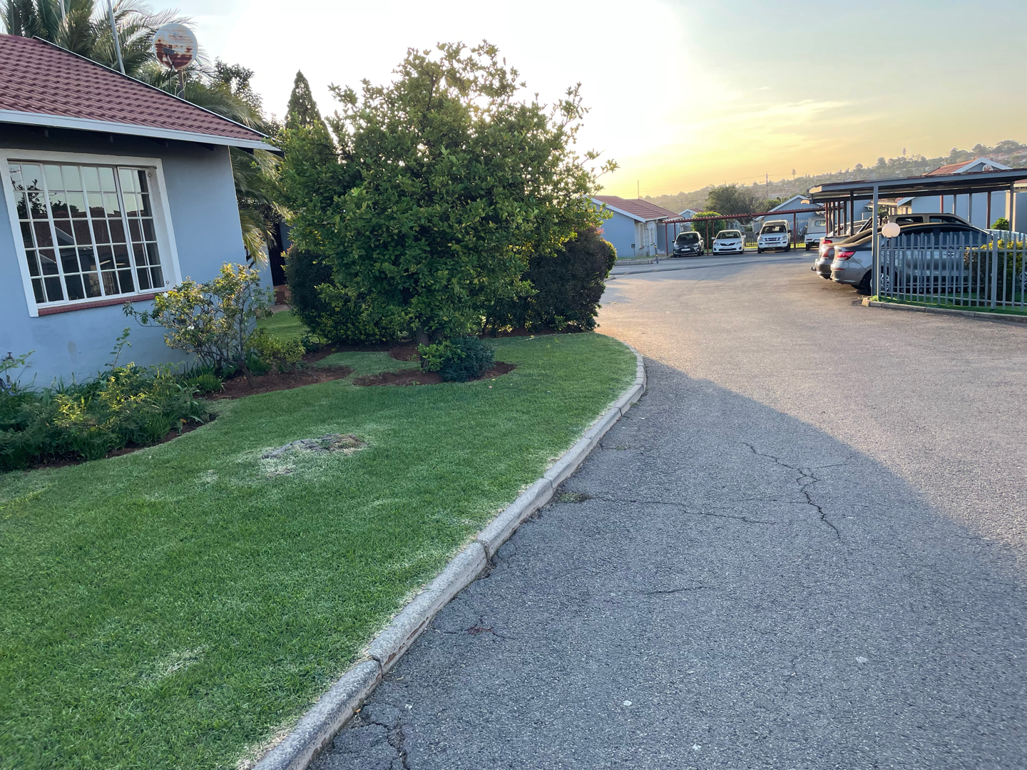 Step through the gate to a lush green lawn and neatly maintained driveways, surrounded by vibrant greenery.