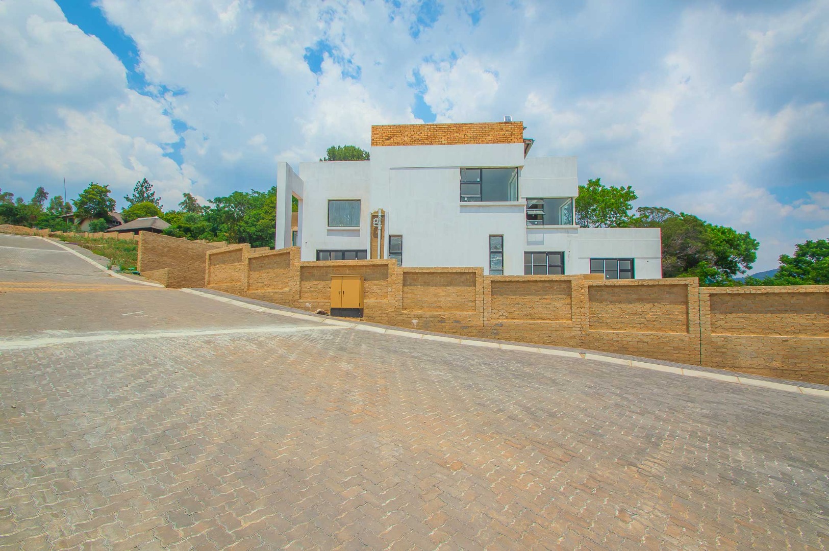 The exterior façade presents a striking modern design, characterized by clean lines, a pristine finish, and elegant brick accents. Large, strategically placed windows invite abundant natural light, framing potential panoramic vistas of the verdant, hilly landscape. While the outdoor spaces currently offer a blank canvas, they present an extraordinary opportunity to craft a bespoke garden oasis and a multi-level patio, perfect for al fresco gatherings and tranquil contemplation. The property's elevated position further enhances its commanding presence and potential for breathtaking views.