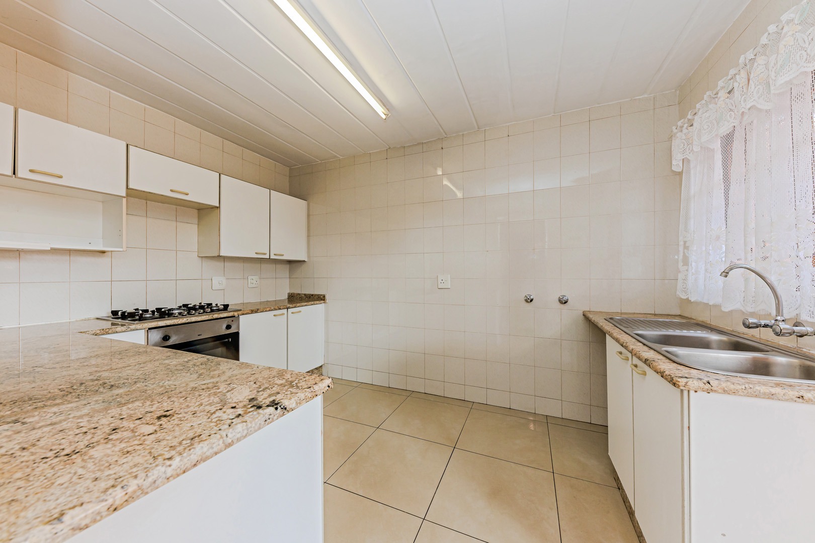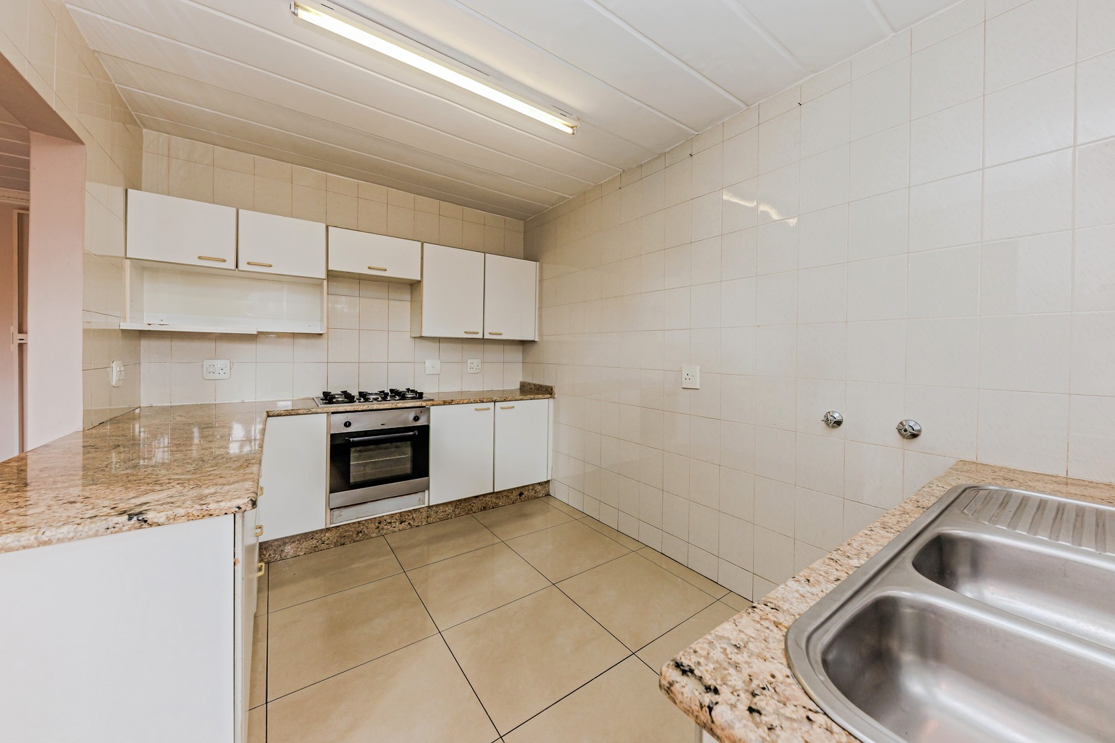 Inside, the home boasts light-filled open-plan living areas that flow seamlessly, enhanced by clean tiled flooring throughout, neutral wall tones, and decorative ceiling cornices. The kitchen is well equipped with white cabinetry, speckled granite countertops, a built-in oven with gas hob, a double stainless steel sink, and tiled walls for easy maintenance.