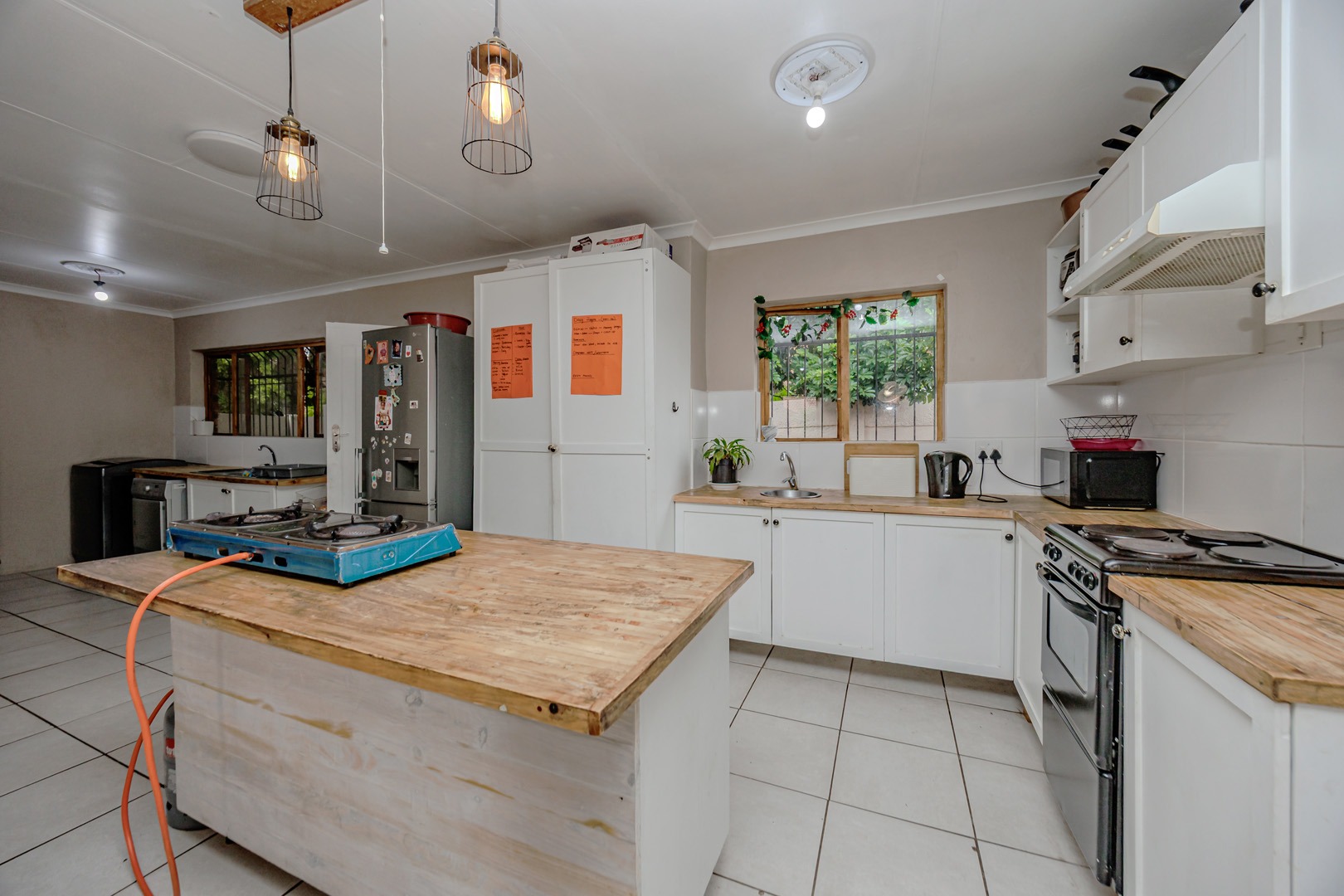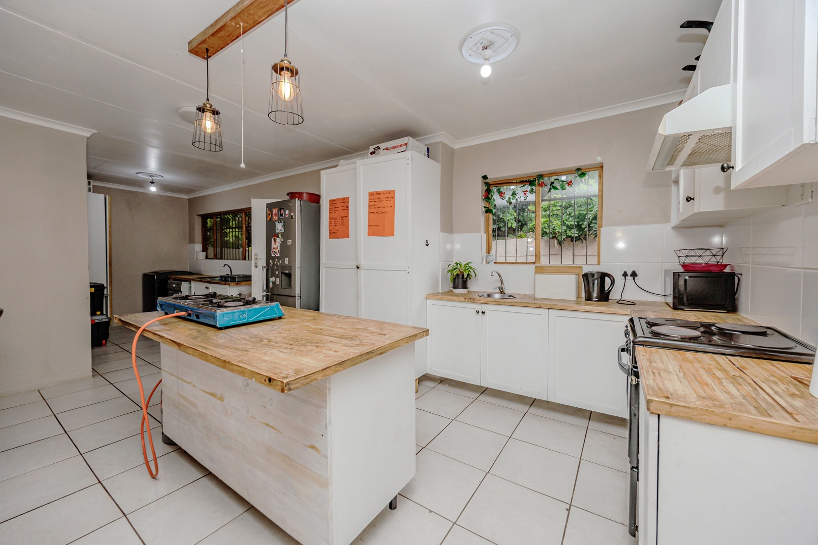 The interior boasts an open-plan layout, seamlessly connecting the kitchen and living areas. The kitchen is equipped with ample white cabinetry, practical wooden countertops, and tiled flooring throughout, ensuring easy maintenance. Natural light fills the space, highlighting the functional design, which includes a central island and provisions for both electric and portable gas cooking.