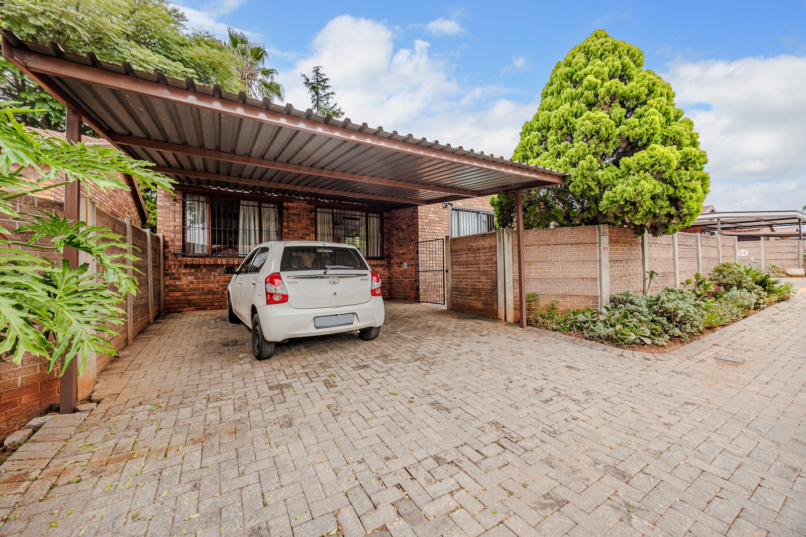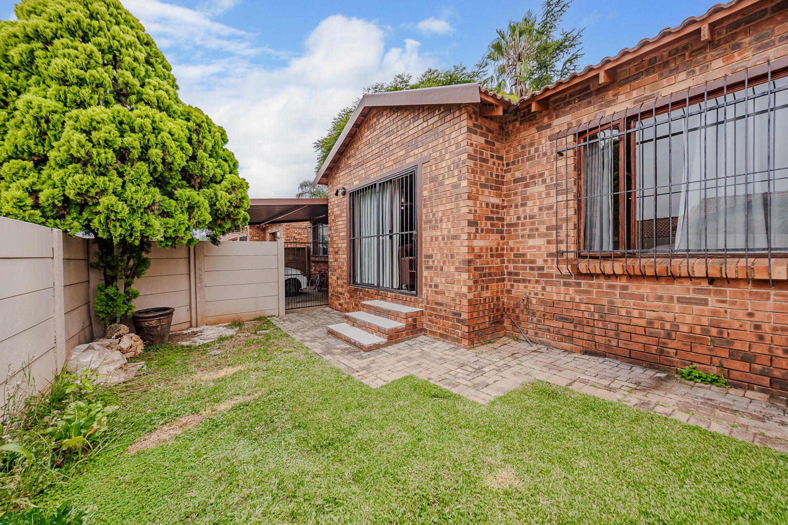 Step outside to a private, fenced yard featuring a small lawn and a paved patio area, ideal for relaxation or outdoor dining. Covered parking is available, adding to the practicality of this home. Weltevreden Park offers a suburban lifestyle with convenient access to local amenities and transport routes in Roodepoort, South Africa.