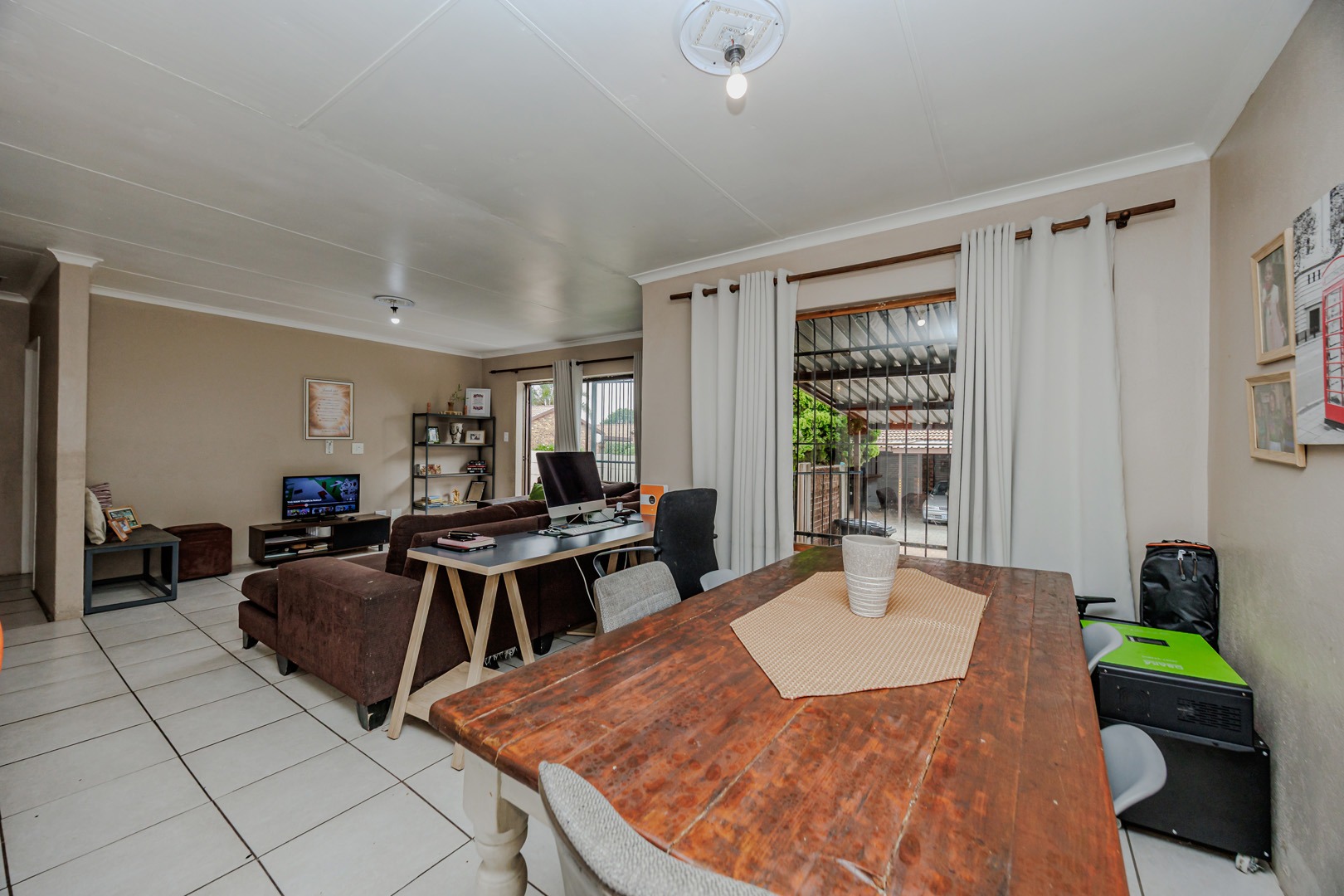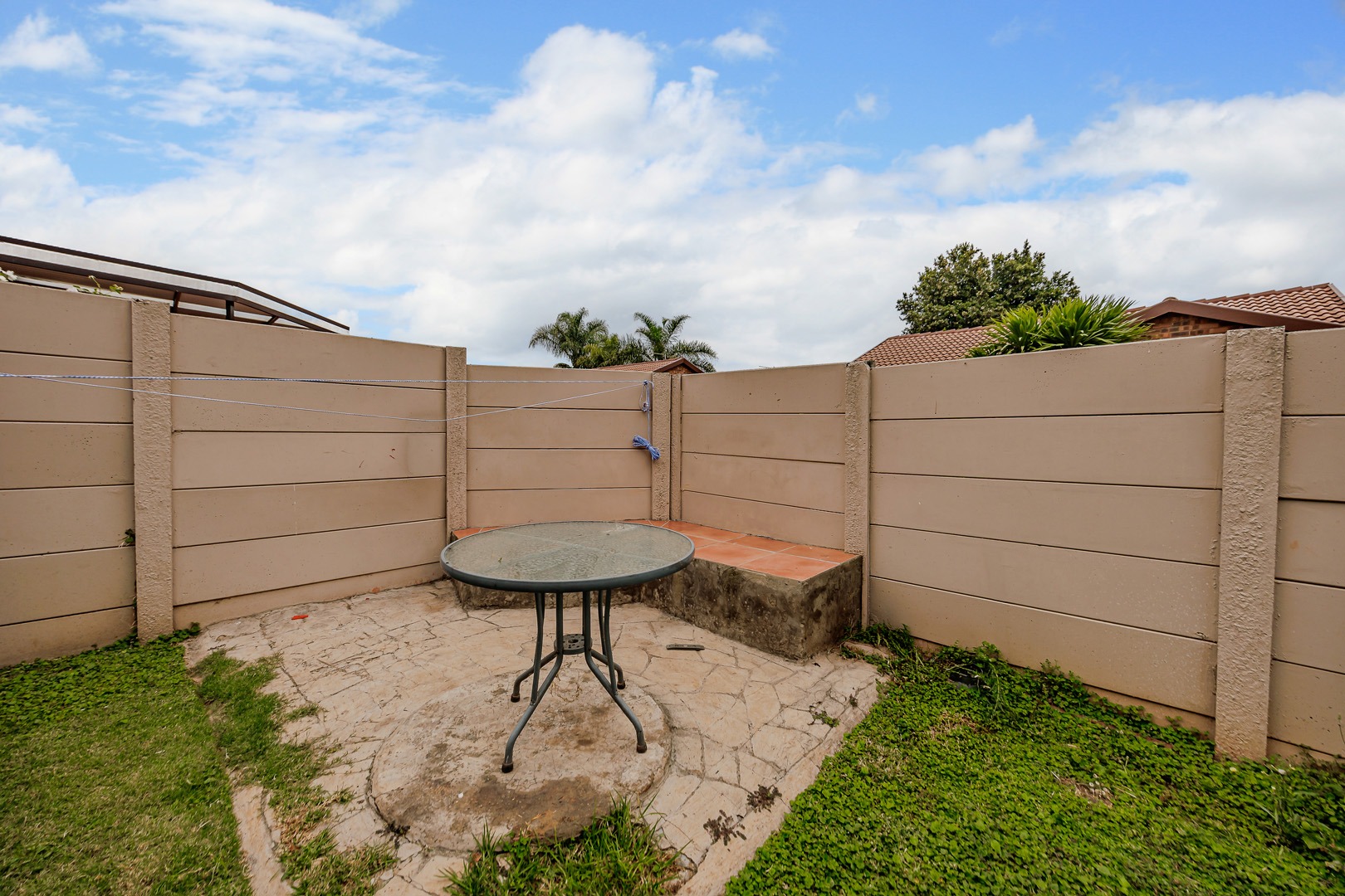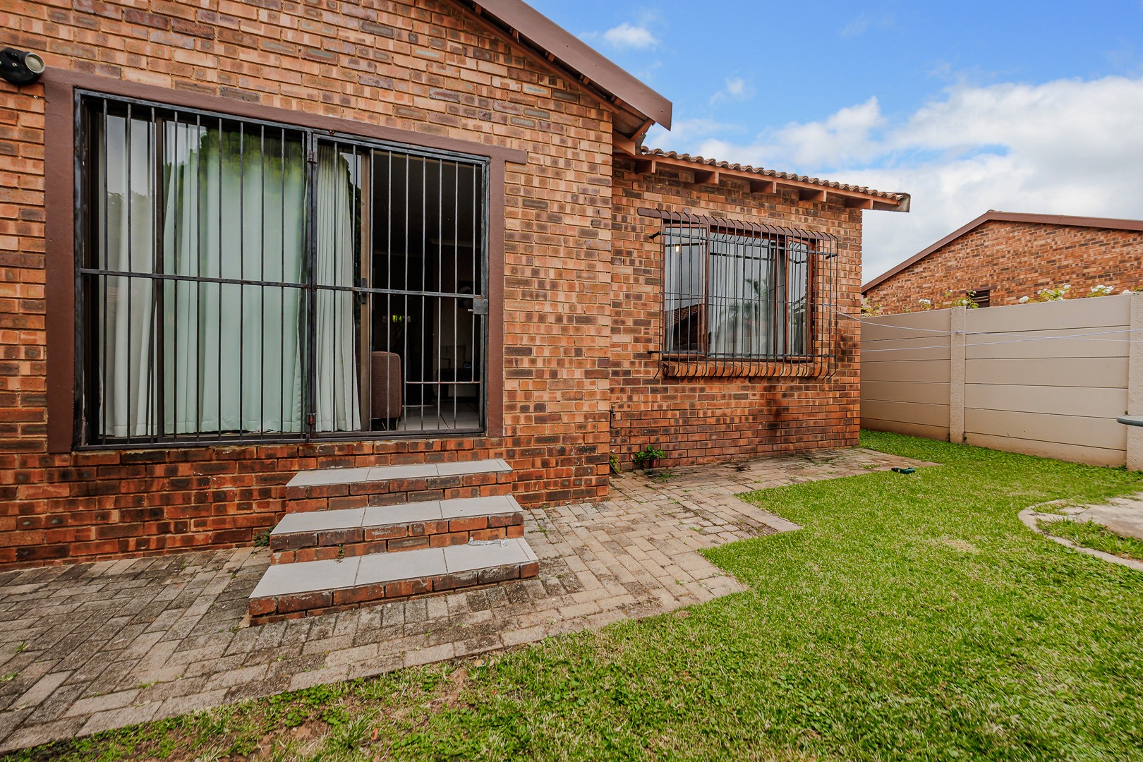 Step outside to a private, fenced yard featuring a small lawn and a paved patio area, ideal for relaxation or outdoor dining. Covered parking is available, adding to the practicality of this home. Weltevreden Park offers a suburban lifestyle with convenient access to local amenities and transport routes in Roodepoort, South Africa.