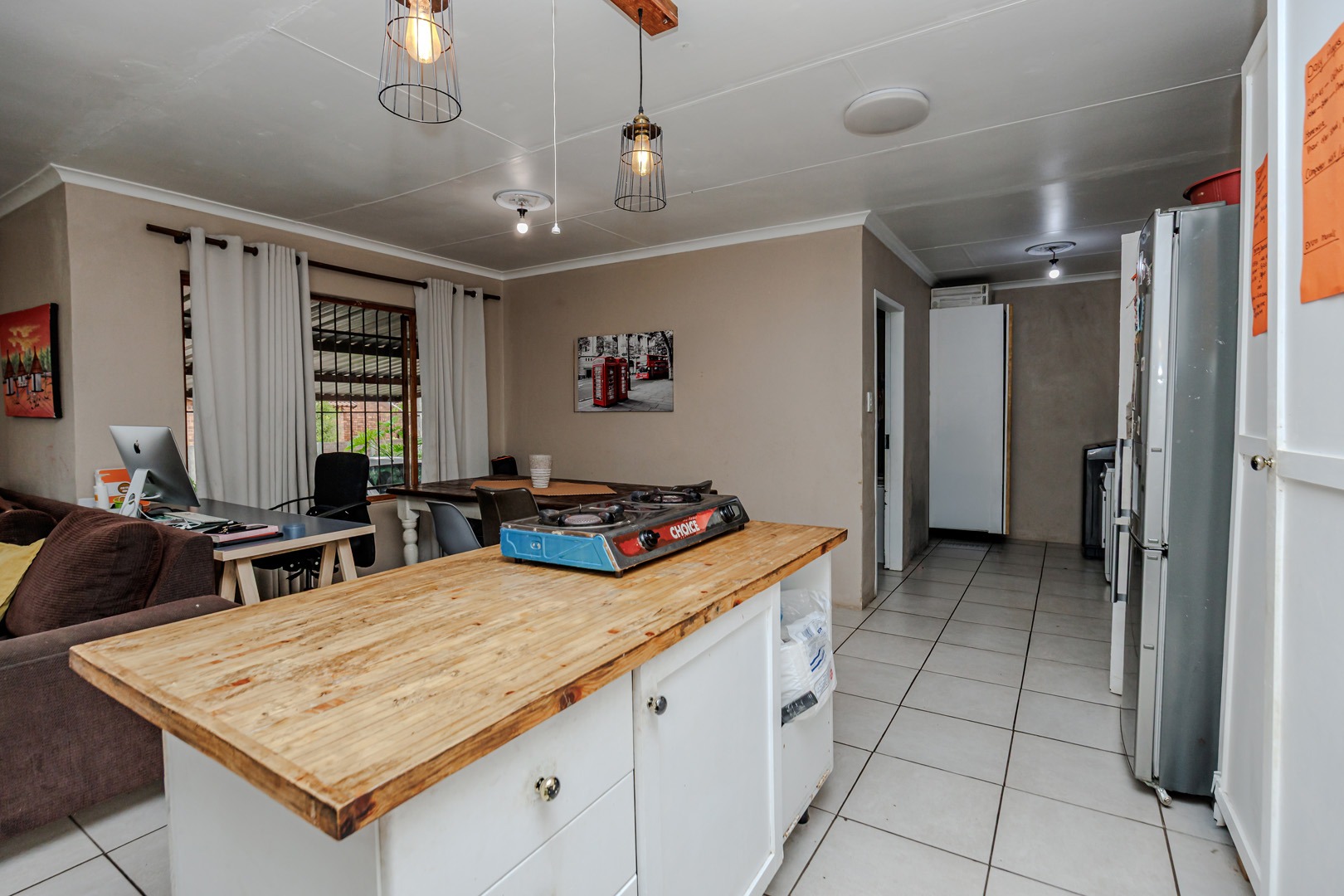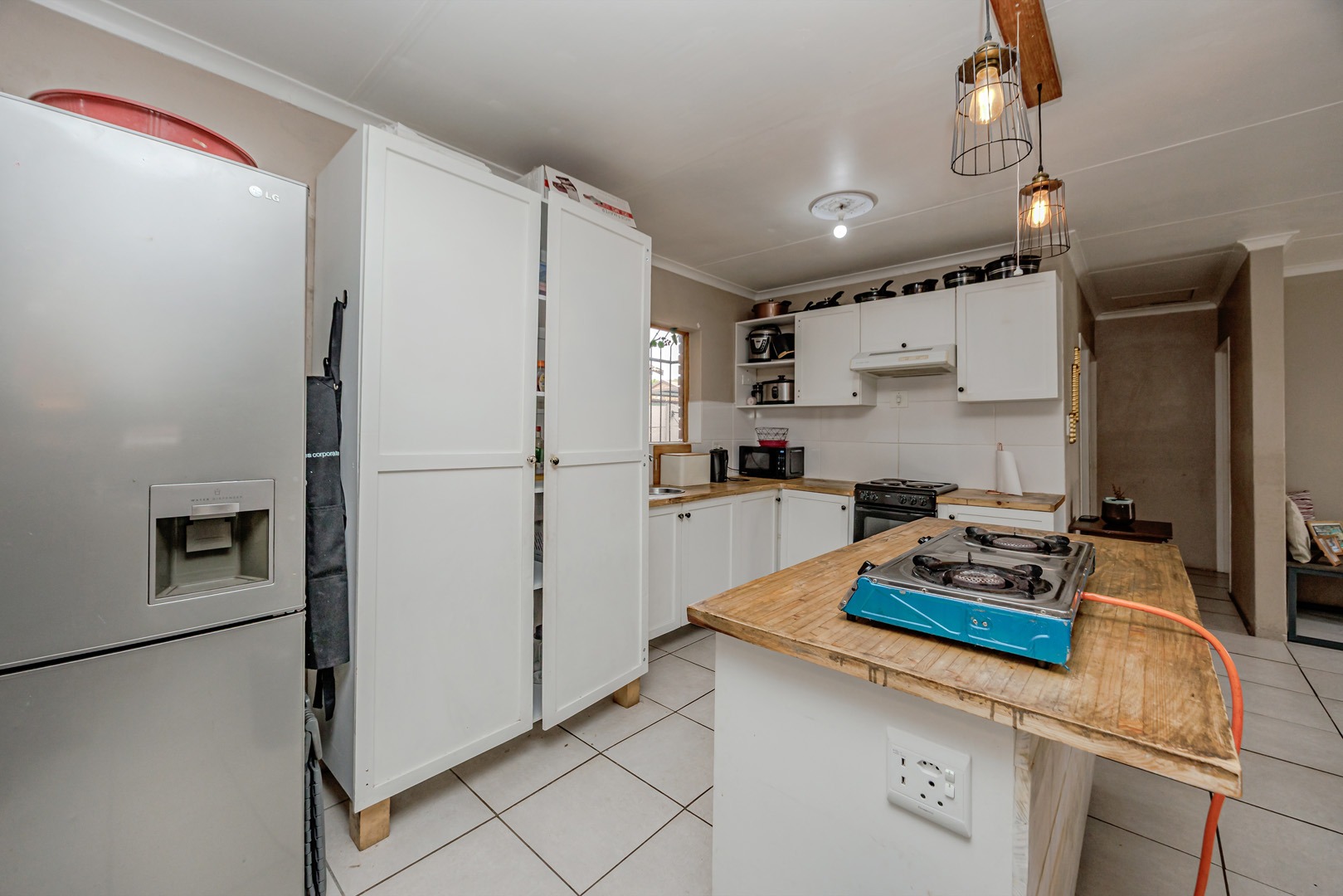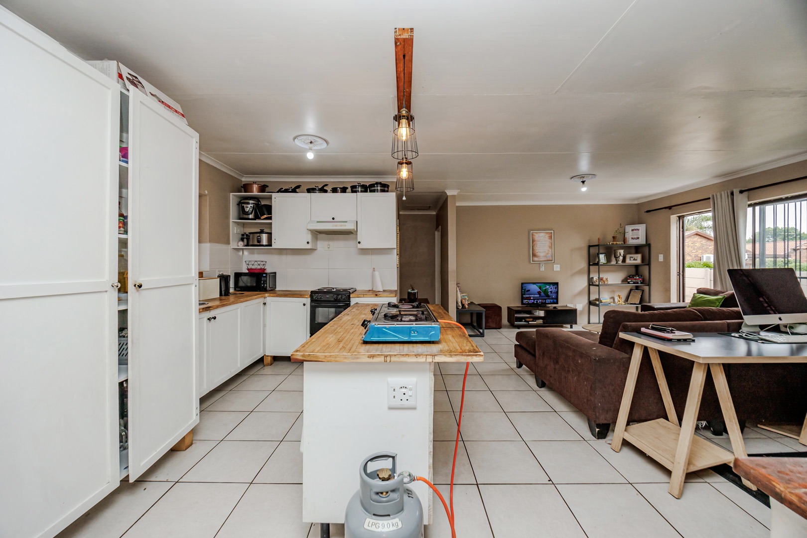 The interior boasts an open-plan layout, seamlessly connecting the kitchen and living areas. The kitchen is equipped with ample white cabinetry, practical wooden countertops, and tiled flooring throughout, ensuring easy maintenance. Natural light fills the space, highlighting the functional design, which includes a central island and provisions for both electric and portable gas cooking.