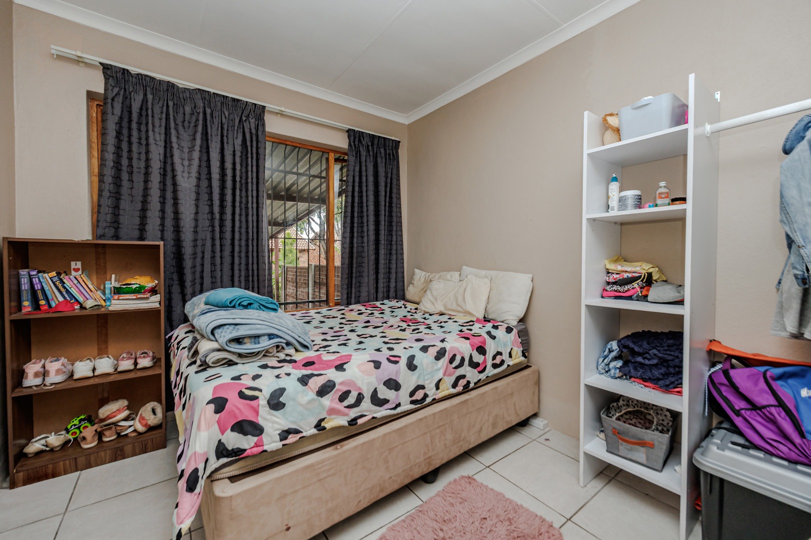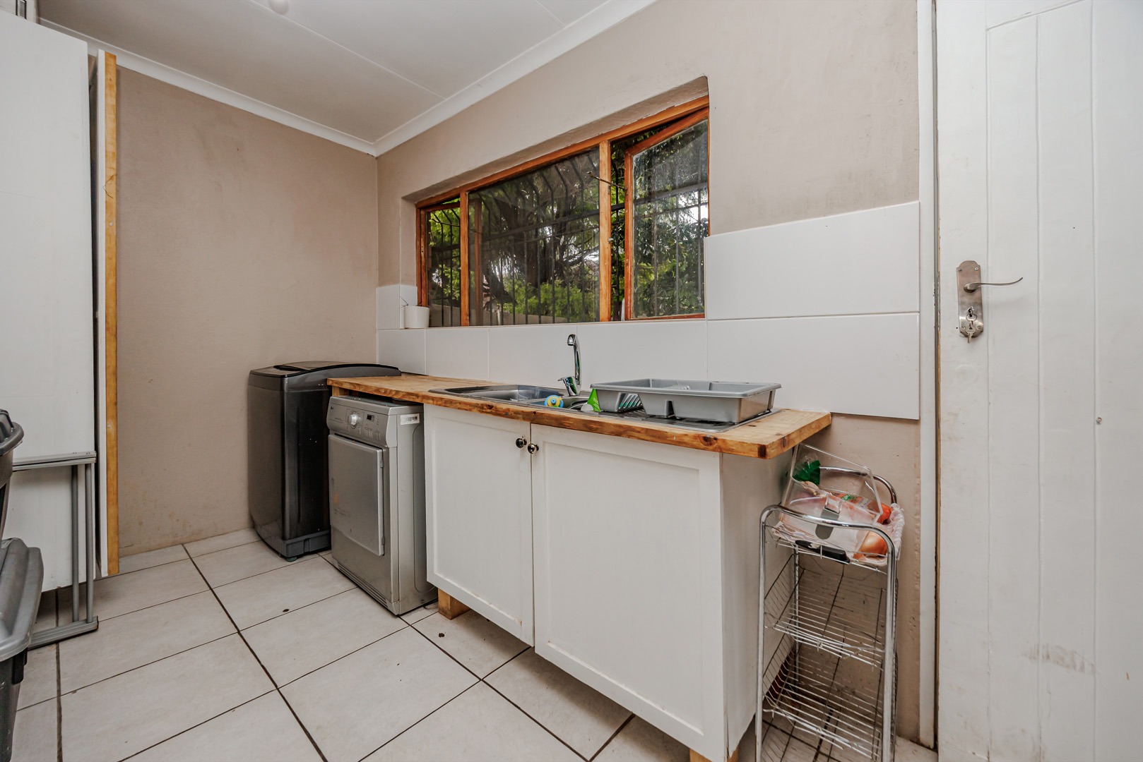 Each of the three bedrooms offers comfortable living, complemented by two well-appointed bathrooms. The property prioritises security with robust bars on windows and doors, providing peace of mind. A dedicated utility room offers additional convenience for laundry needs.