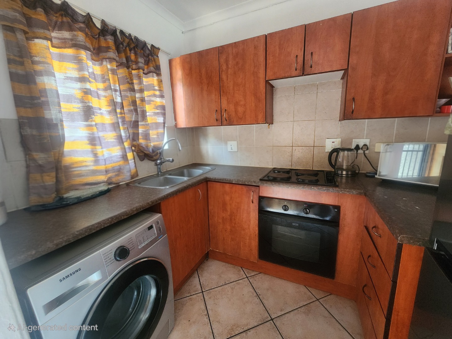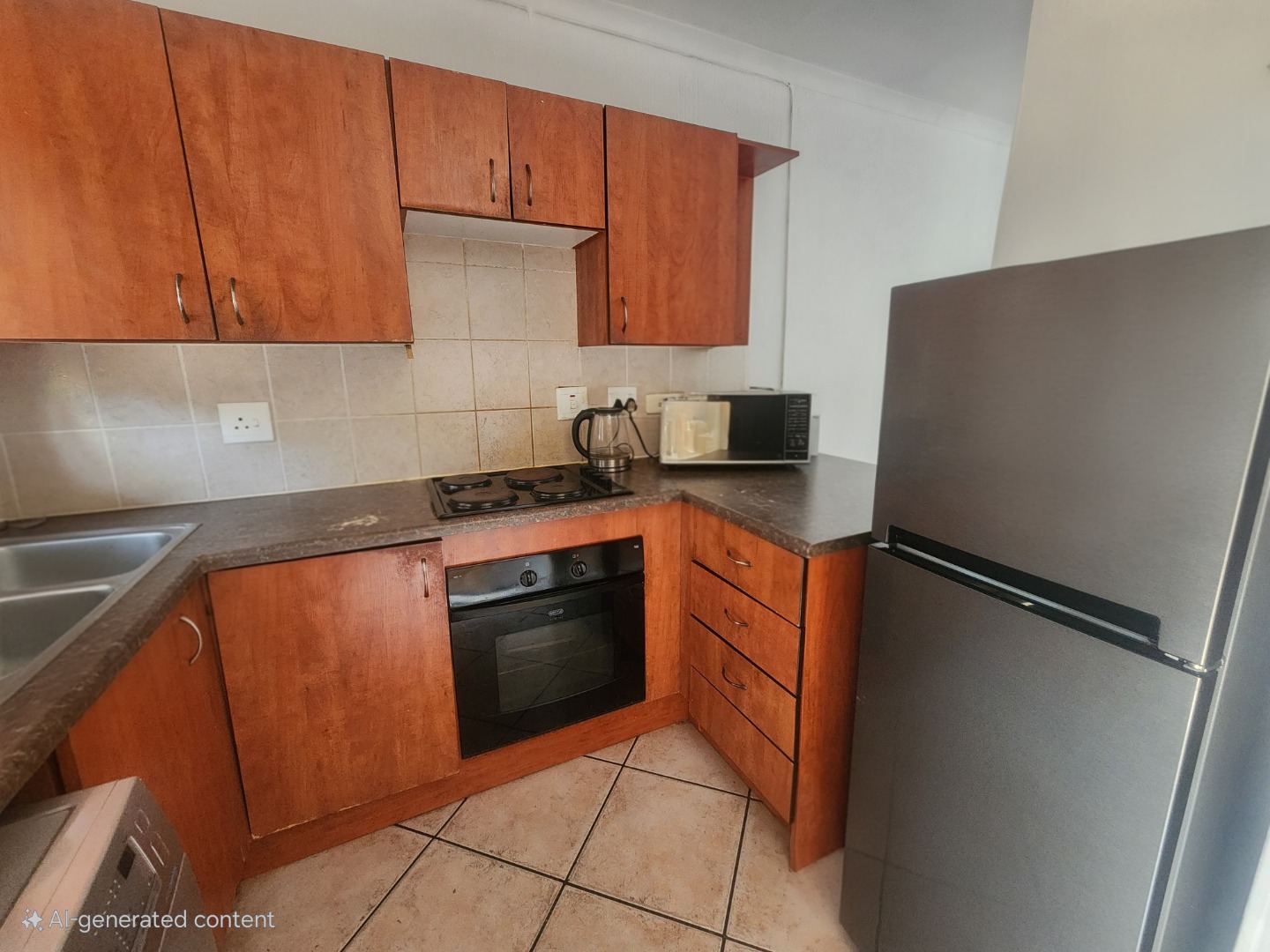 Step inside and you'll find a welcoming lounge area, brightened by natural light streaming through a sliding door. The durable tiled flooring throughout makes for easy living and cleaning. The kitchen is super functional, featuring wood-toned cabinetry, a built-in oven and hob, a double sink, and plenty of storage space — everything you need to whip up your favourite meals.