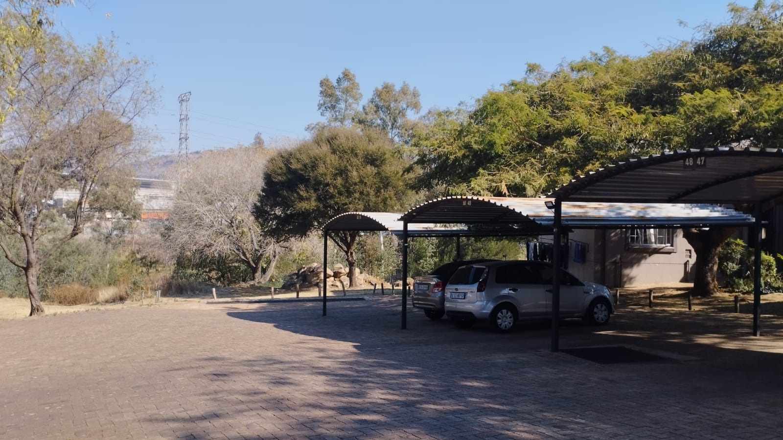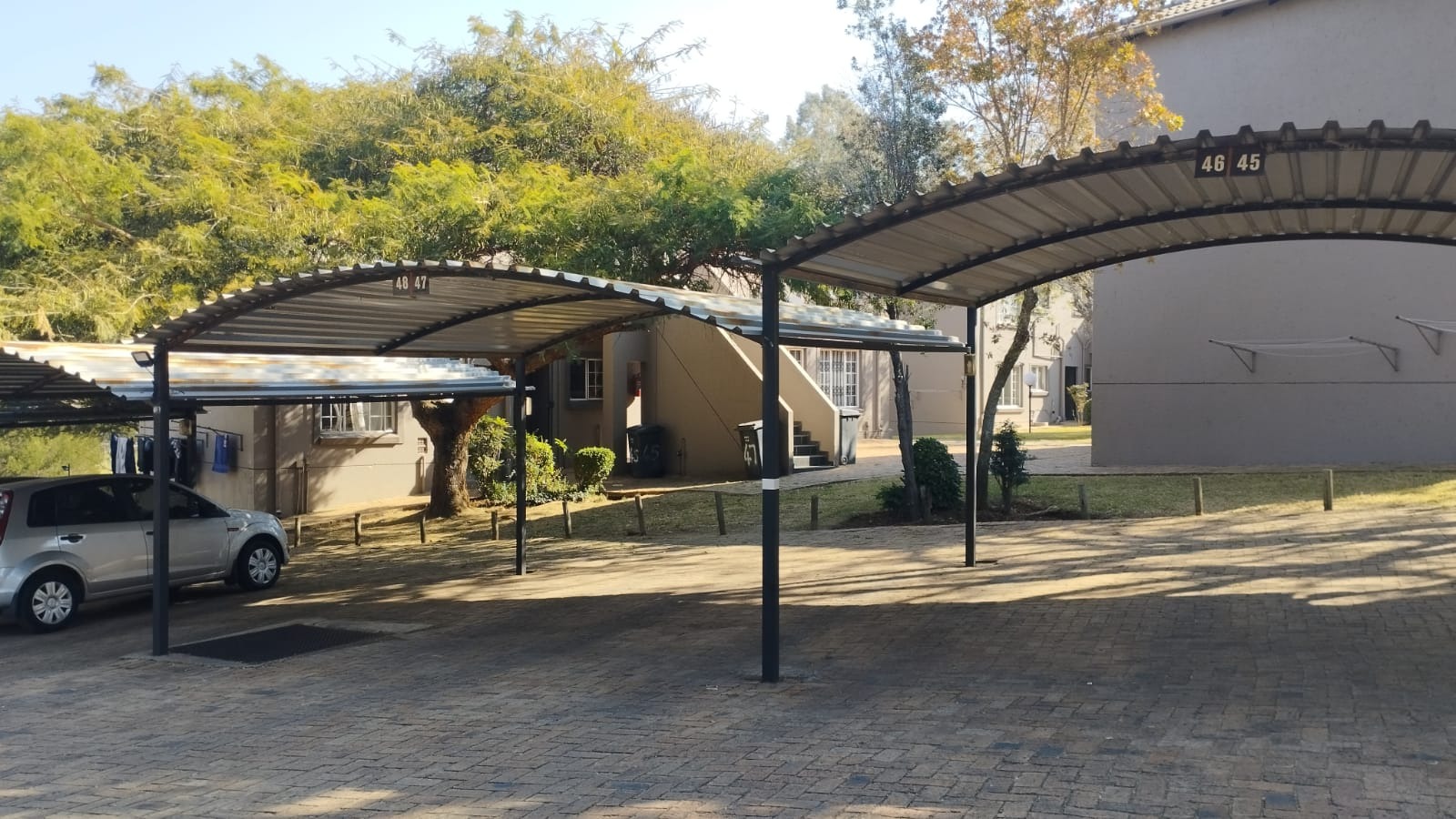 One covered parking spot and ample visitor's parking.