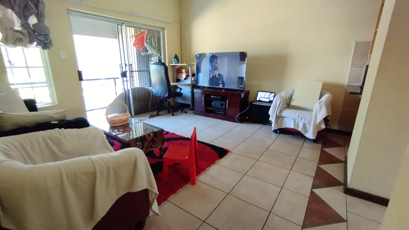 Open plan living room flowing onto a well-sized covered patio perfect for entertaining or quiet evening.