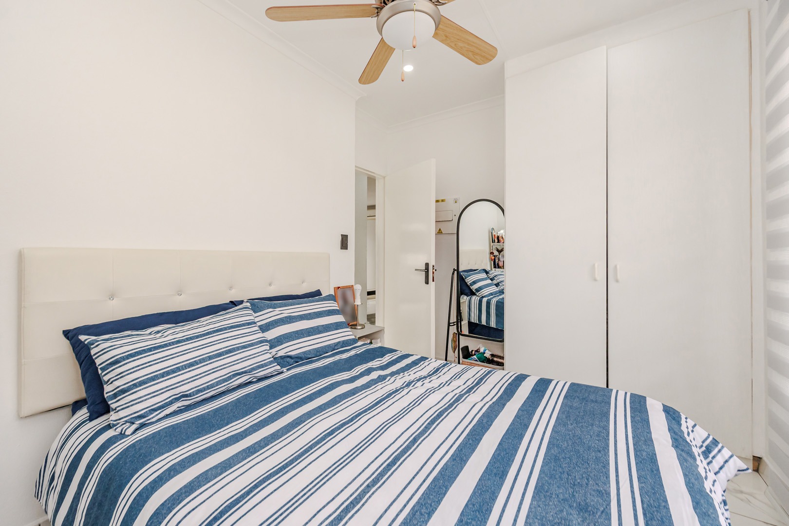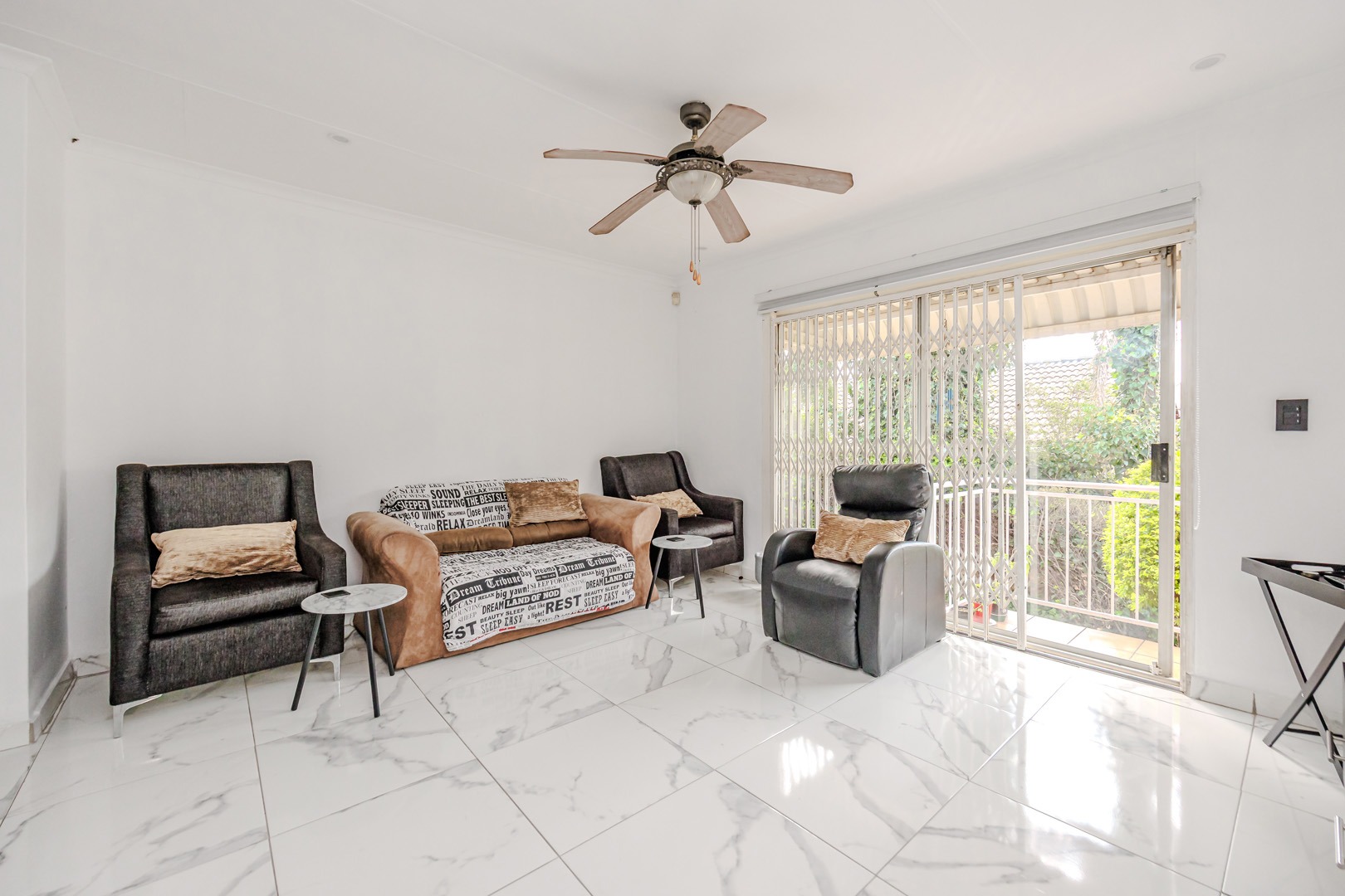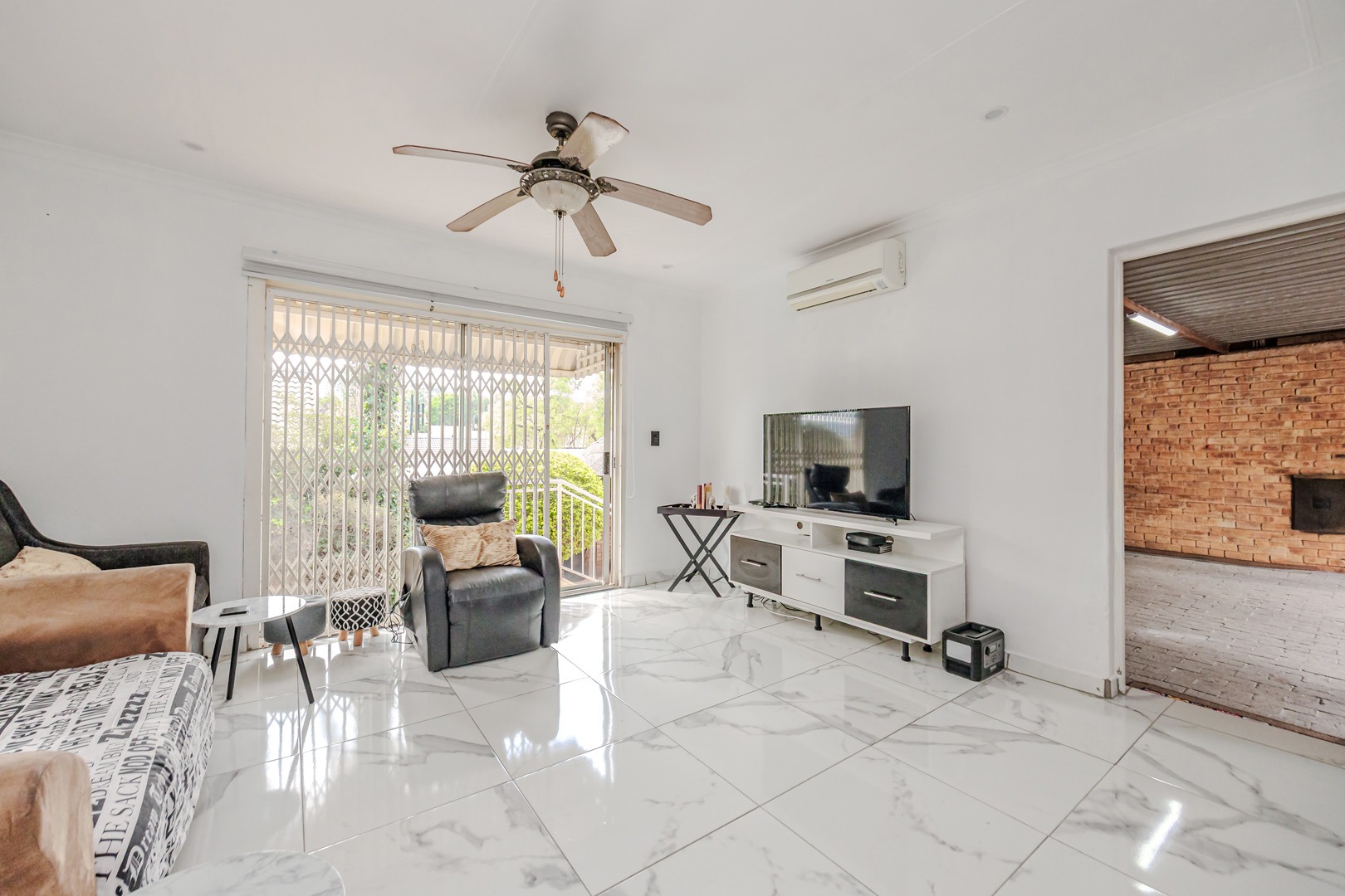 The spacious living area is designed for comfort, equipped with both a ceiling fan and an air conditioning unit to ensure a pleasant environment year-round. Natural light floods the space, enhanced by sliding glass doors that lead out to a private balcony or patio, perfect for relaxation or entertaining. The property offers two comfortable bedrooms and two well-appointed bathrooms, providing ample space for residents.
