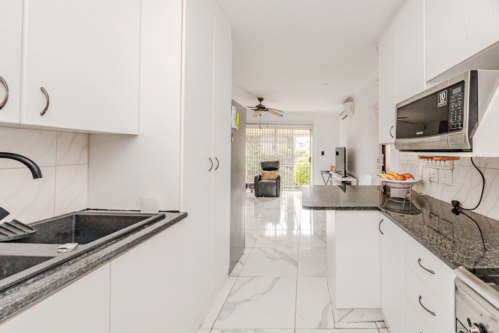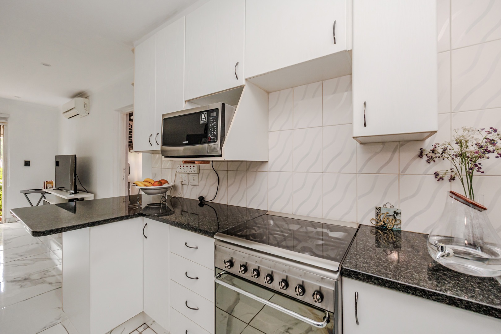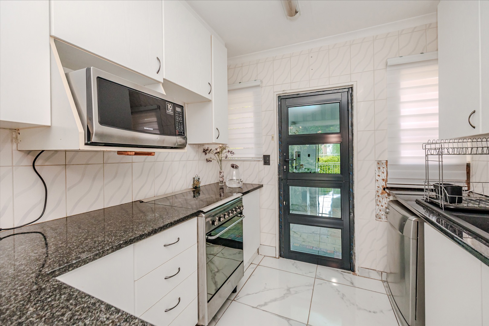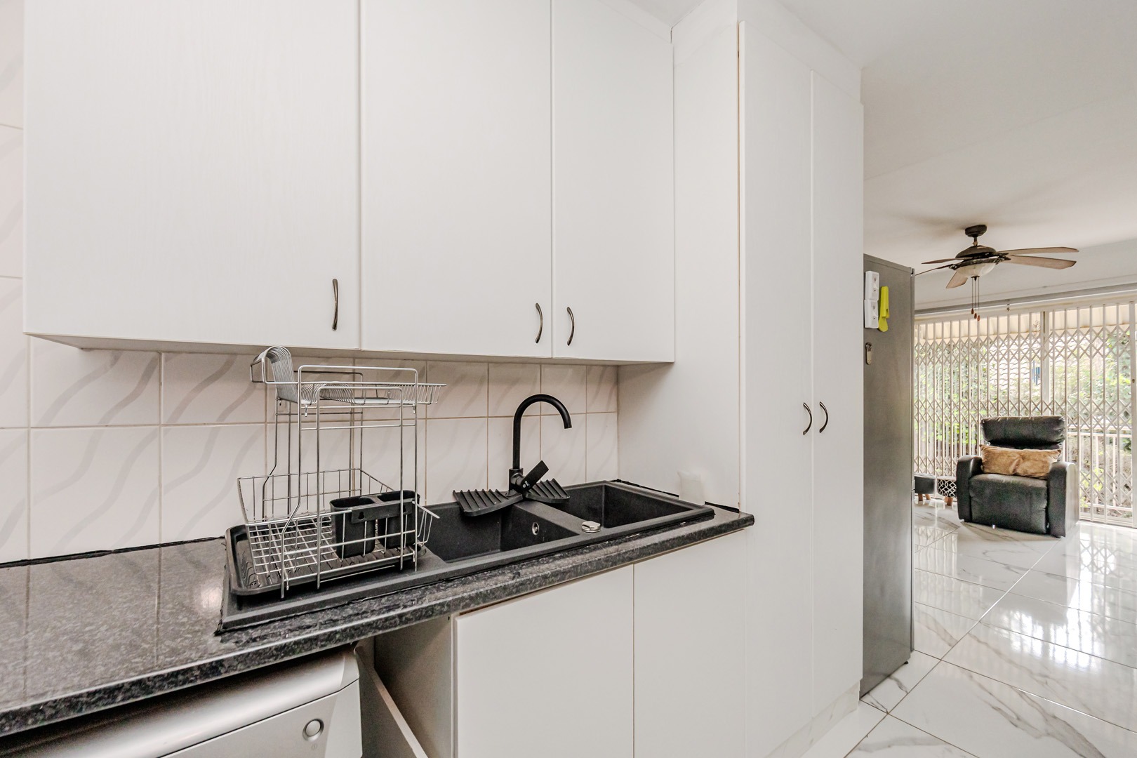 Discover modern living in this inviting 92 sqm residence located in the desirable suburban area of Wilgeheuwel, Roodepoort. This home features a contemporary open-plan layout, seamlessly connecting the kitchen and living areas. The kitchen boasts sleek white cabinetry, dark granite countertops, a black sink, and integrated appliances including a built-in oven and hob. White tiled flooring extends throughout, creating a bright and cohesive aesthetic.