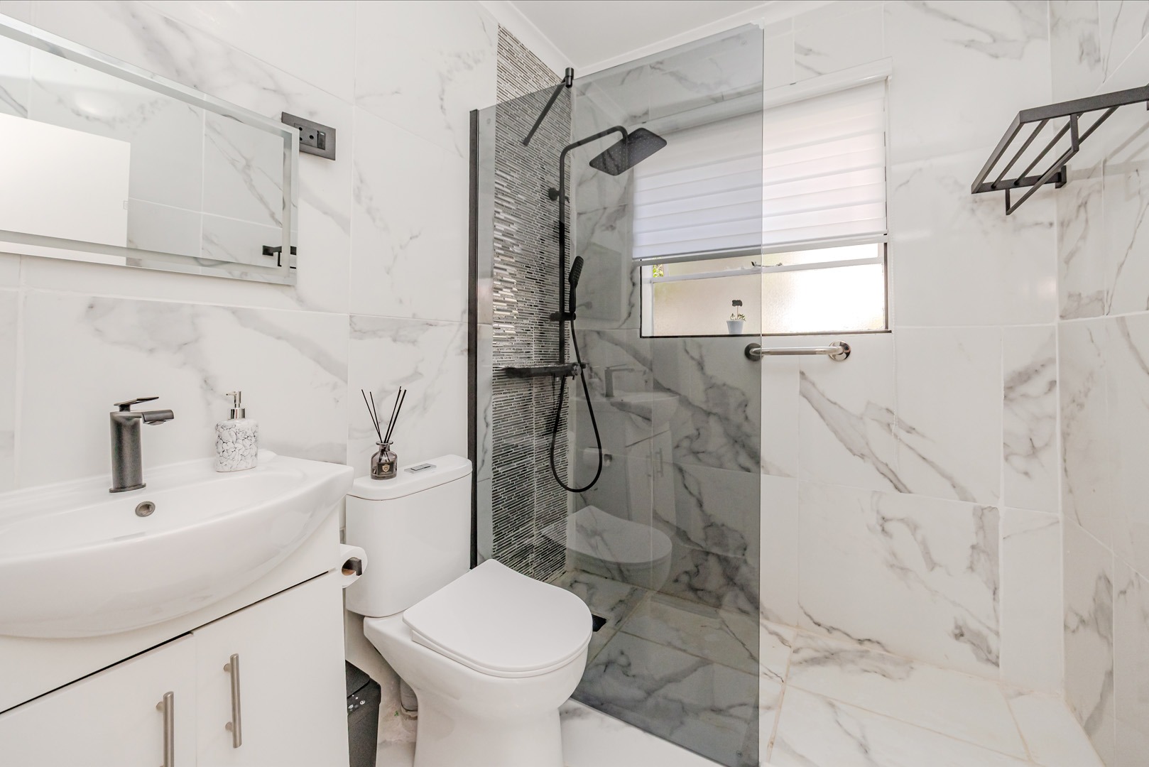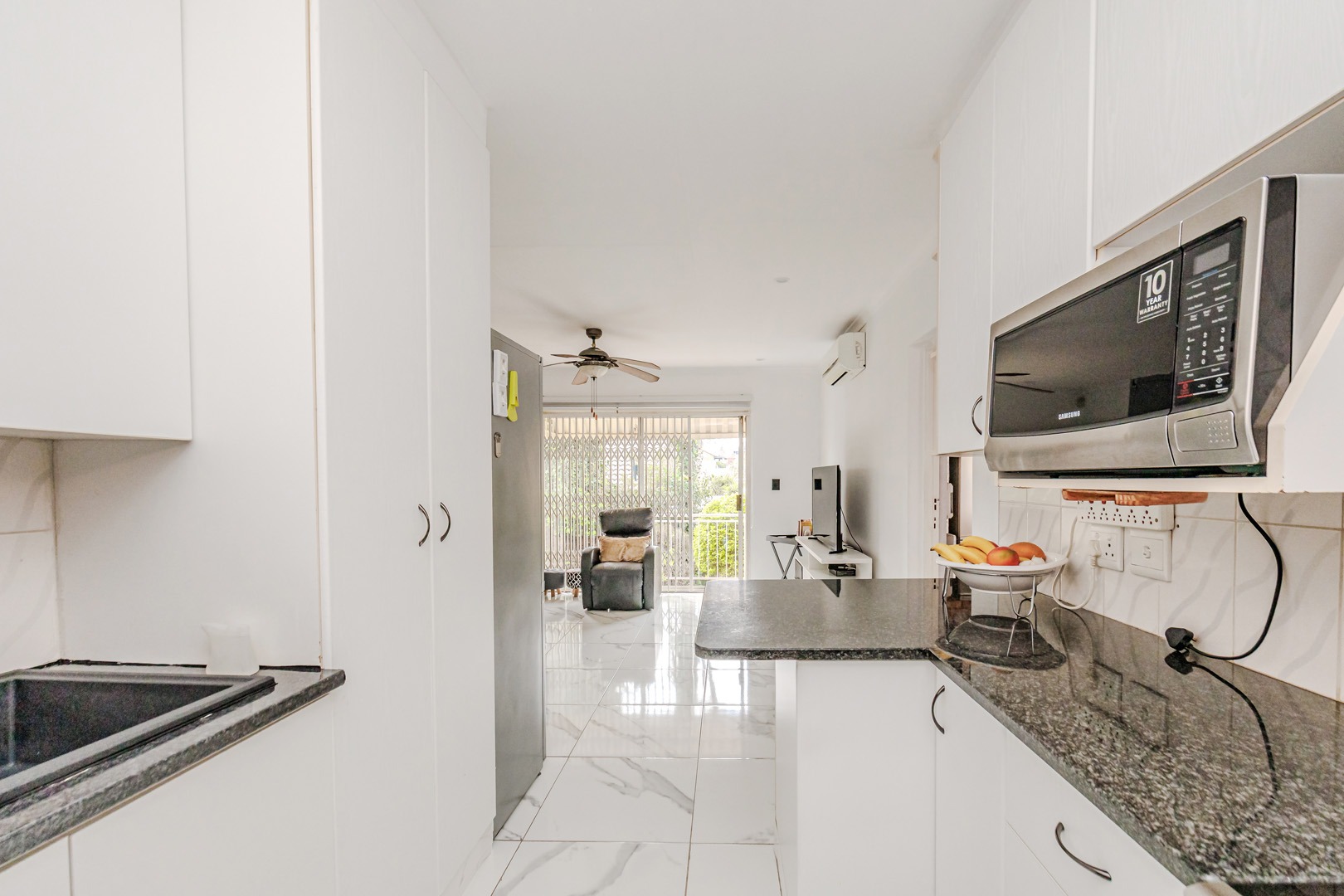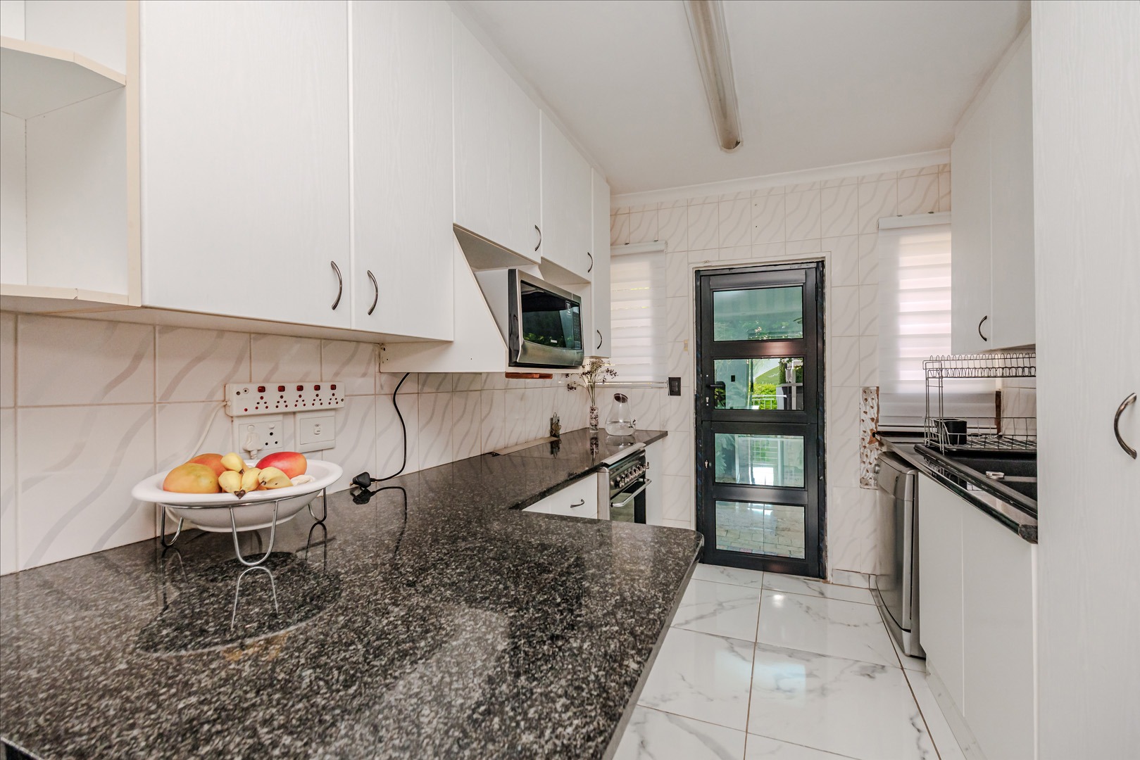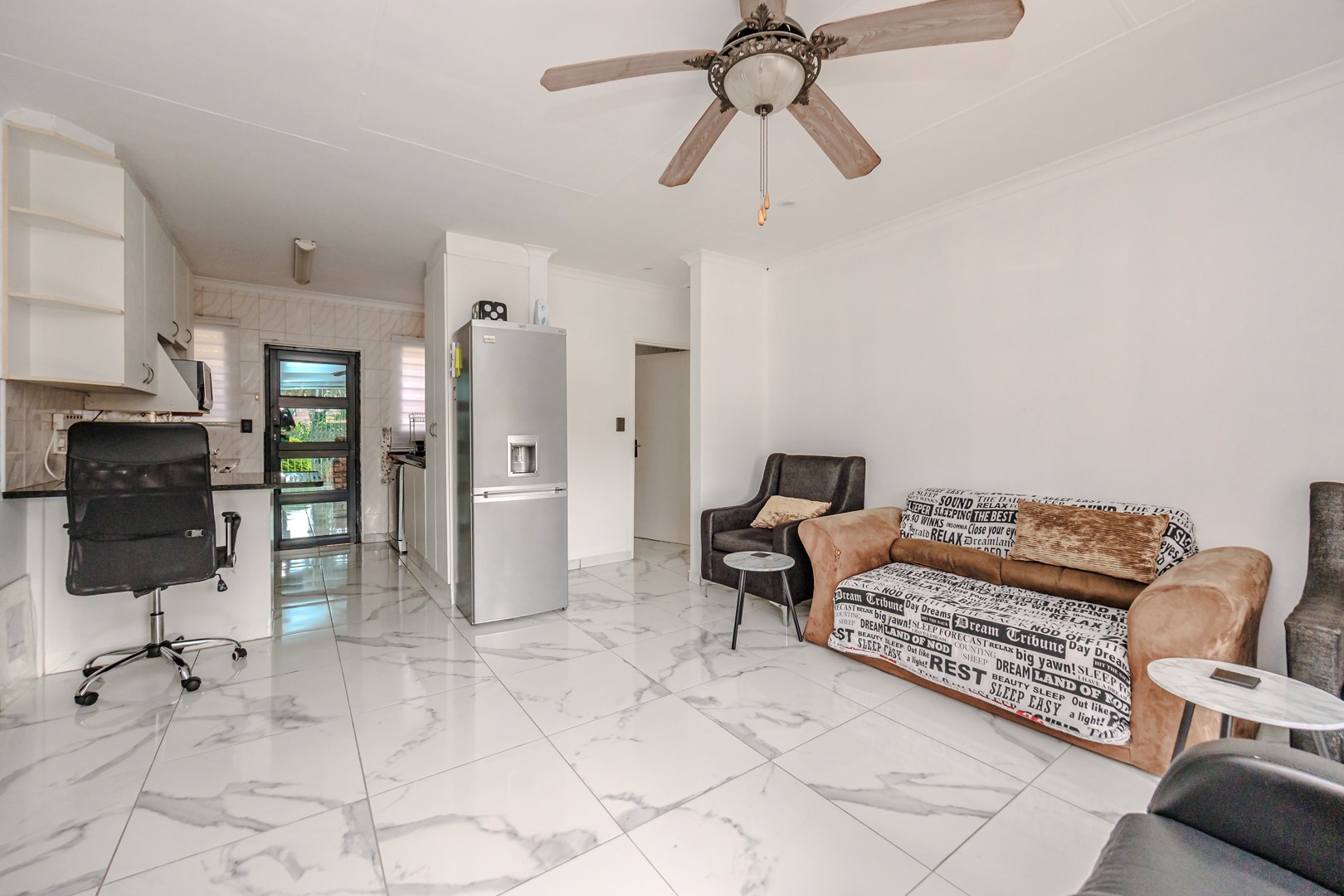 Discover modern living in this inviting 92 sqm residence located in the desirable suburban area of Wilgeheuwel, Roodepoort. This home features a contemporary open-plan layout, seamlessly connecting the kitchen and living areas. The kitchen boasts sleek white cabinetry, dark granite countertops, a black sink, and integrated appliances including a built-in oven and hob. White tiled flooring extends throughout, creating a bright and cohesive aesthetic.
