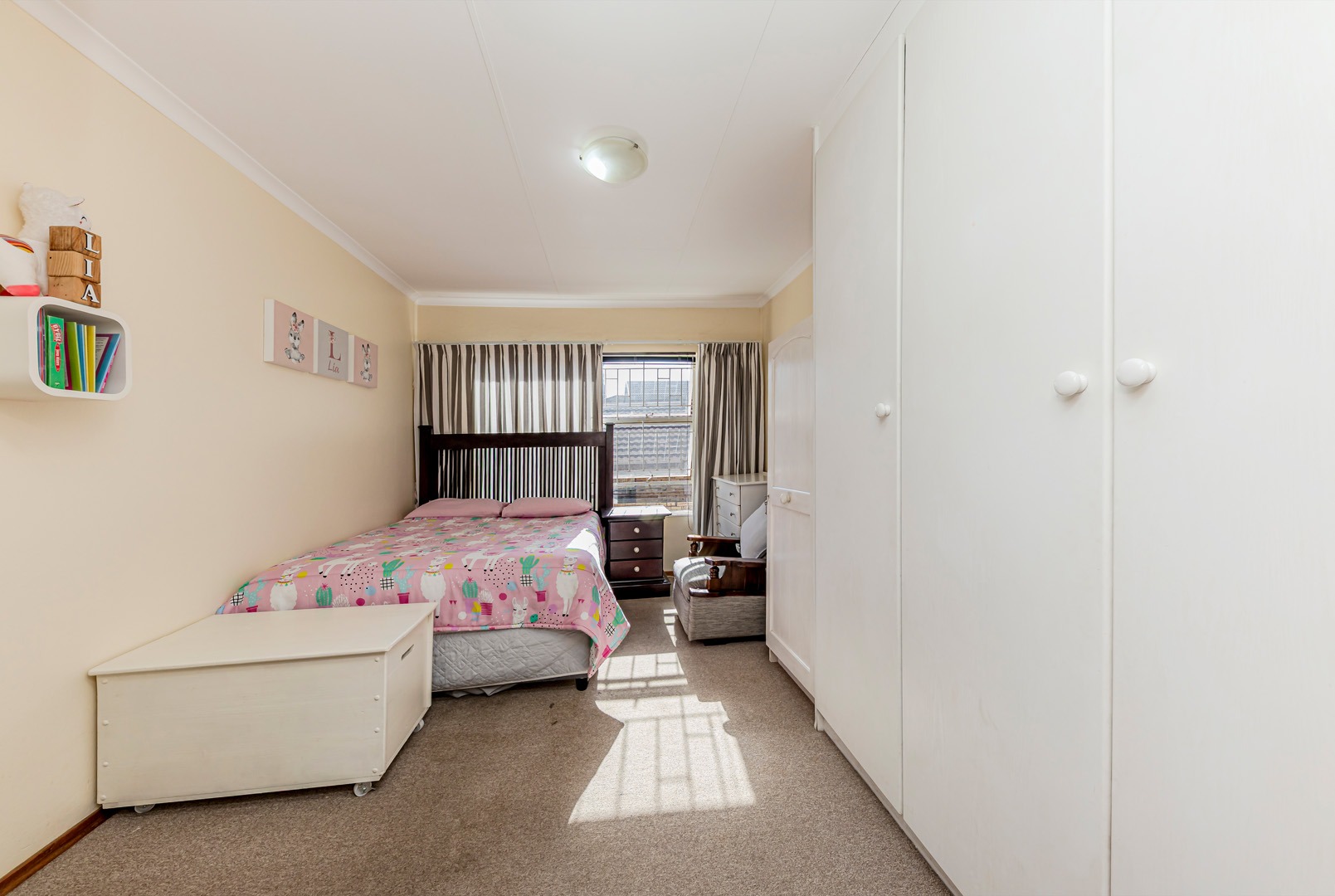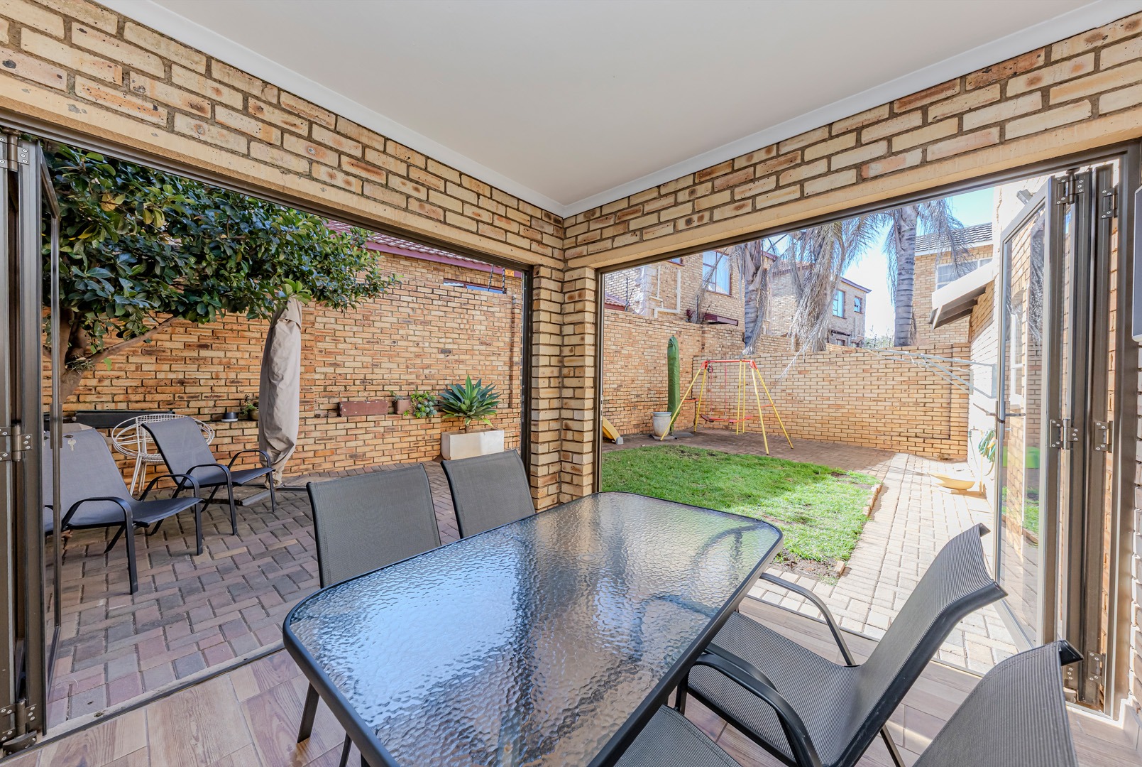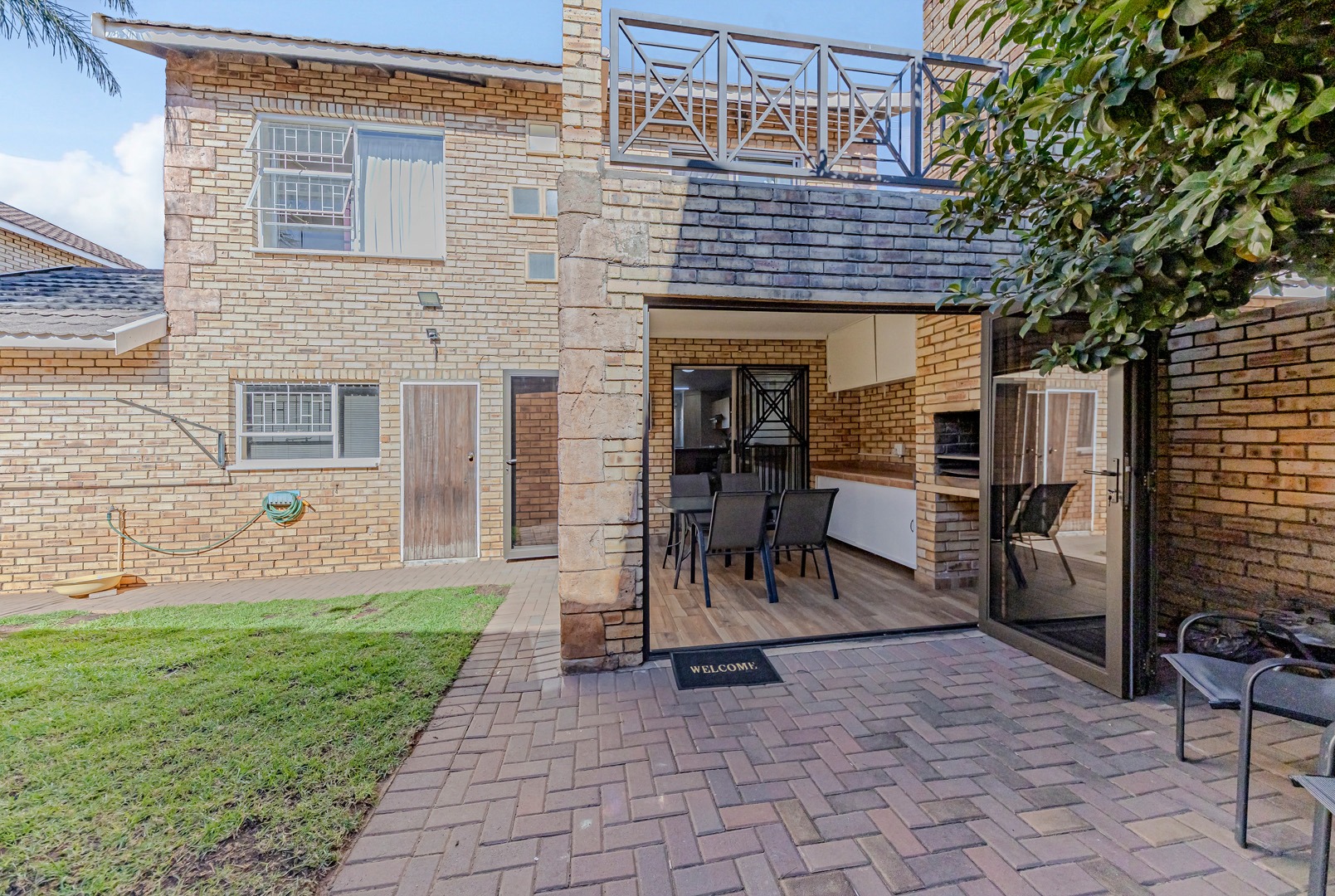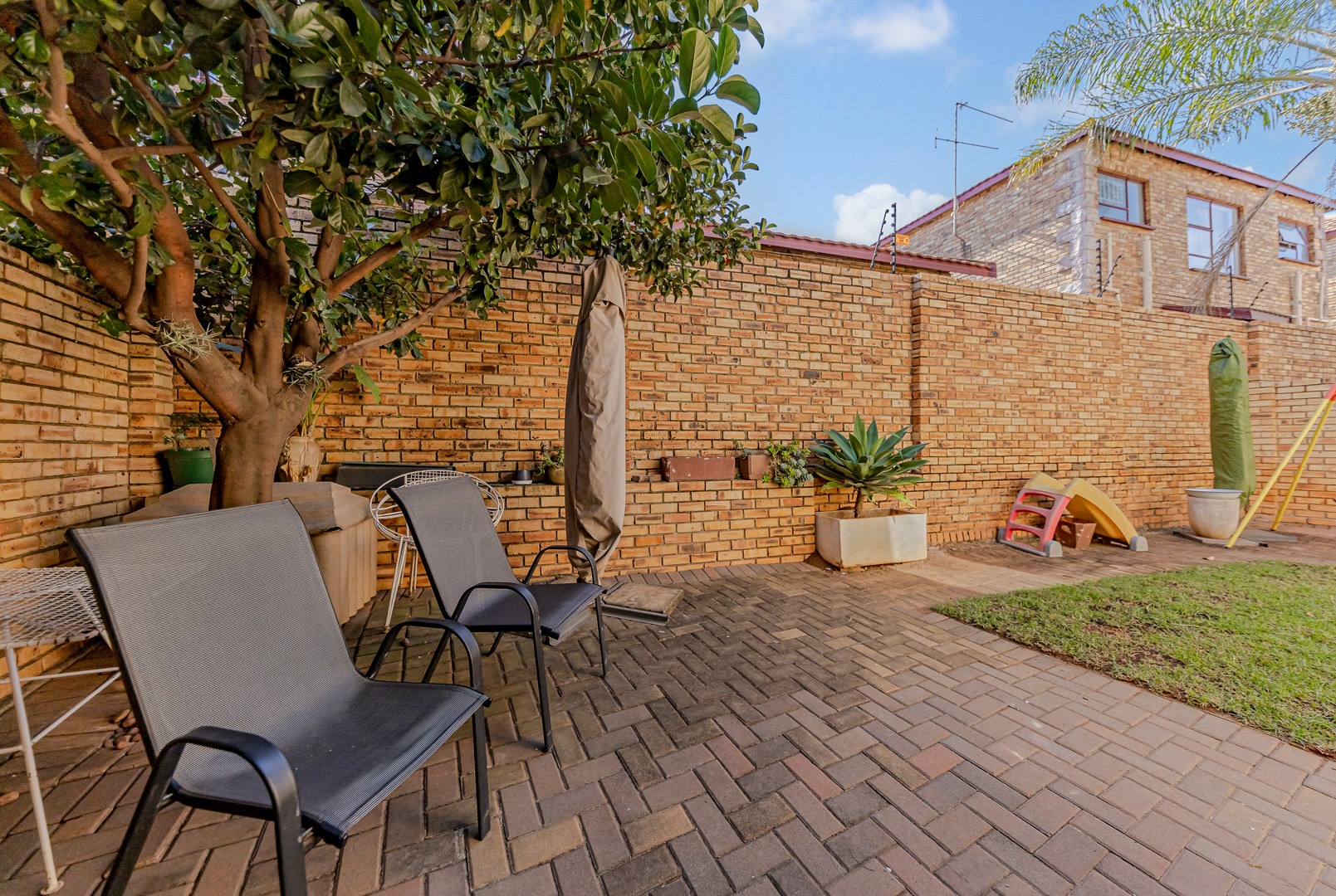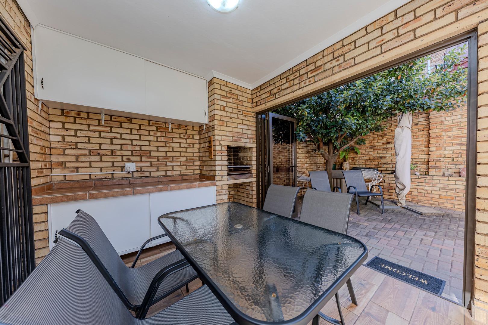 On the patio is a built-in braai area, complete with a built-in storage cupboard for all your braai accessories. The small, low-maintenance garden adds to the charm of the outdoor area, providing space for children, pets, or relaxing afternoons.