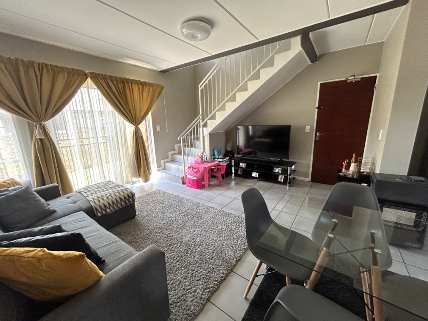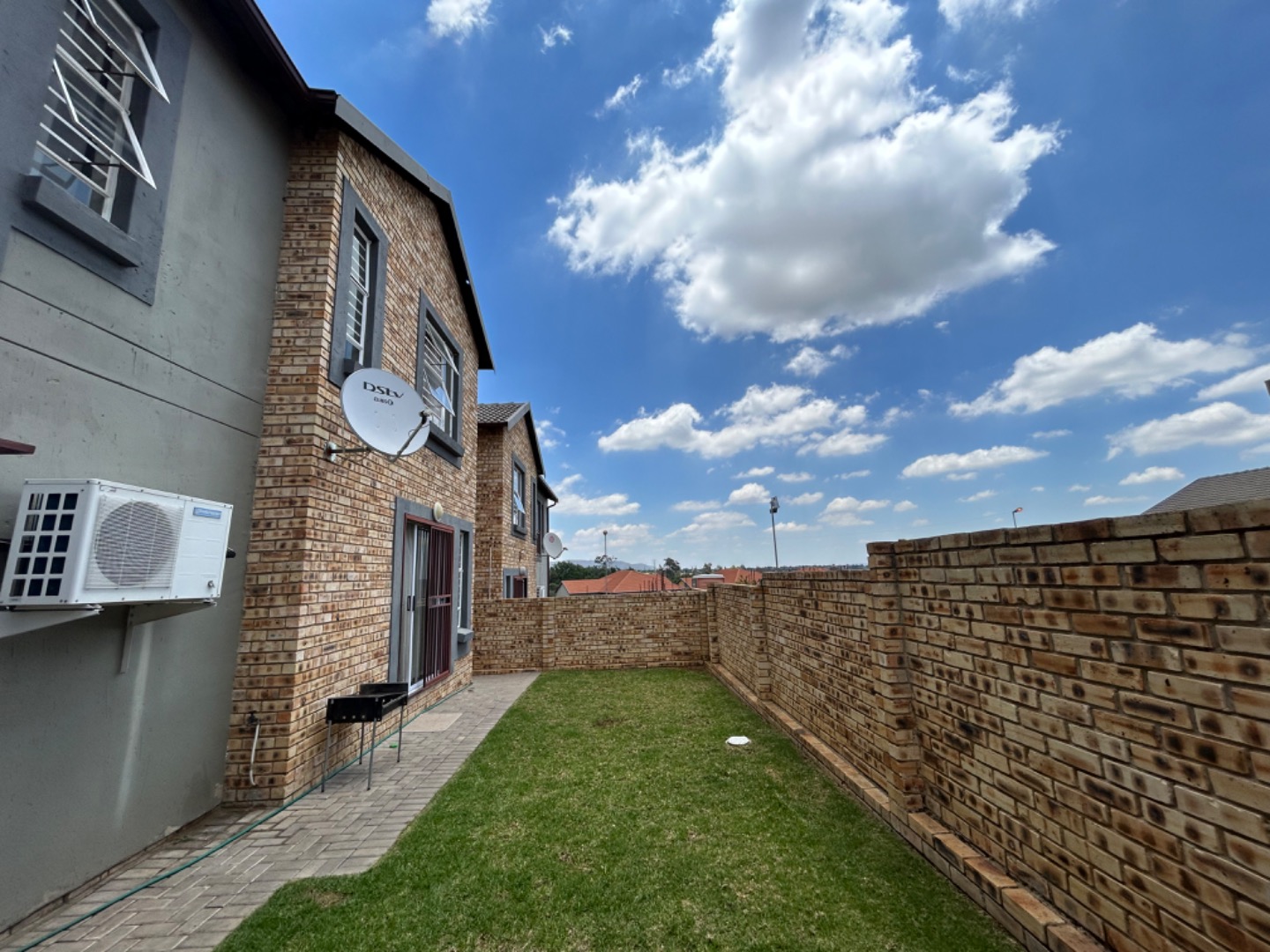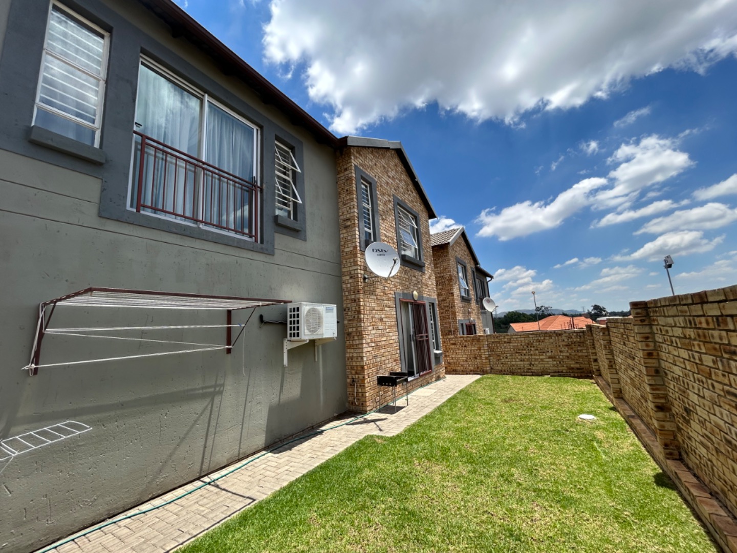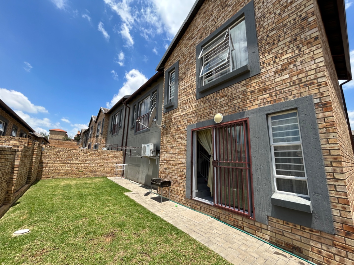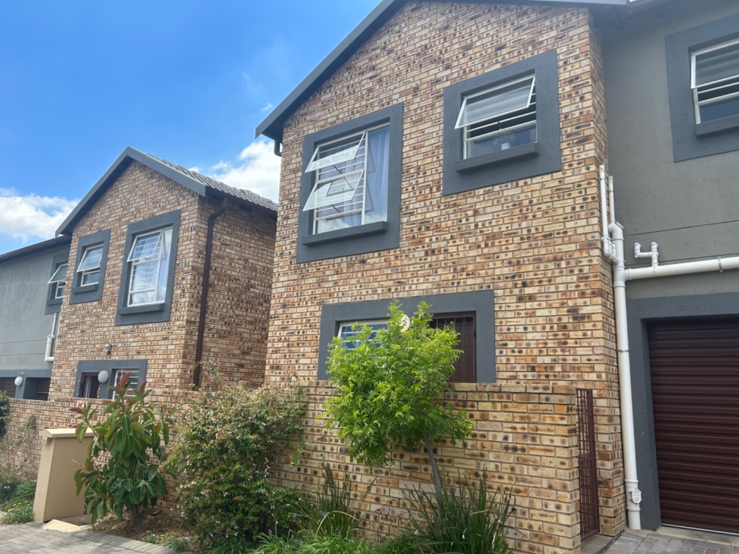 This modern two-story townhouse in Wilgeheuwel presents an inviting facade with attractive brickwork and stylish grey accents. Individual attached garages and paved driveways ensure a neat entrance. Ample windows allow natural light to fill the interiors, complemented by security bars for peace of mind.