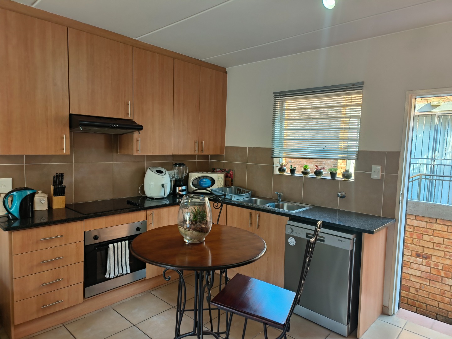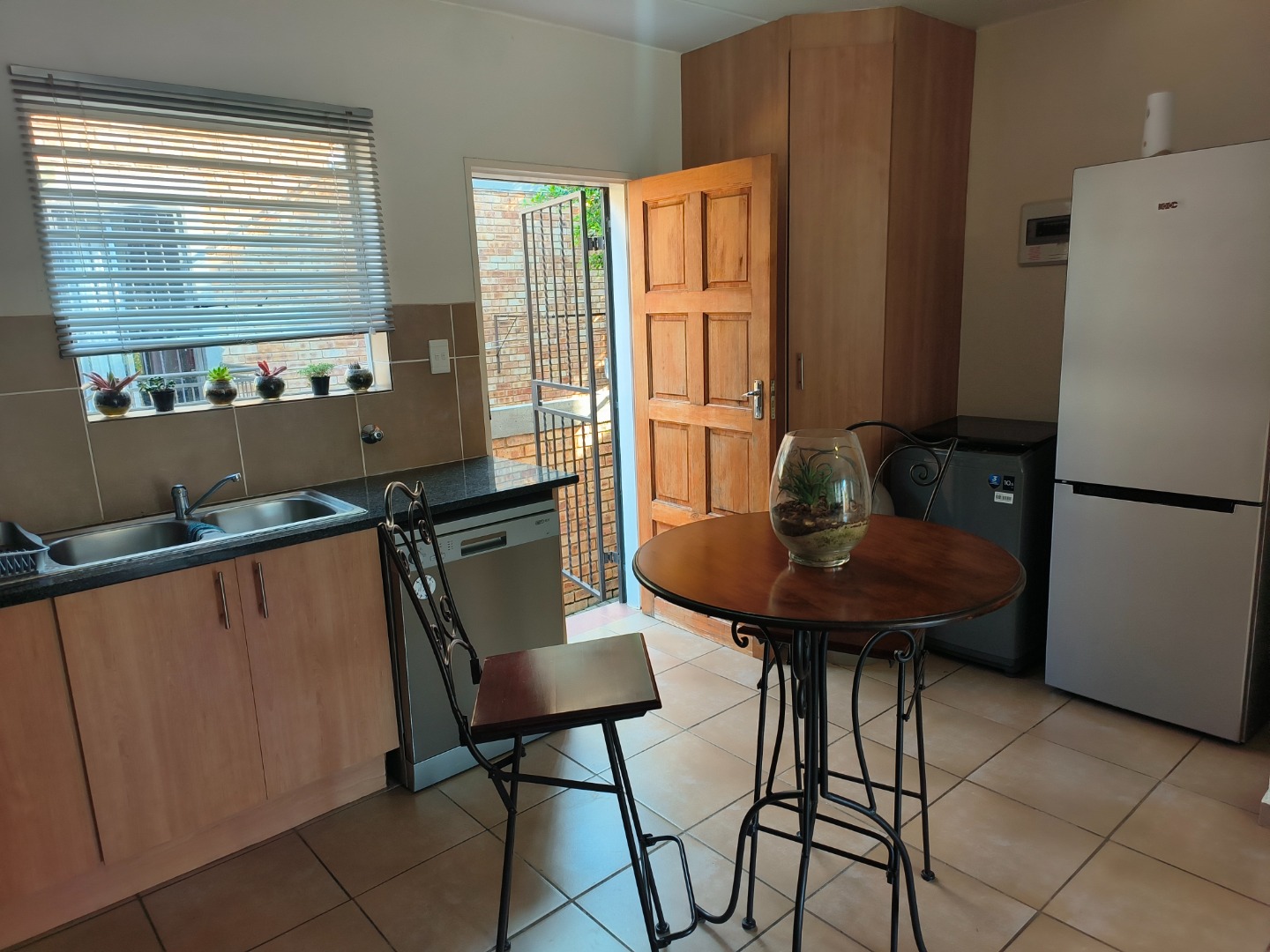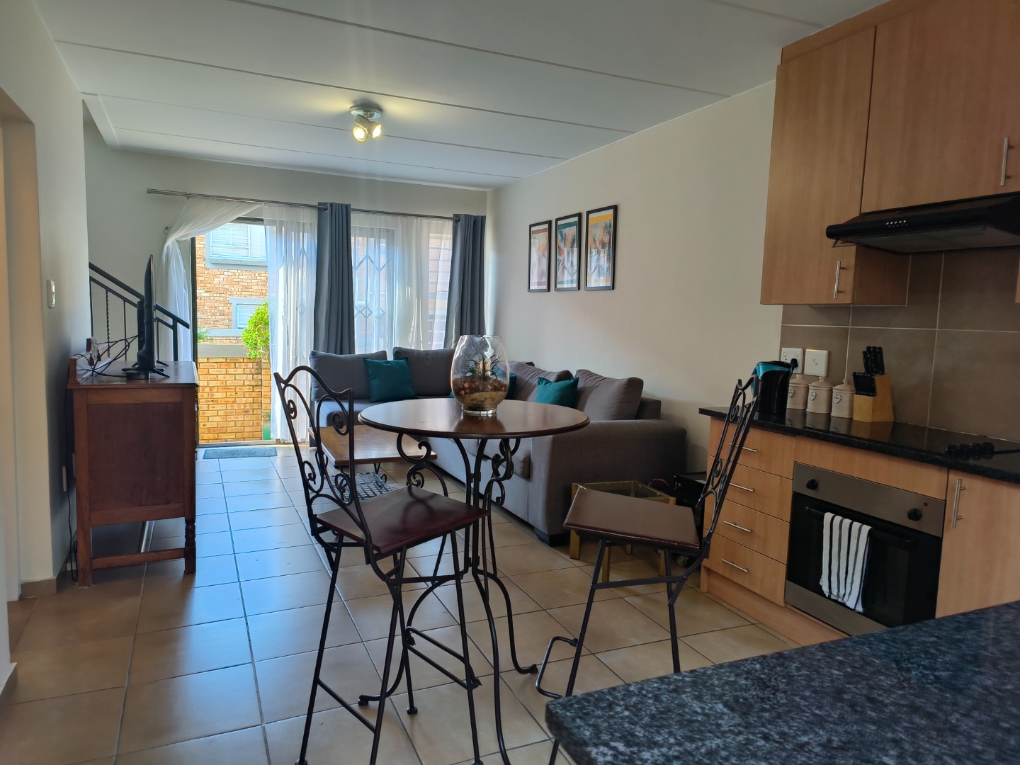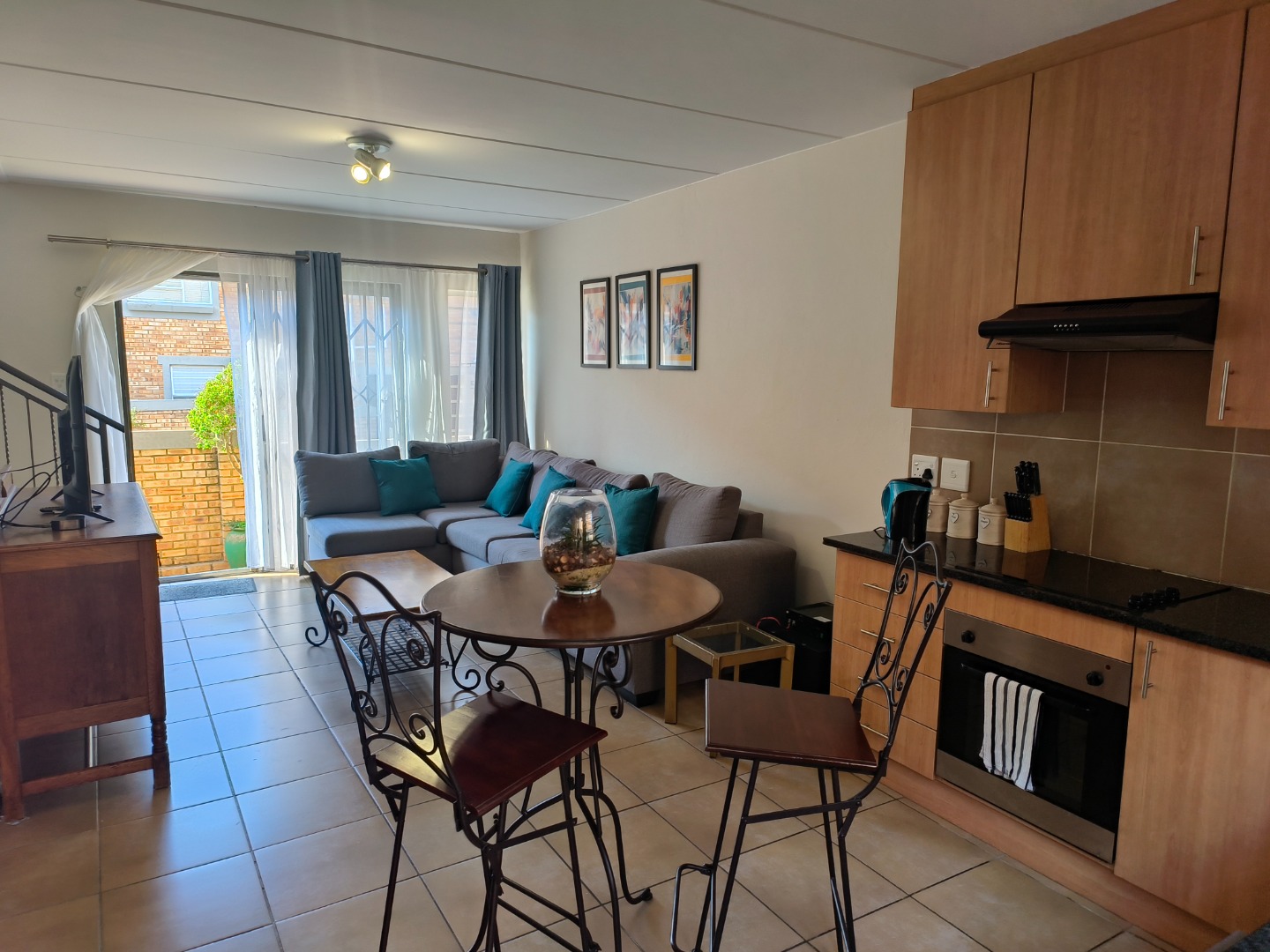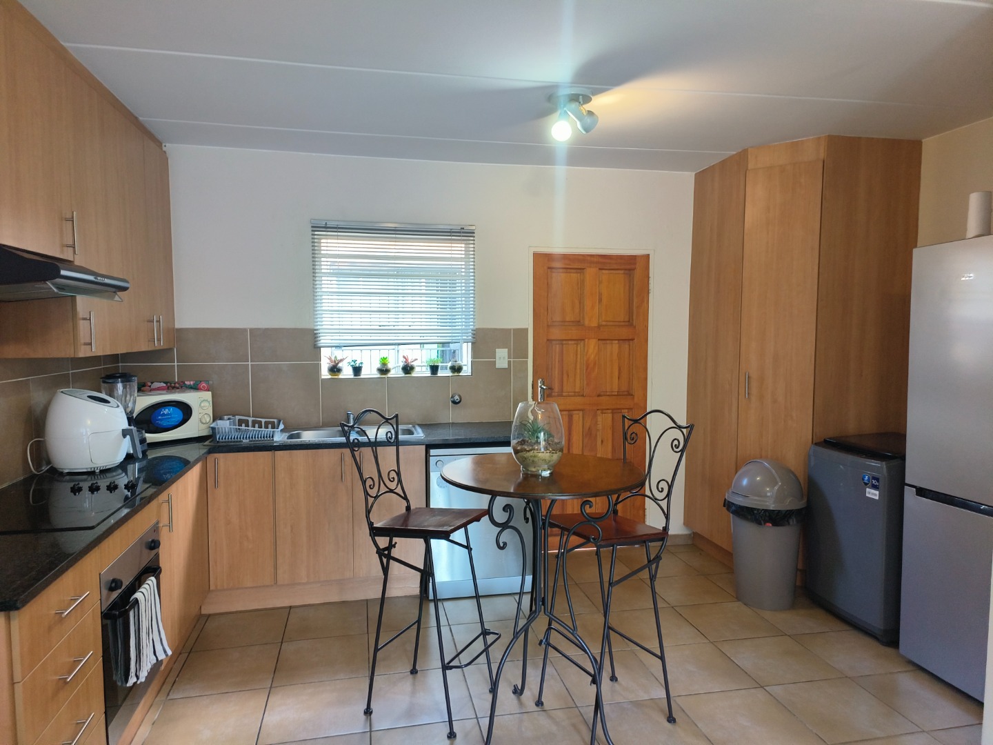 This neatly presented unit, with all bedrooms upstairs, offers complete privacy. Downstairs, find an open-plan lounge and kitchen with plenty of space to add a small dining table, the perfect eat- in kitchen. Also, boasting a pantry cupboard, space for 2 water appliances, and a double fridge-freezer combination, an extractor fan with oven and hob. The lounge is spacious and leads to the garden. A guest toilet is located downstairs.