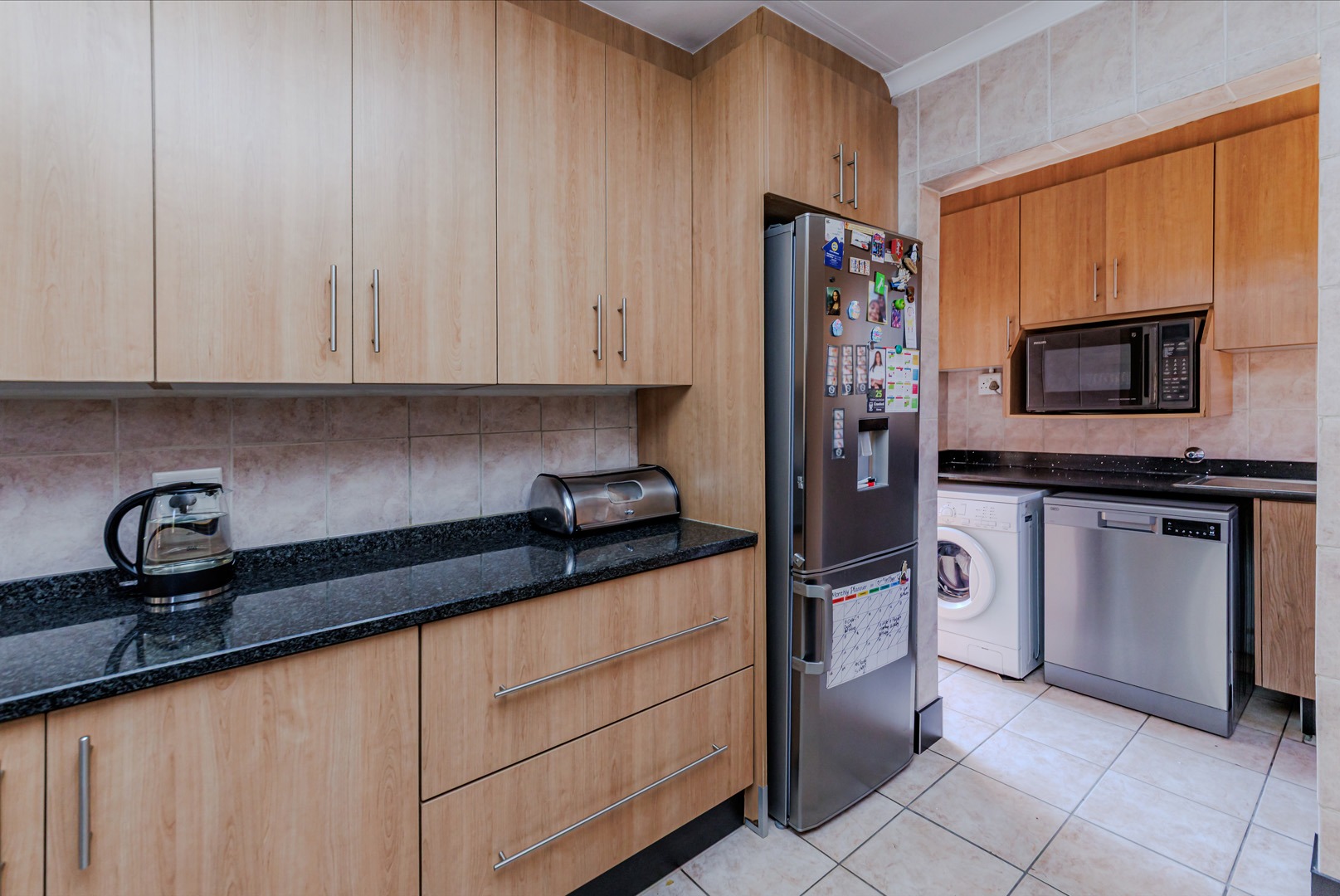 Step inside to an open-plan living space designed with modern comfort in mind. The well-appointed kitchen is a standout feature, showcasing light wood cabinetry, dark granite countertops, and quality built-in appliances including a gas hob, oven, and extractor fan. Ample storage and dedicated spaces for a large refrigerator, dishwasher, and washing machine make the kitchen both stylish and practical. The kitchen flows effortlessly into the tiled living area, which includes an air-conditioning unit, creating an inviting space for relaxation and entertaining.