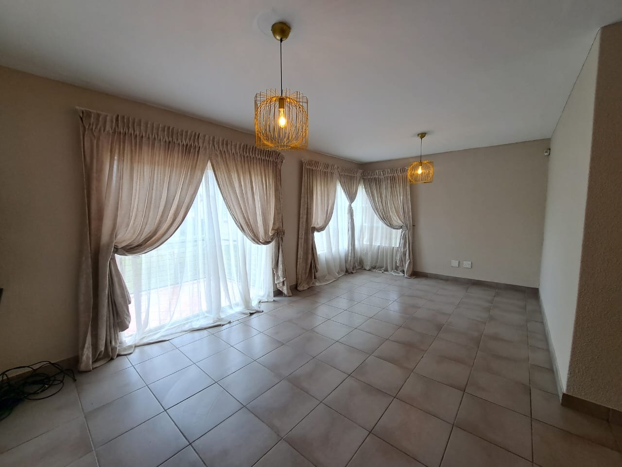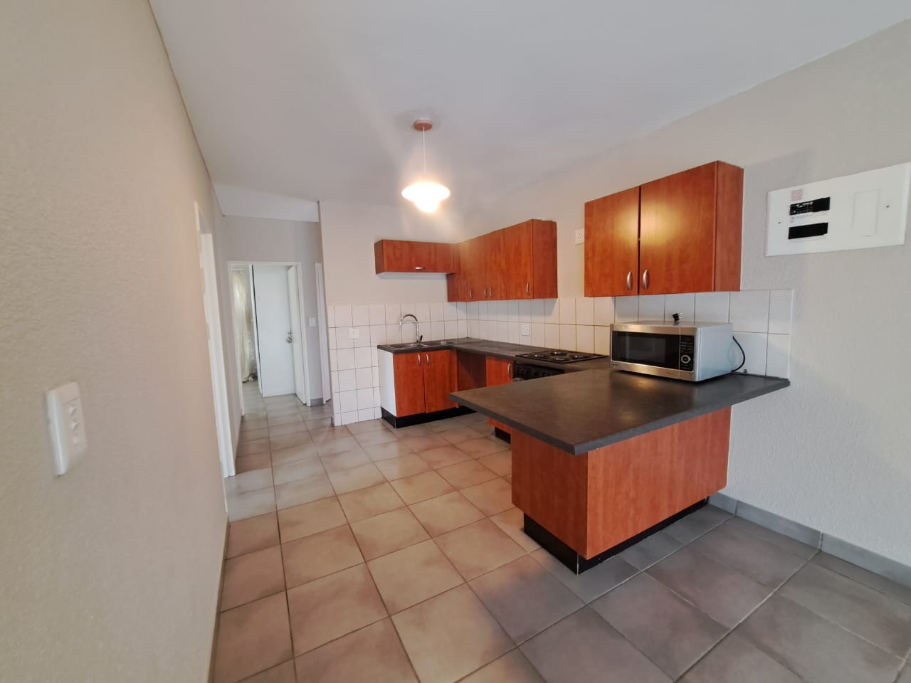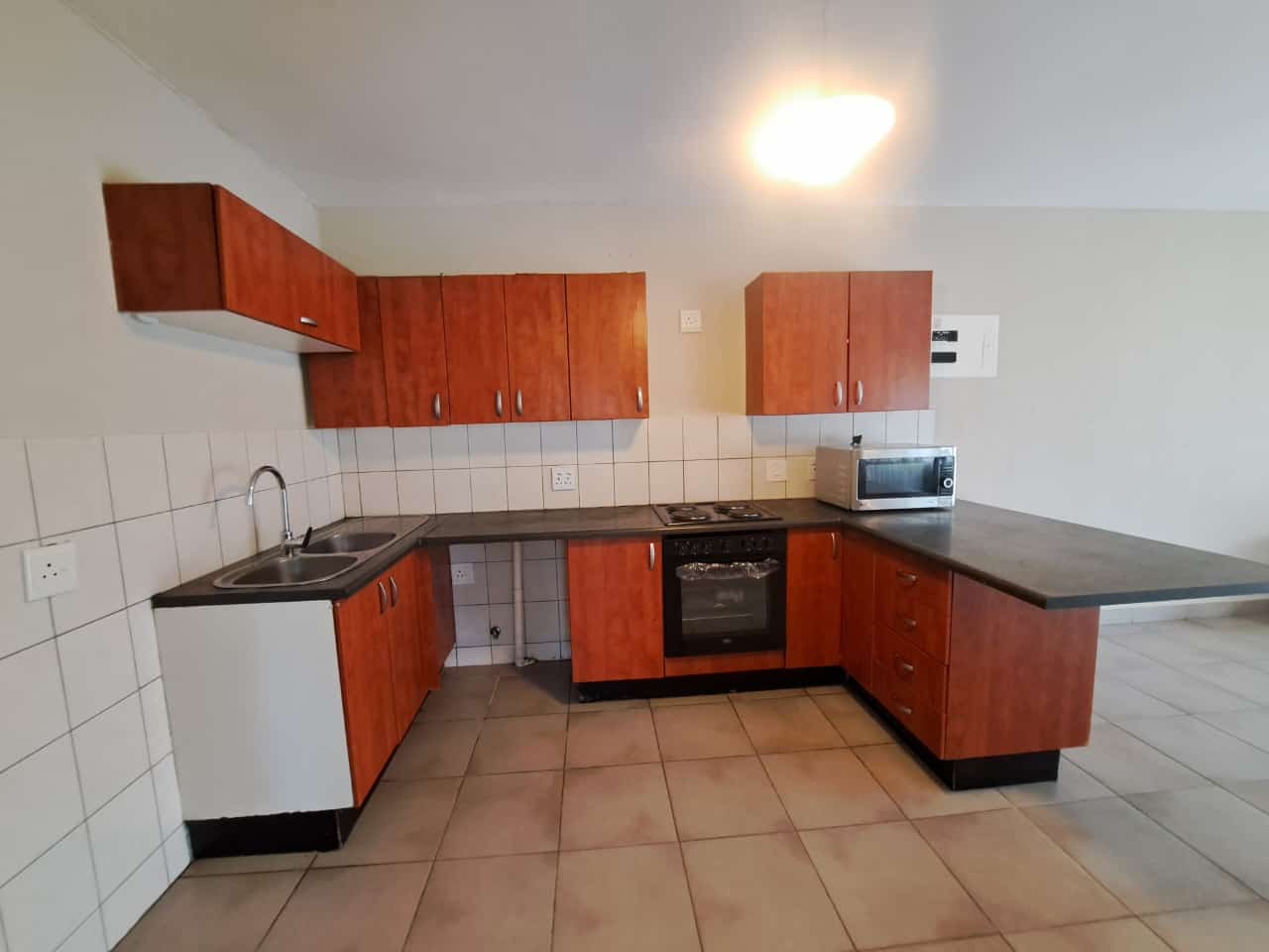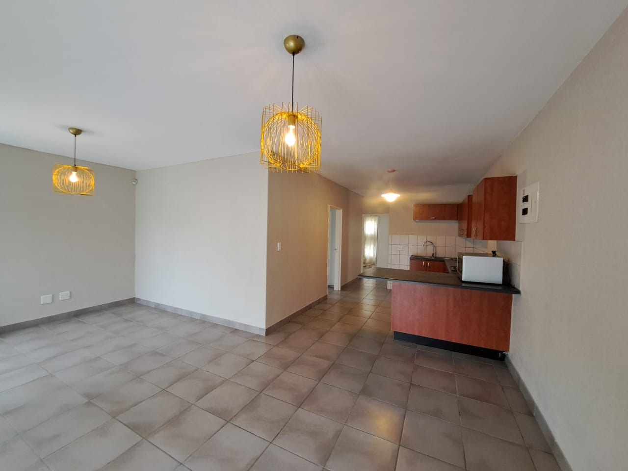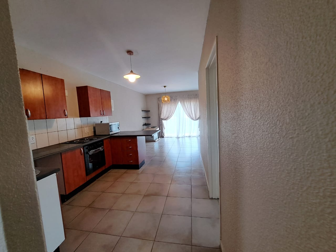 Step inside to find an intelligently designed open-plan layout that seamlessly connects the living areas with functional kitche. Kitchens is equipped with wooden cabinetry, ample countertop space, and tiled flooring, featuring a built-in oven and hob. The continuous tiled flooring throughout the main areas ensures durability and easy maintenance, while large windows in the living spaces invite abundant natural light.