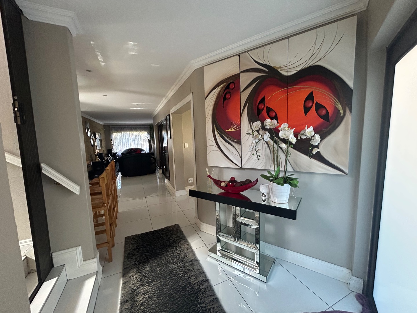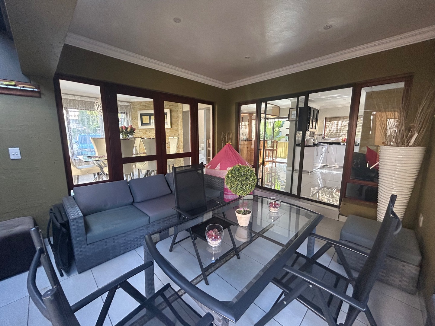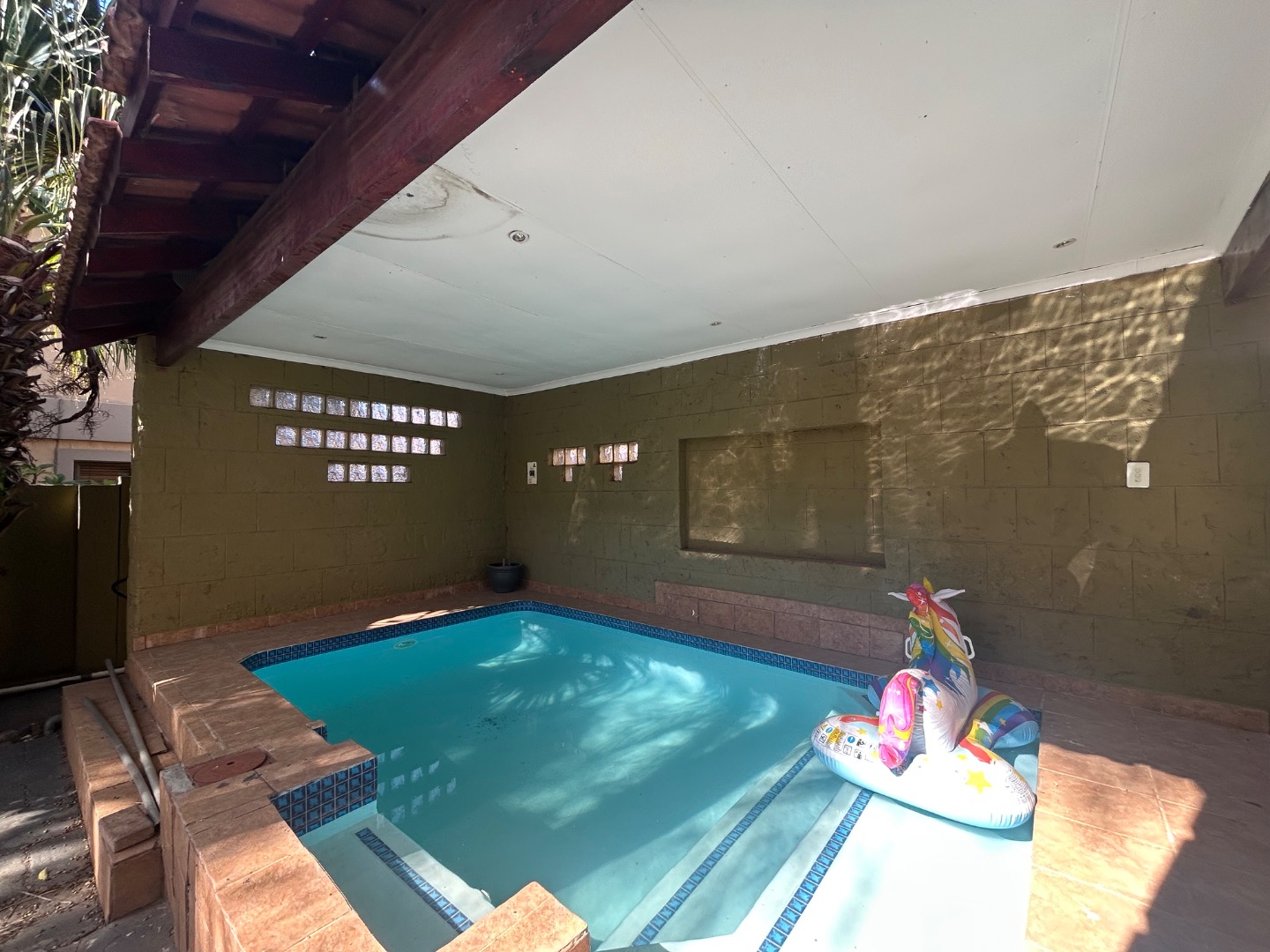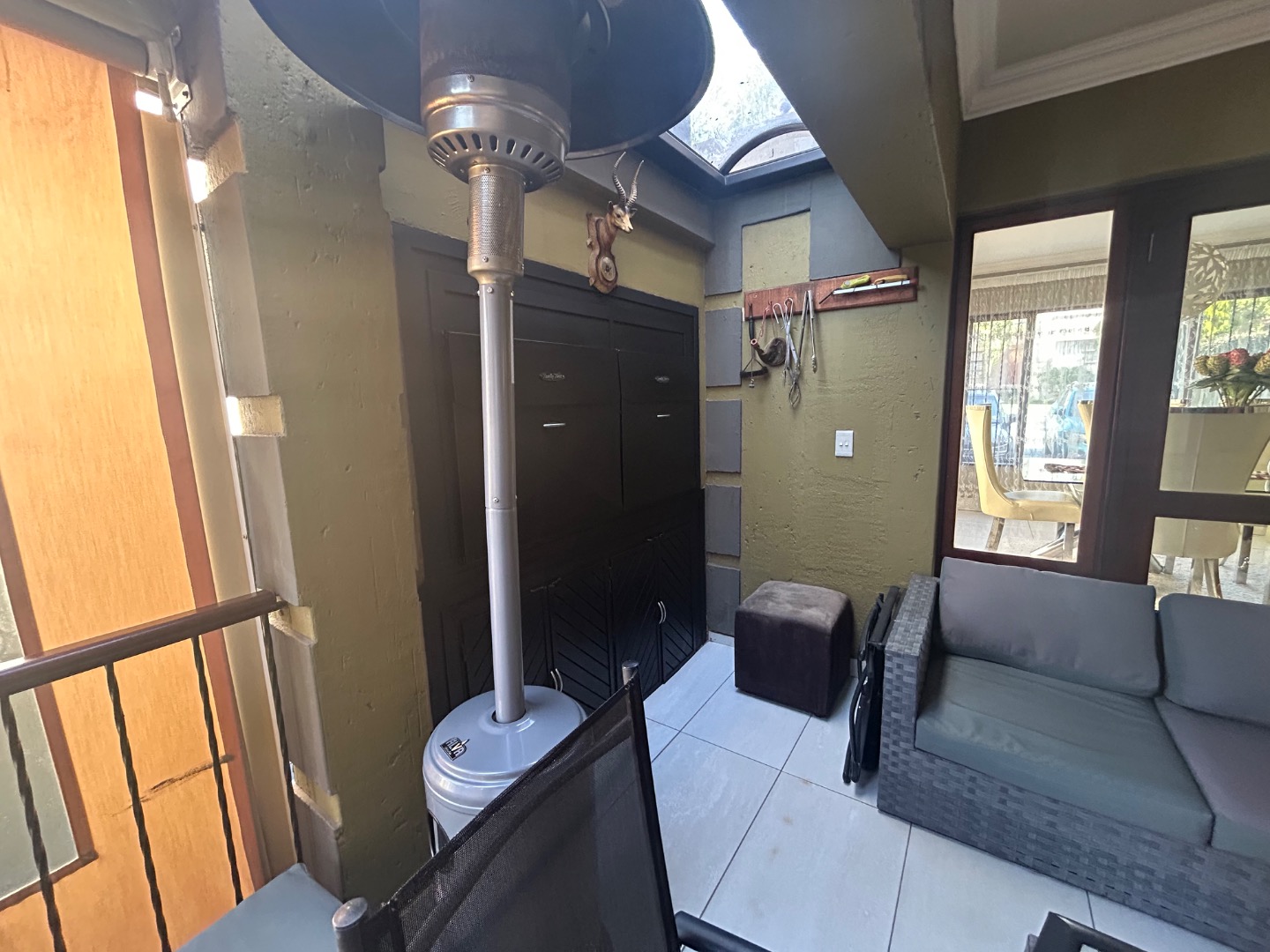 On entering the home you enter a tranquil space that speaks of love and laughter and entertainment in the living spaces. The oak bar opens up onto an open patio on the side of the home and the dining room into an enclosed patio with a double braai space and semi-covered pool and private garden. Next to the covered patio is a private lounge with a built in fireplace.