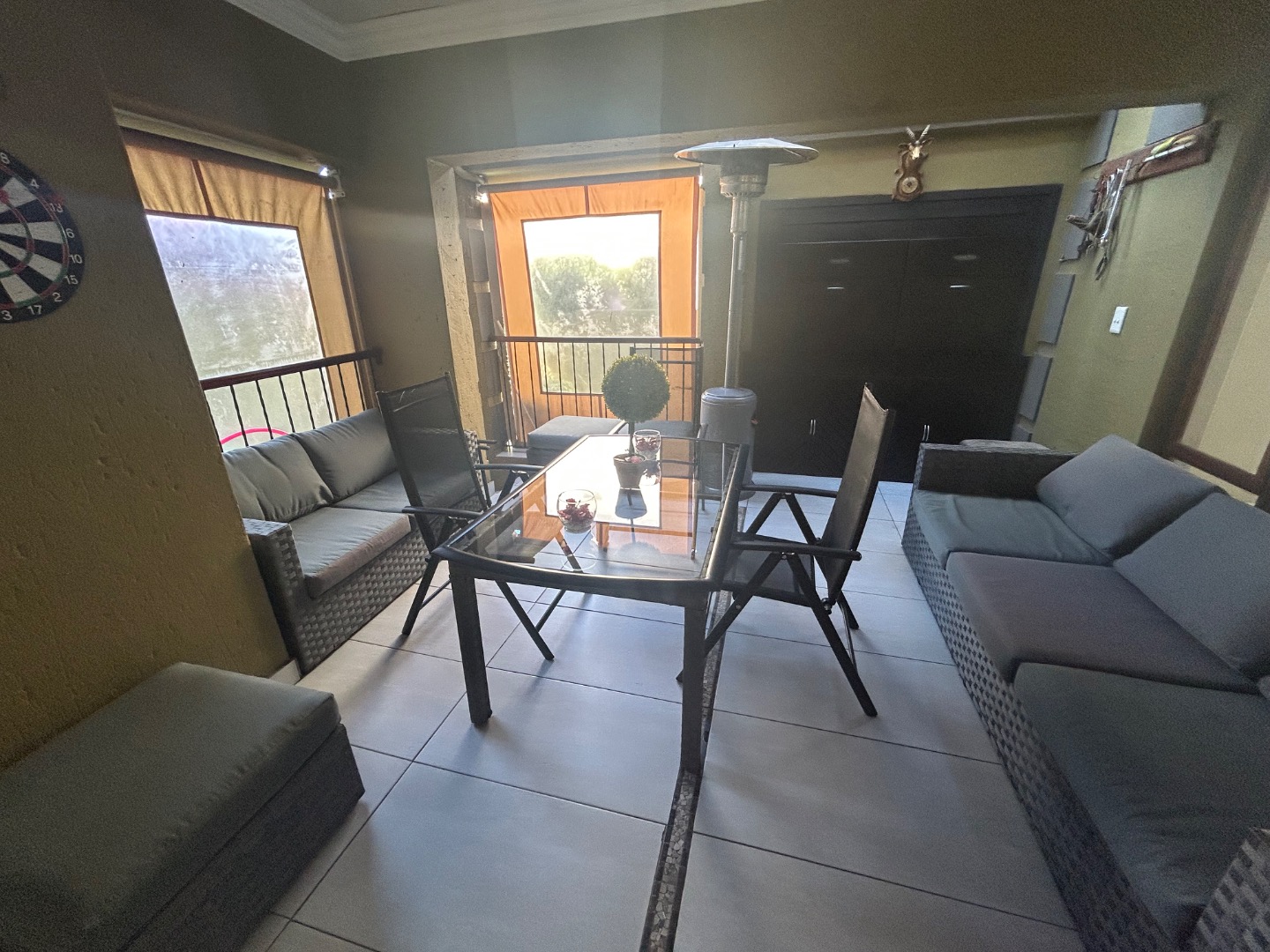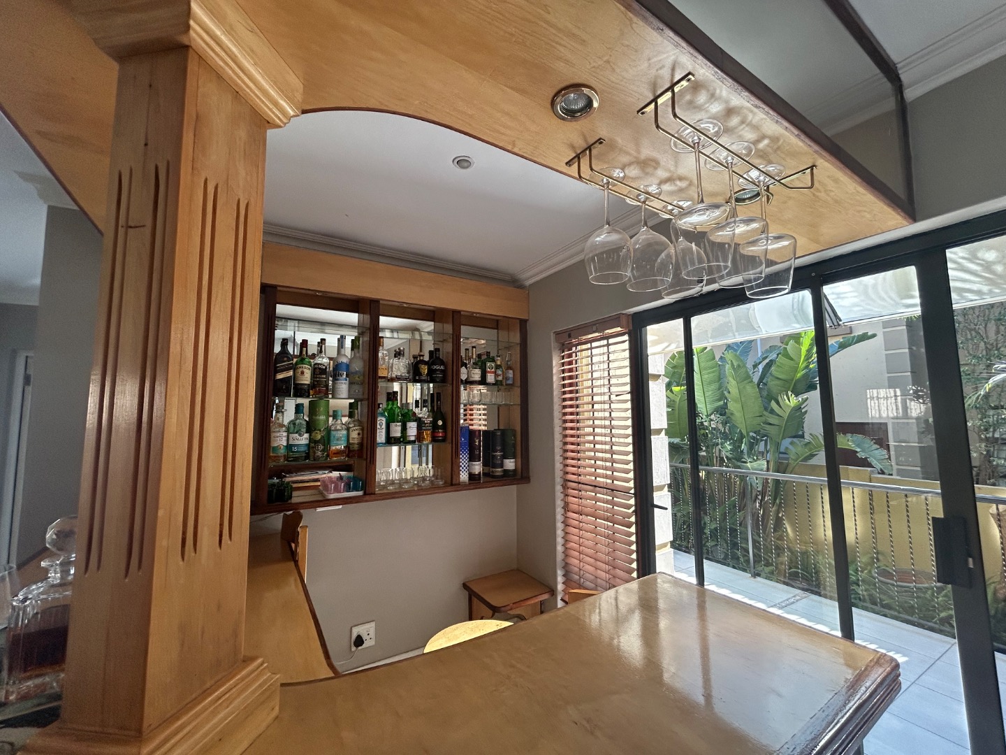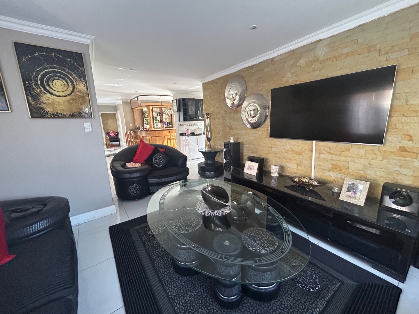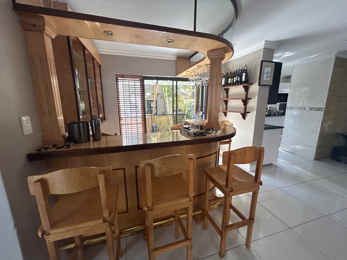 On entering the home you enter a tranquil space that speaks of love and laughter and entertainment in the living spaces. The oak bar opens up onto an open patio on the side of the home and the dining room into an enclosed patio with a double braai space and semi-covered pool and private garden. Next to the covered patio is a private lounge with a built in fireplace.