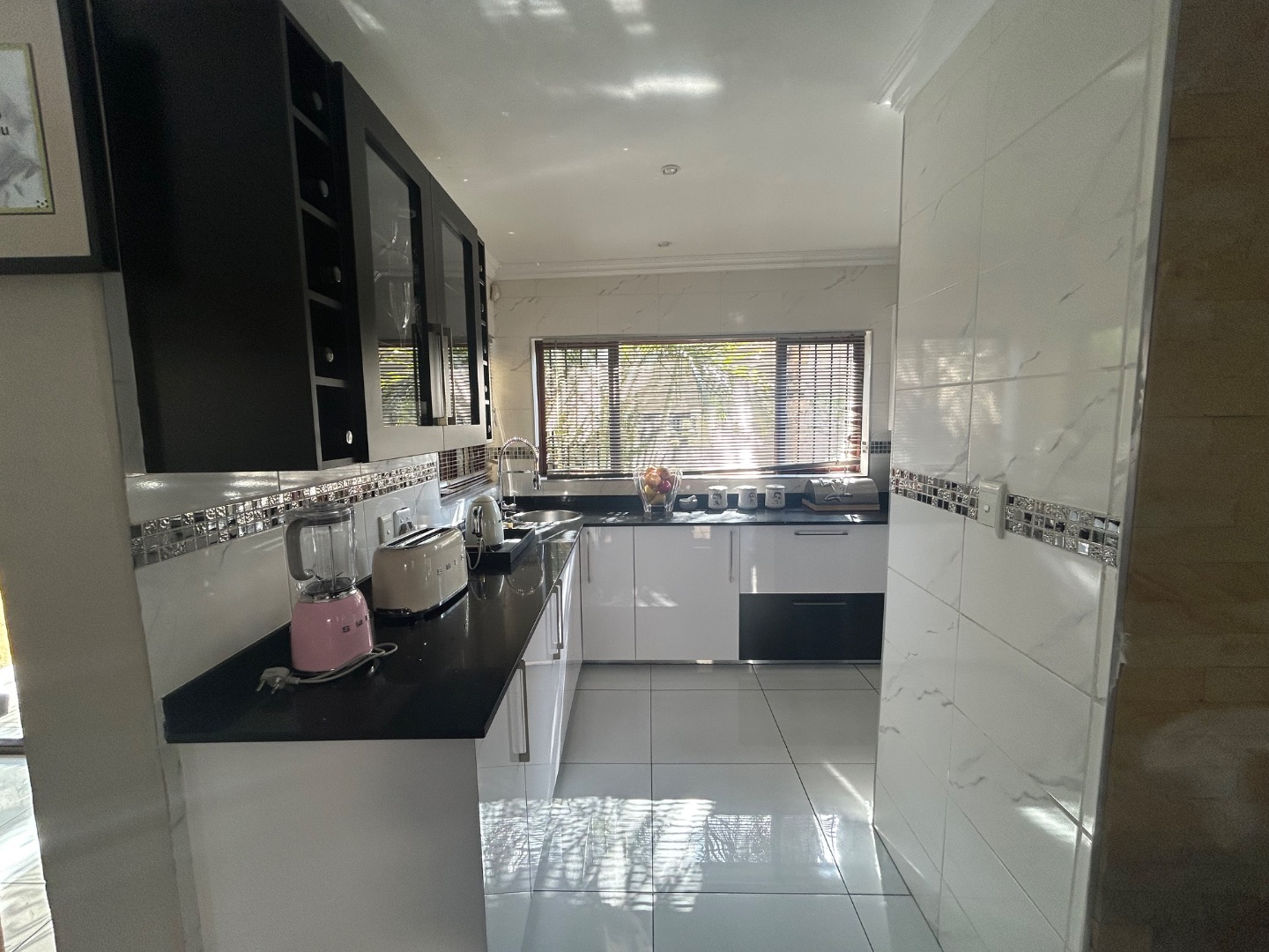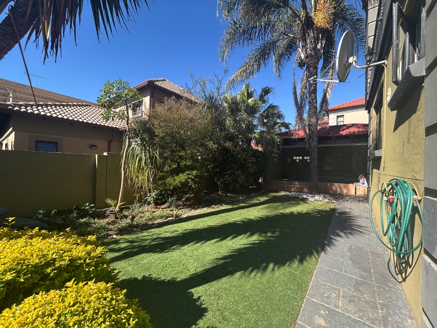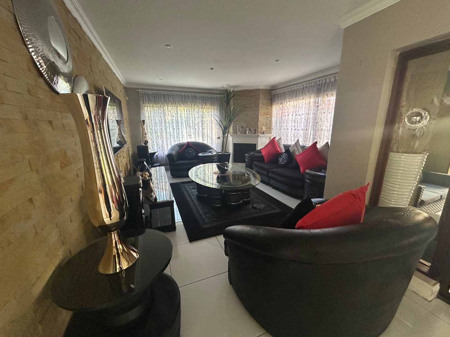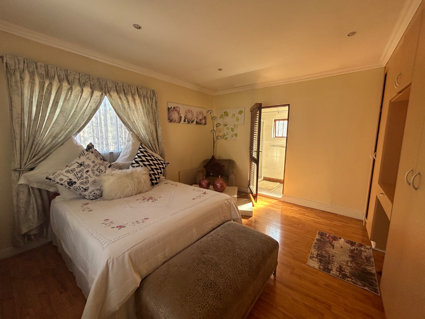 On entering the home you enter a tranquil space that speaks of love and laughter and entertainment in the living spaces. The oak bar opens up onto an open patio on the side of the home and the dining room into an enclosed patio with a double braai space and semi-covered pool and private garden. Next to the covered patio is a private lounge with a built in fireplace.