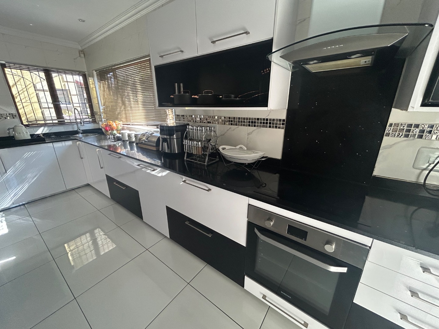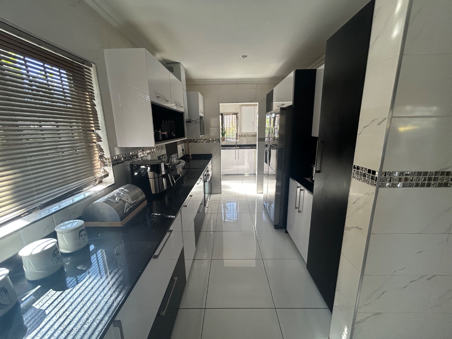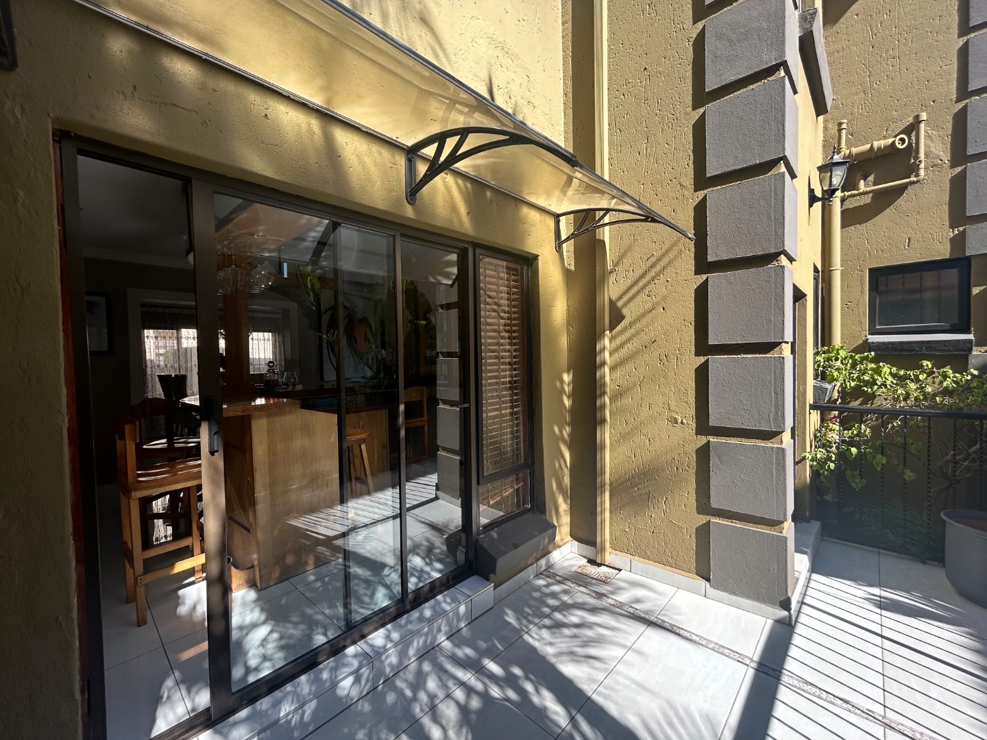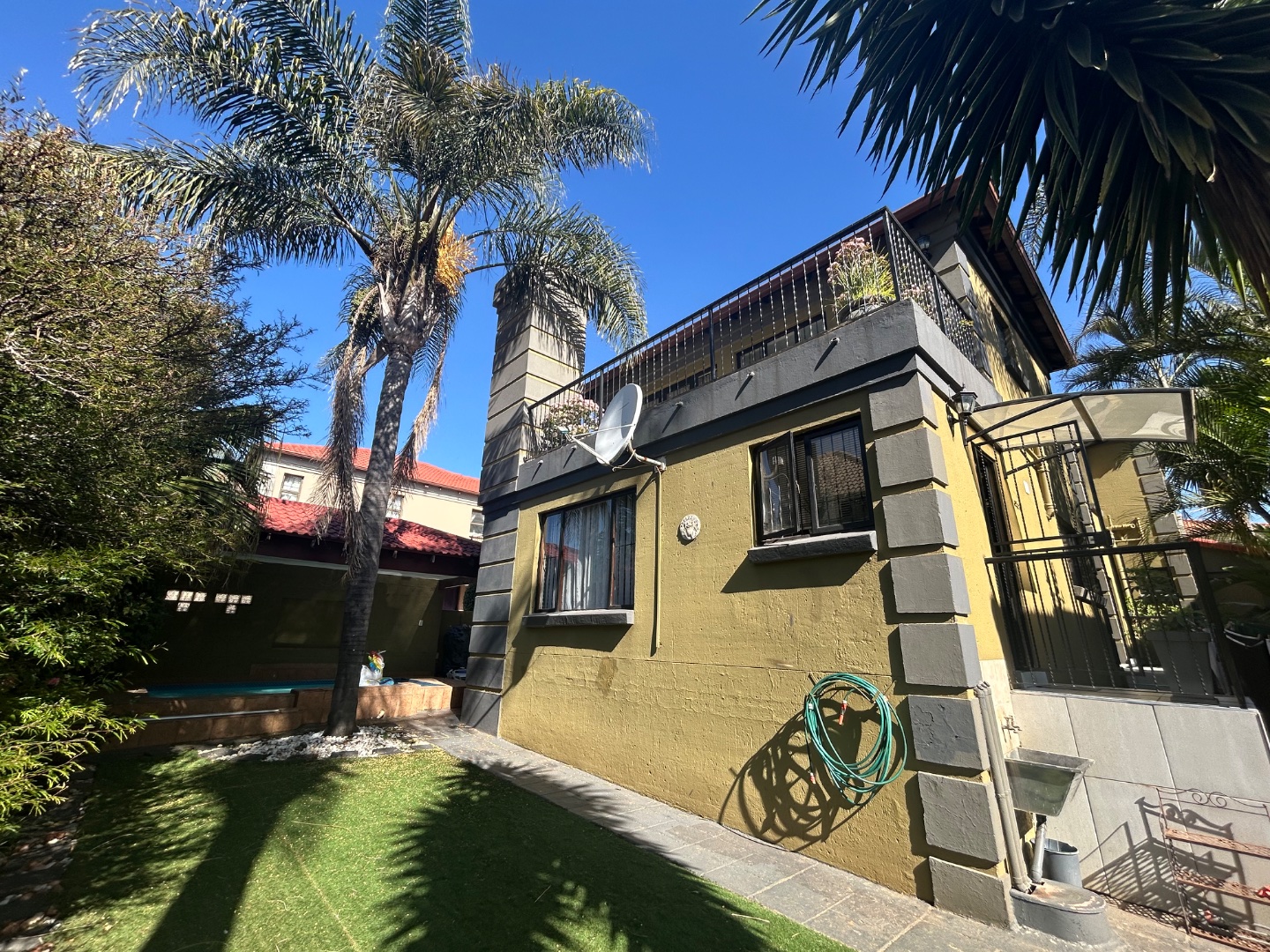 On entering the home you enter a tranquil space that speaks of love and laughter and entertainment in the living spaces. The oak bar opens up onto an open patio on the side of the home and the dining room into an enclosed patio with a double braai space and semi-covered pool and private garden. Next to the covered patio is a private lounge with a built in fireplace.