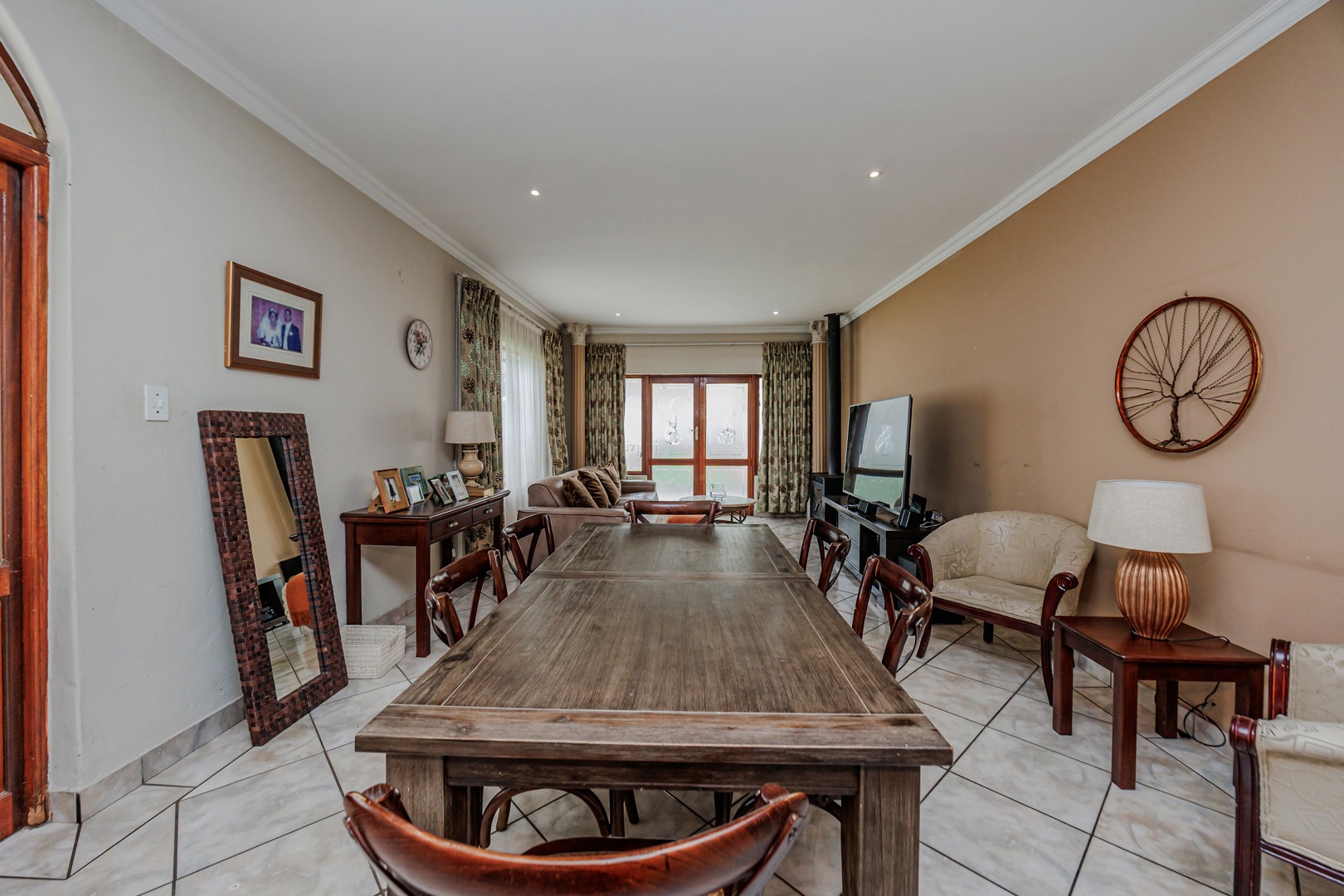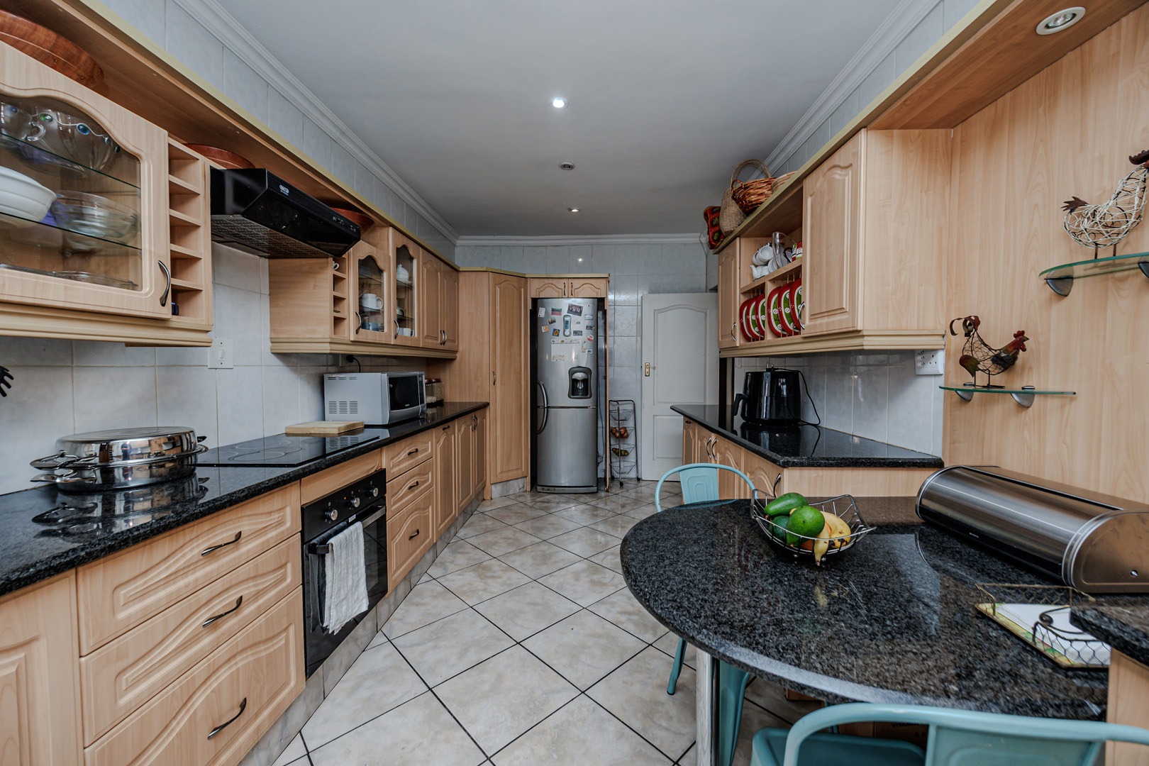The interior layout is thoughtfully designed for both comfort and functionality, featuring two spacious lounges, a dedicated dining room, and an additional family TV room, providing ample space for relaxation and entertainment. The open-plan design enhances the flow between these principal living areas. The kitchen is appointed with light wood-toned cabinetry, dark granite-style countertops, a tiled backsplash, and integrated appliances including a built-in oven and electric hob, catering to modern culinary requirements.
