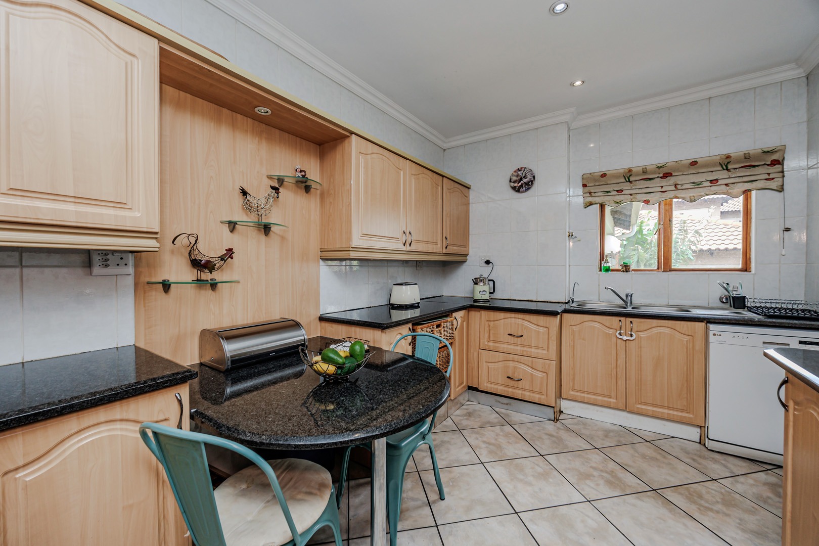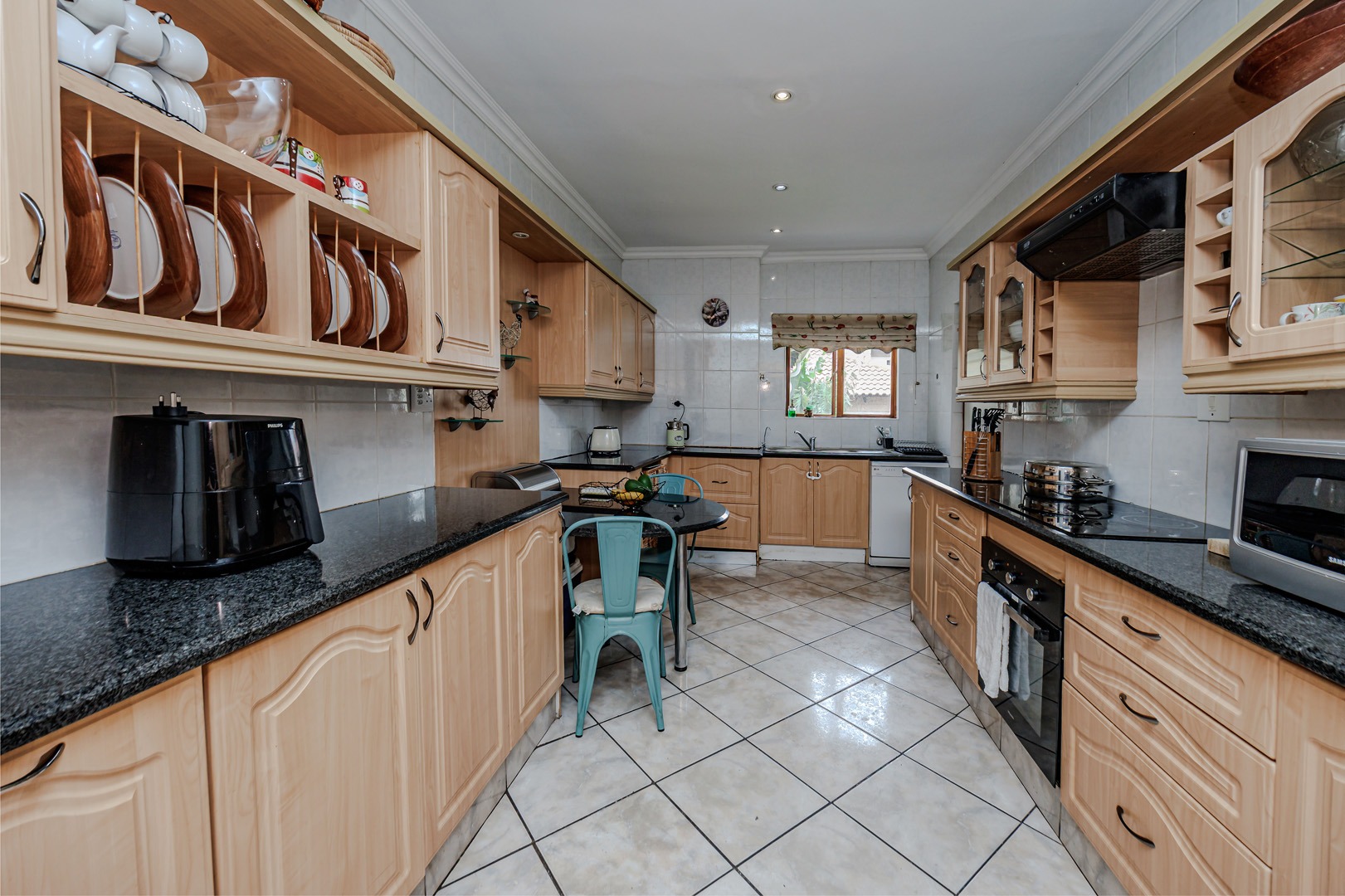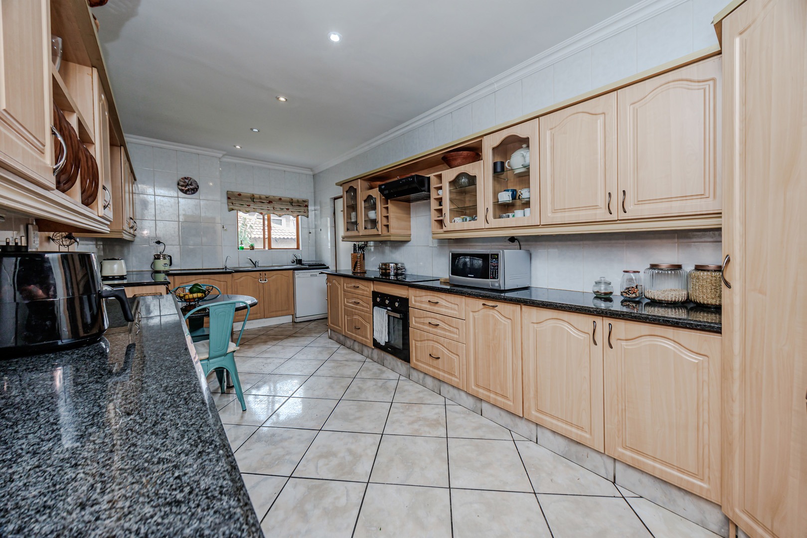 The interior layout is thoughtfully designed for both comfort and functionality, featuring two spacious lounges, a dedicated dining room, and an additional family TV room, providing ample space for relaxation and entertainment. The open-plan design enhances the flow between these principal living areas. The kitchen is appointed with light wood-toned cabinetry, dark granite-style countertops, a tiled backsplash, and integrated appliances including a built-in oven and electric hob, catering to modern culinary requirements.