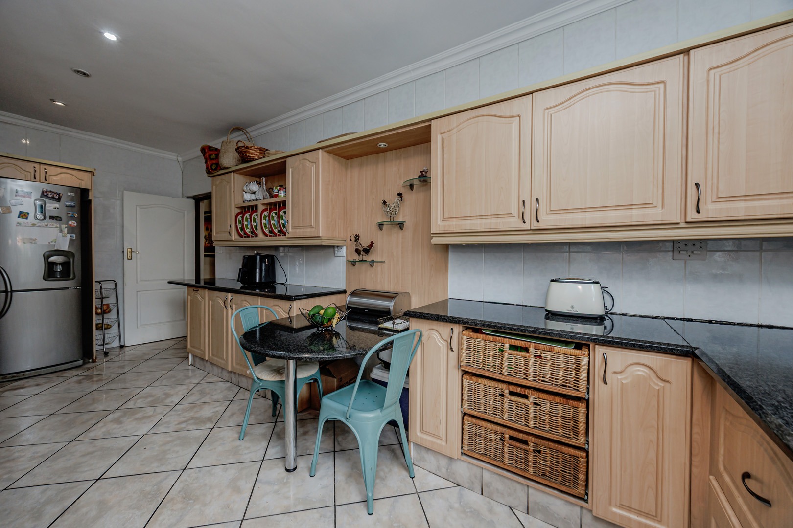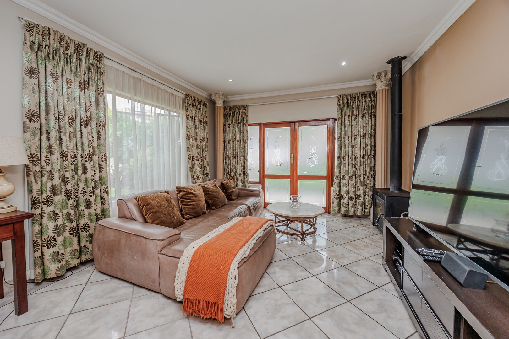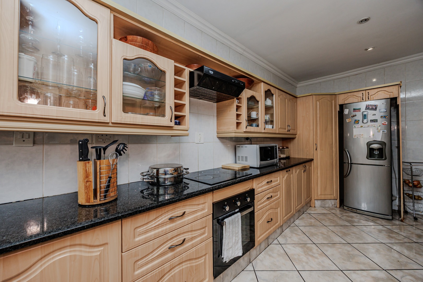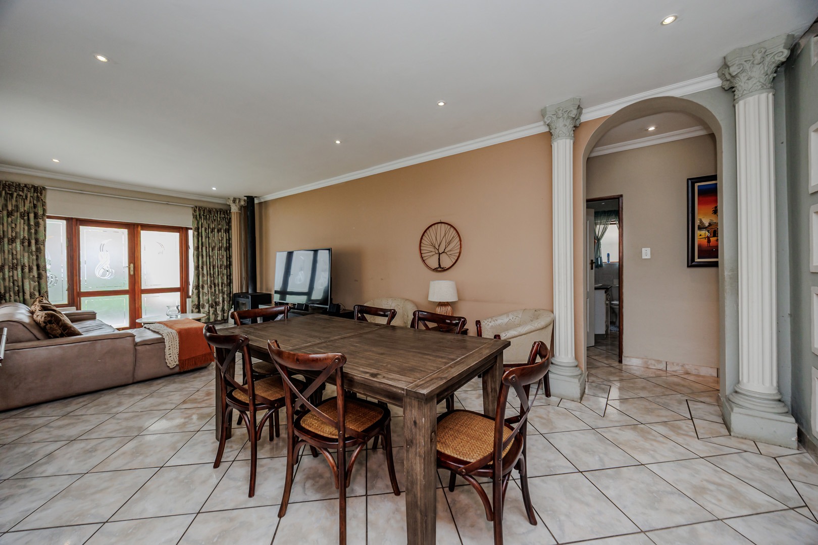 The interior layout is thoughtfully designed for both comfort and functionality, featuring two spacious lounges, a dedicated dining room, and an additional family TV room, providing ample space for relaxation and entertainment. The open-plan design enhances the flow between these principal living areas. The kitchen is appointed with light wood-toned cabinetry, dark granite-style countertops, a tiled backsplash, and integrated appliances including a built-in oven and electric hob, catering to modern culinary requirements.