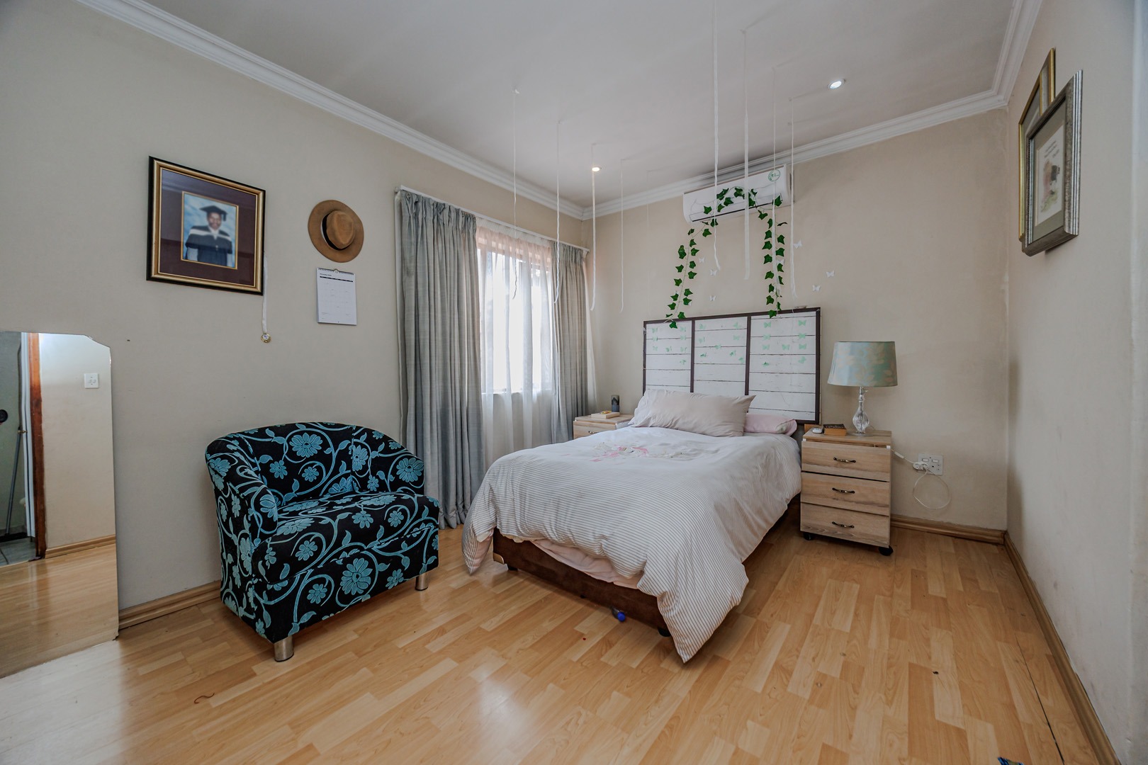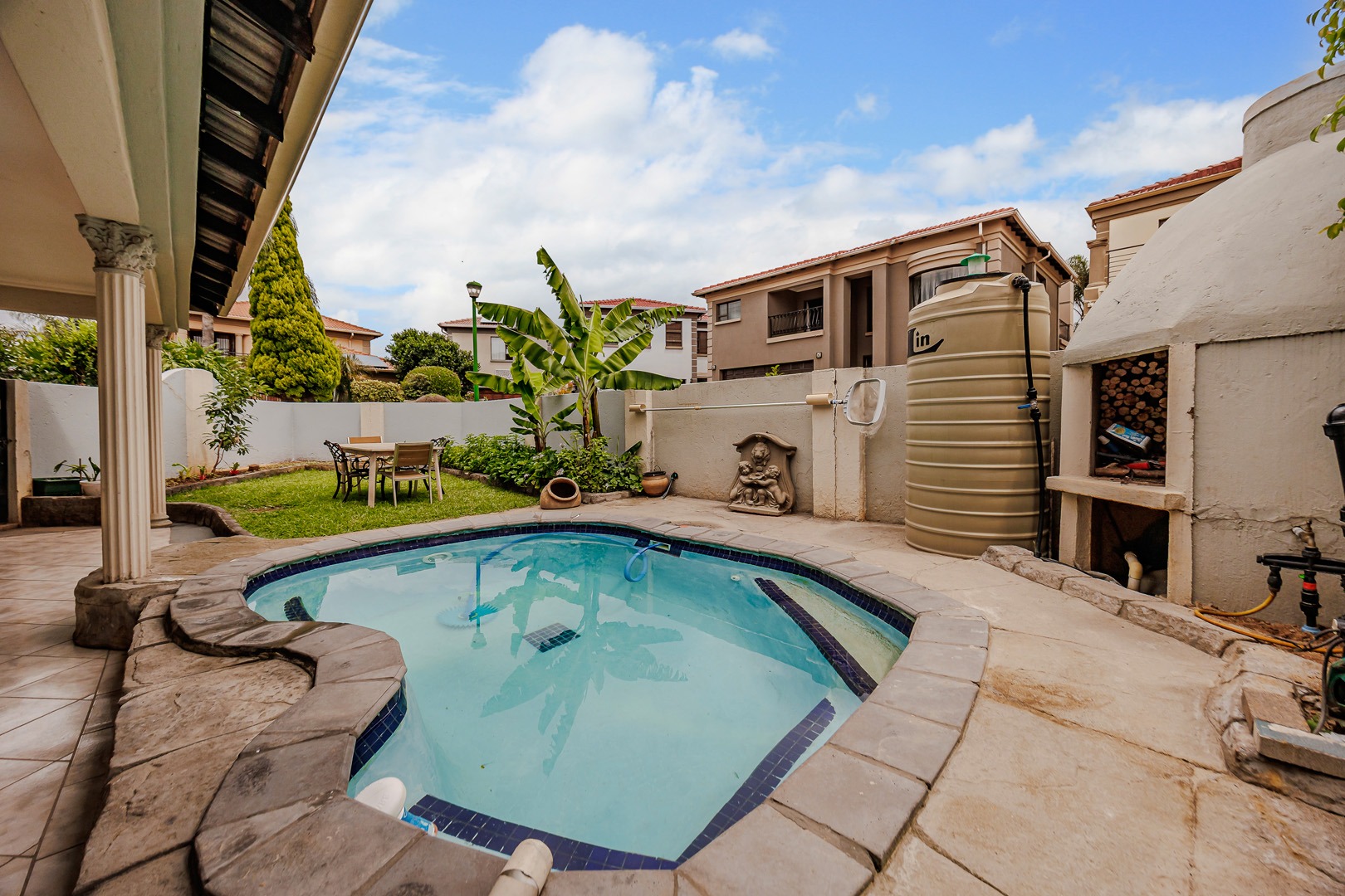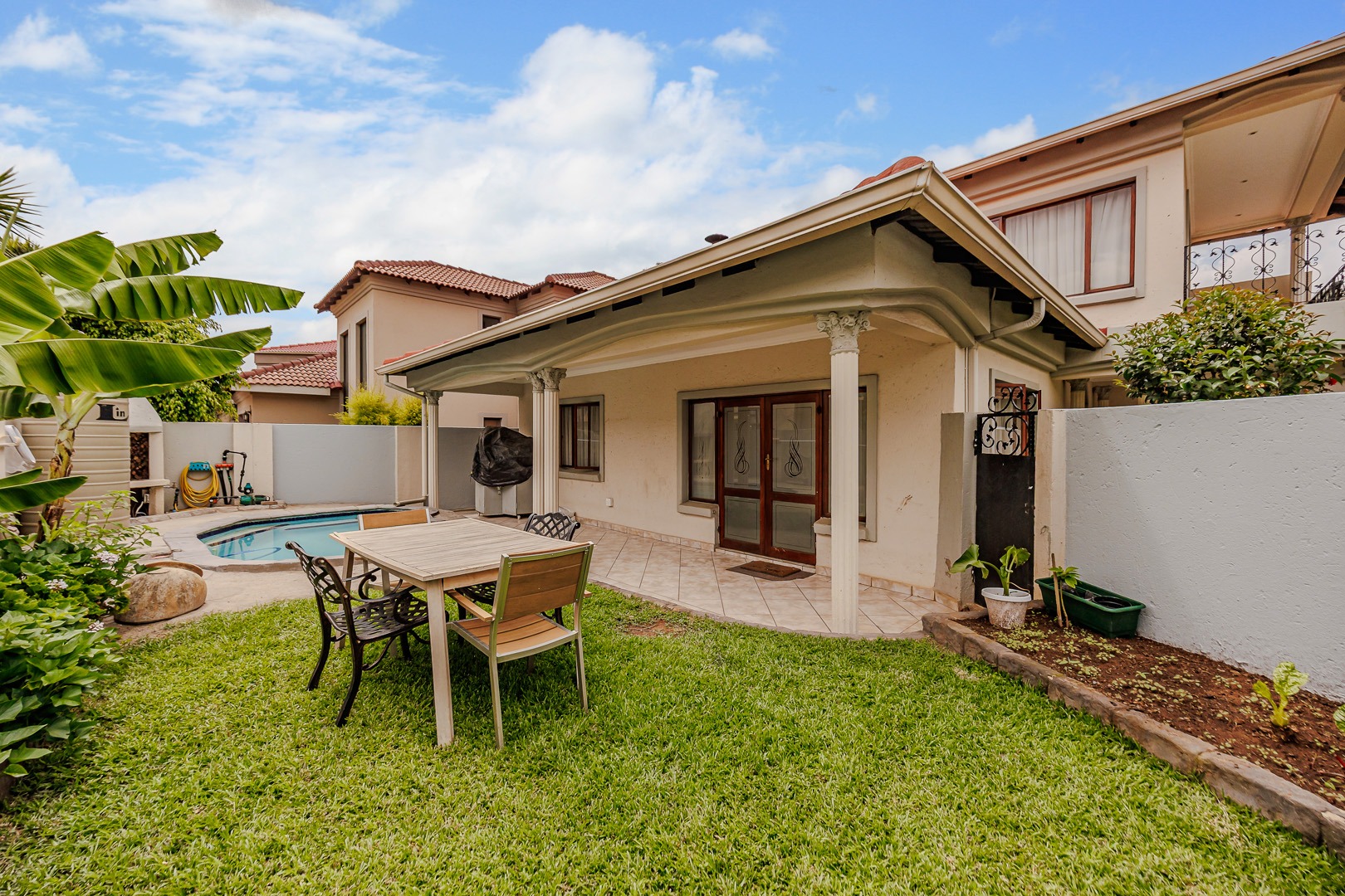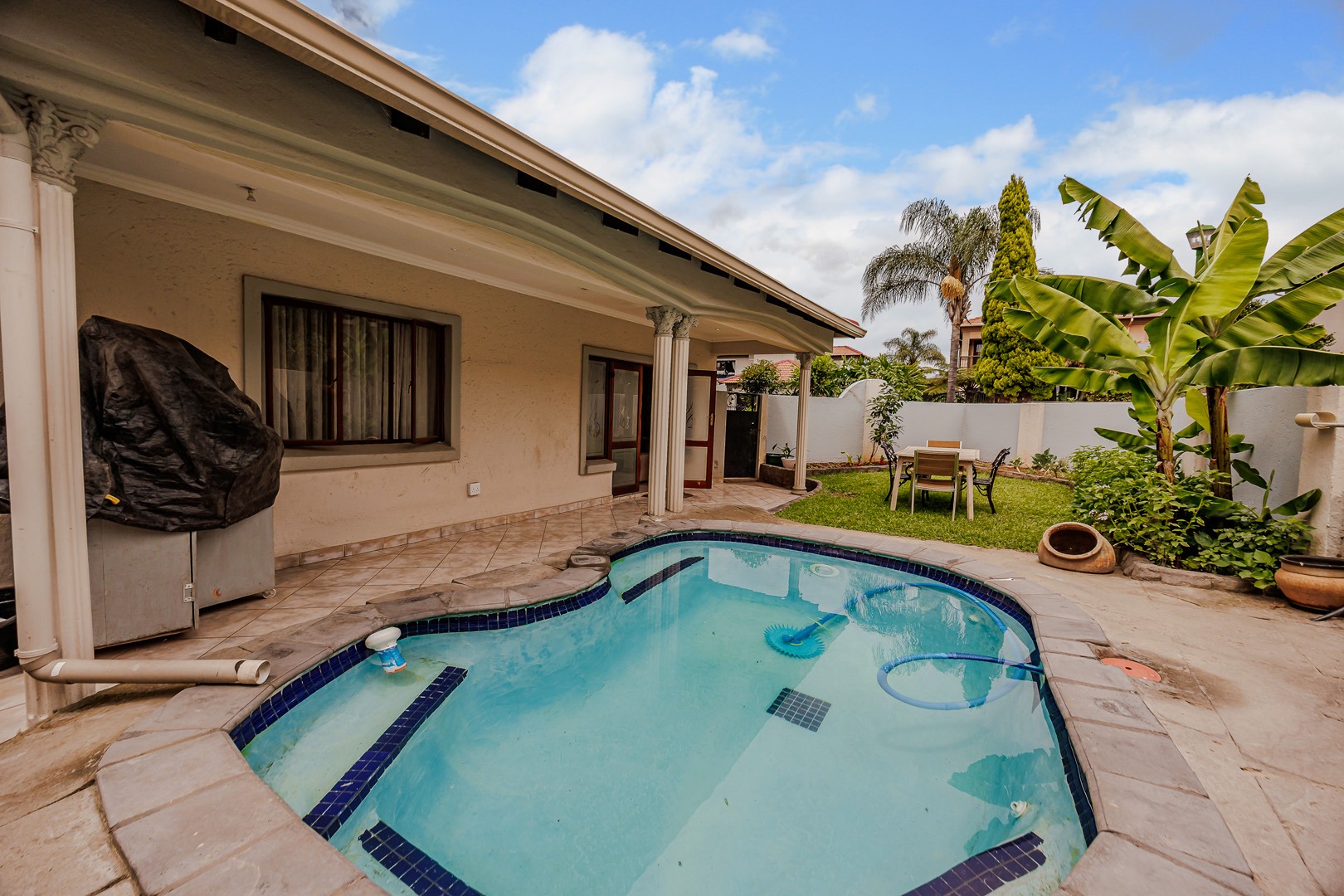 Accommodation comprises four well-proportioned bedrooms and three bathrooms, with one offering en-suite facilities, ensuring privacy and convenience for all occupants. A significant advantage of this property is the inclusion of a dedicated flatlet, offering versatile options for extended family, guests, or potential rental income. Air conditioning units are present, contributing to year-round comfort.