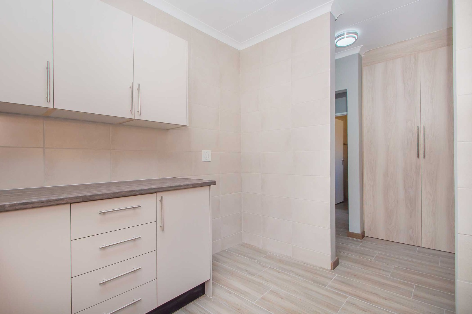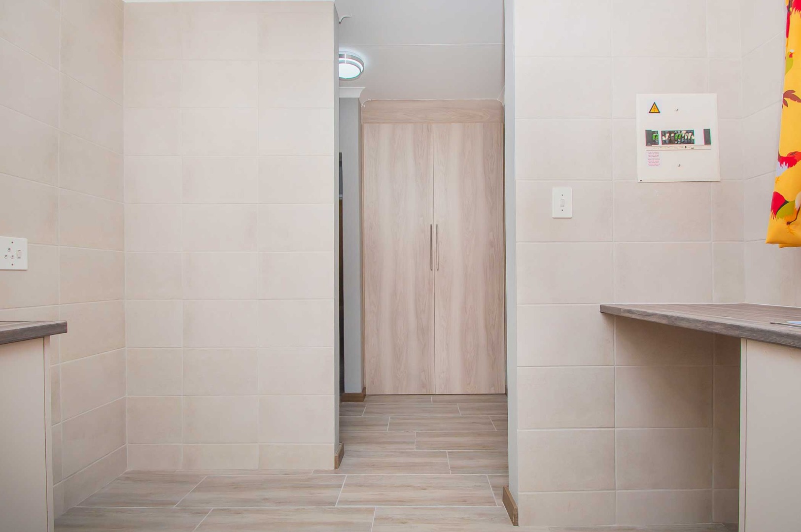 A brand new well equipped kitchen has space for your appliances. There is a super pantry cupboard too.