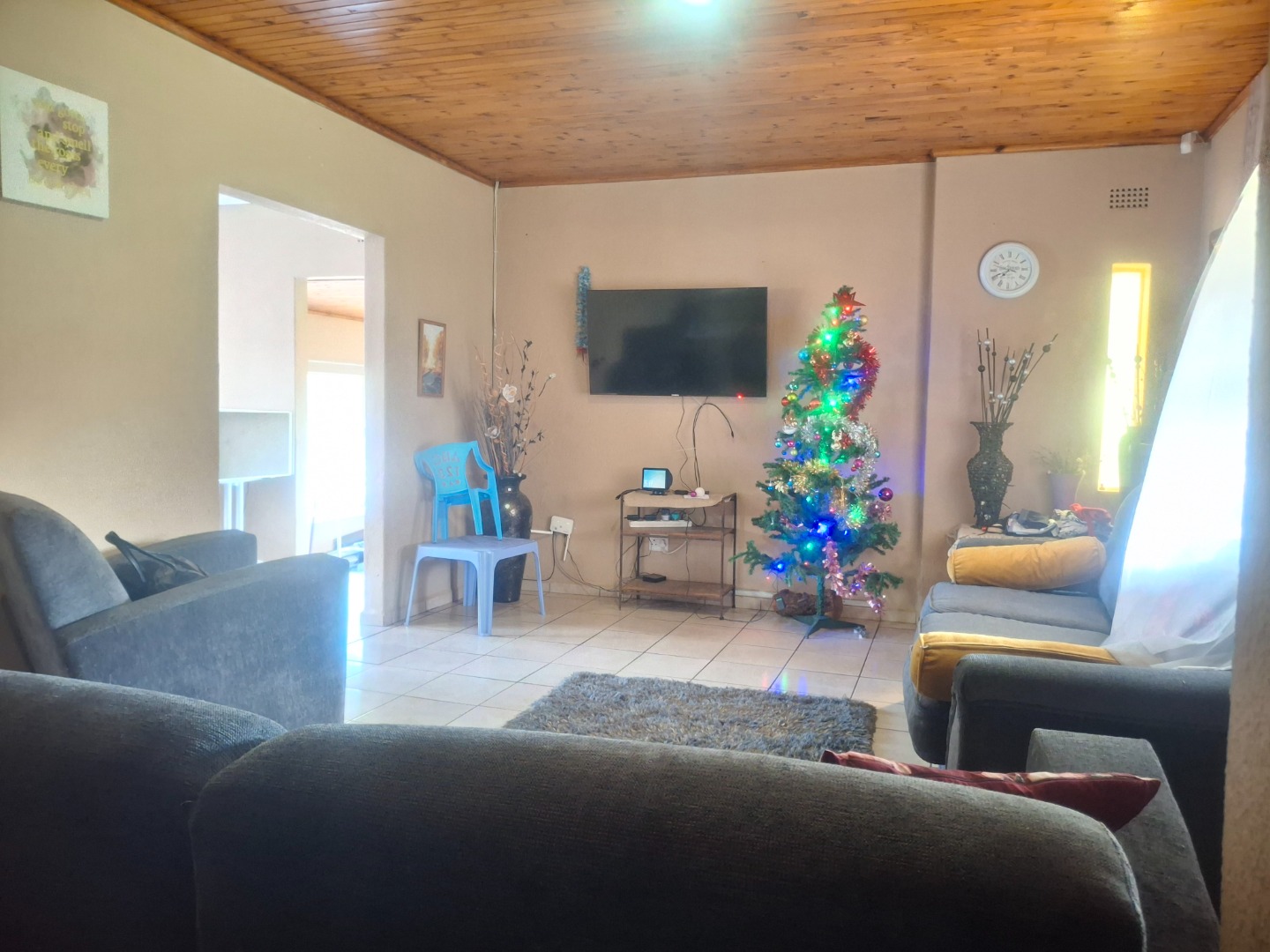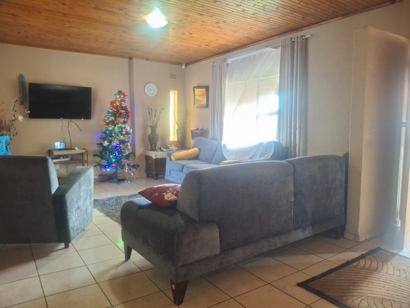 Step inside to find a home designed for practical living, boasting two spacious lounges that provide ample room for relaxation and entertaining. Throughout the main living areas, durable tiled flooring is paired with distinctive wooden plank ceilings, adding character and warmth. Large windows and sliding door ensure abundant natural light fills the interiors, creating a bright and welcoming atmosphere.