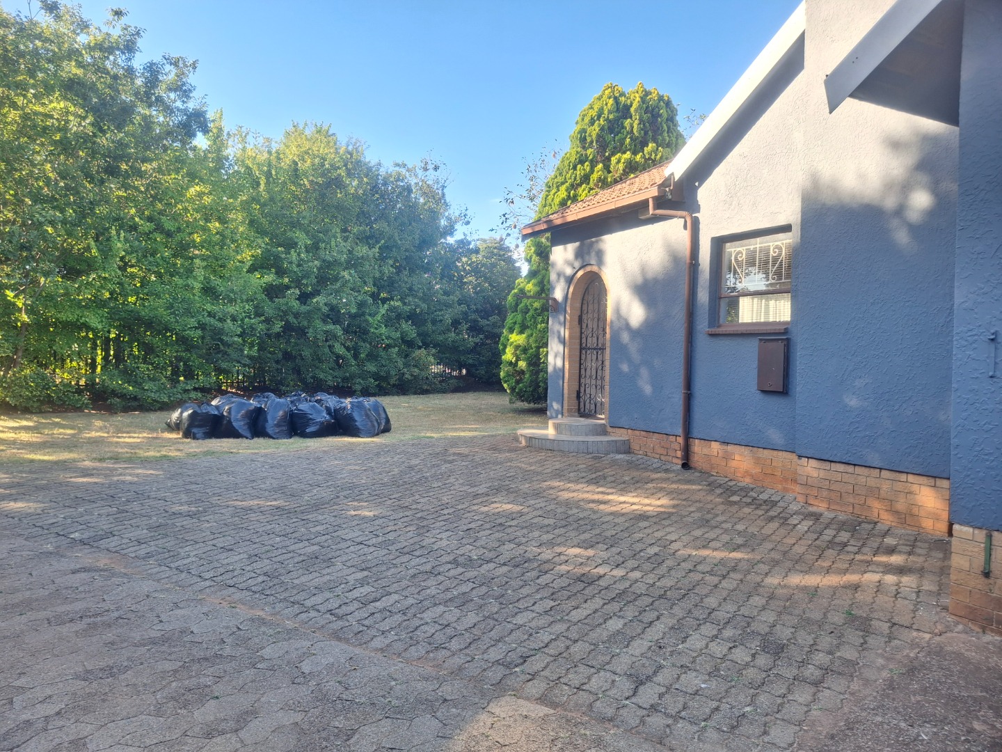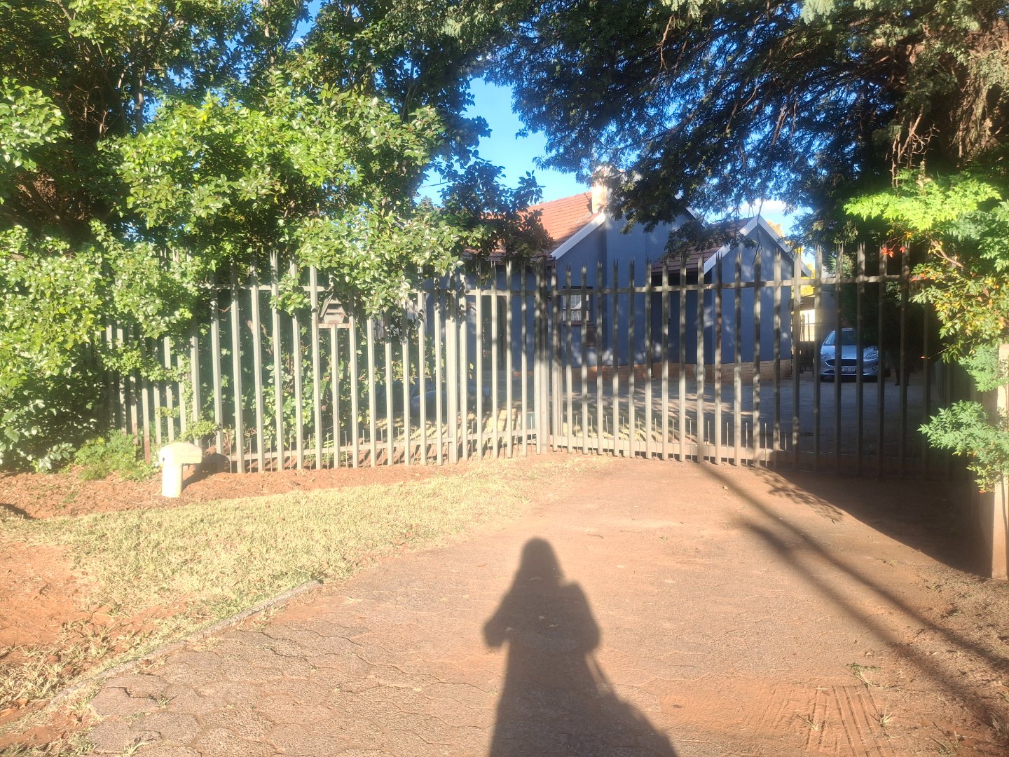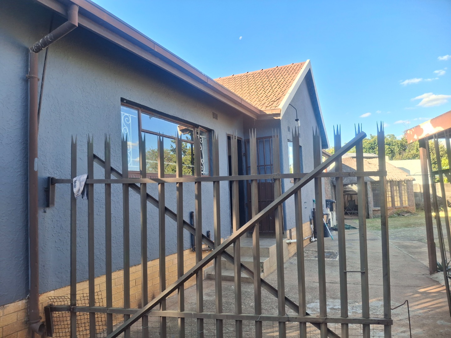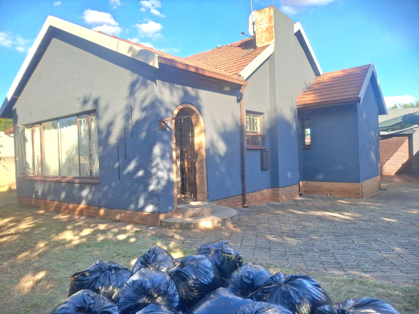 Discover this charming suburban residence located in Witpoortjie, Roodepoort. The property immediately impresses with its painted blue-grey exterior, complemented by a classic terracotta tile roof. A secure palisade fence and metal access gate lead to an extensive paved driveway, offering ample parking and a single garage. Mature trees provide natural shade and enhance the home's kerb appeal, creating a welcoming first impression.