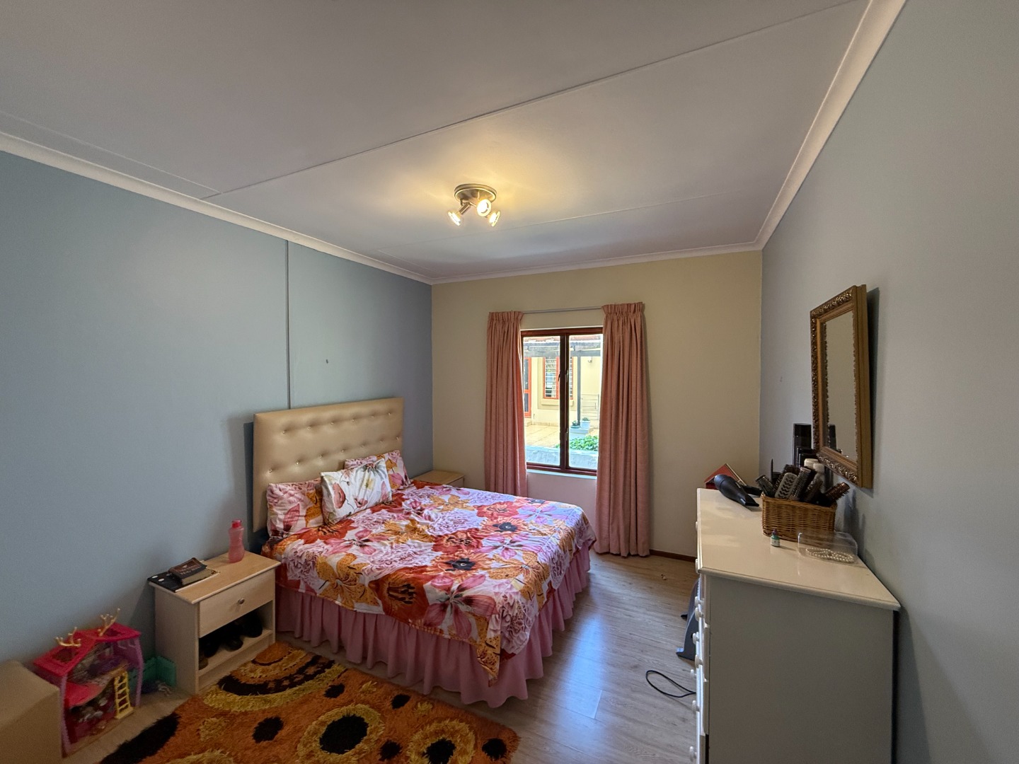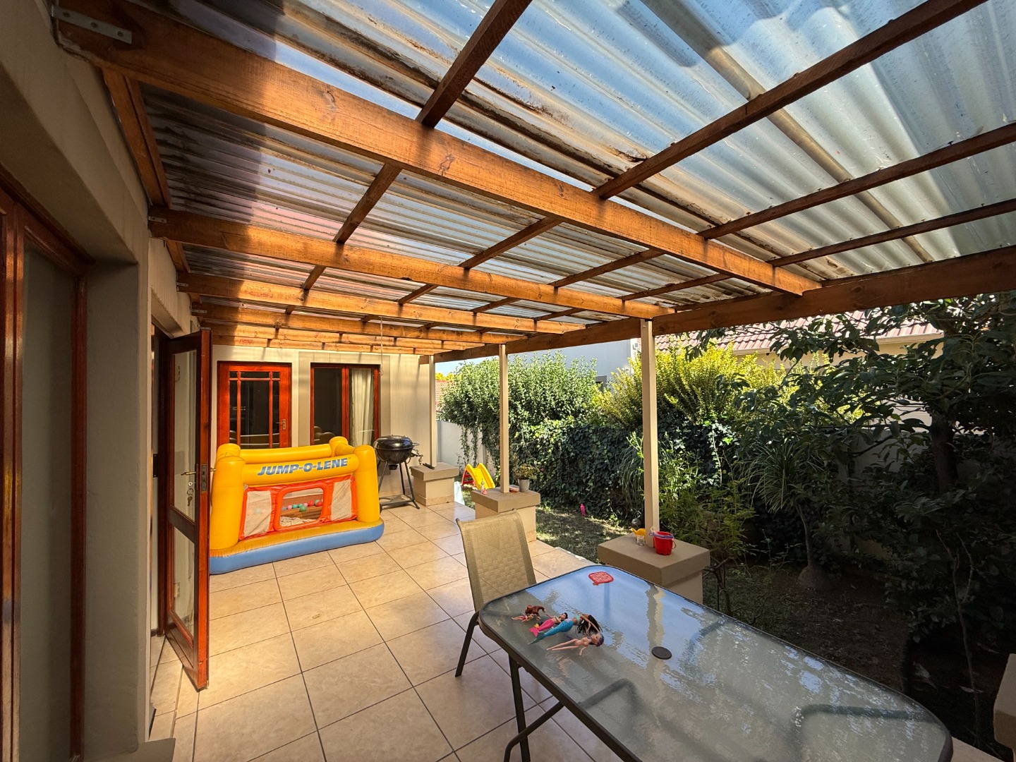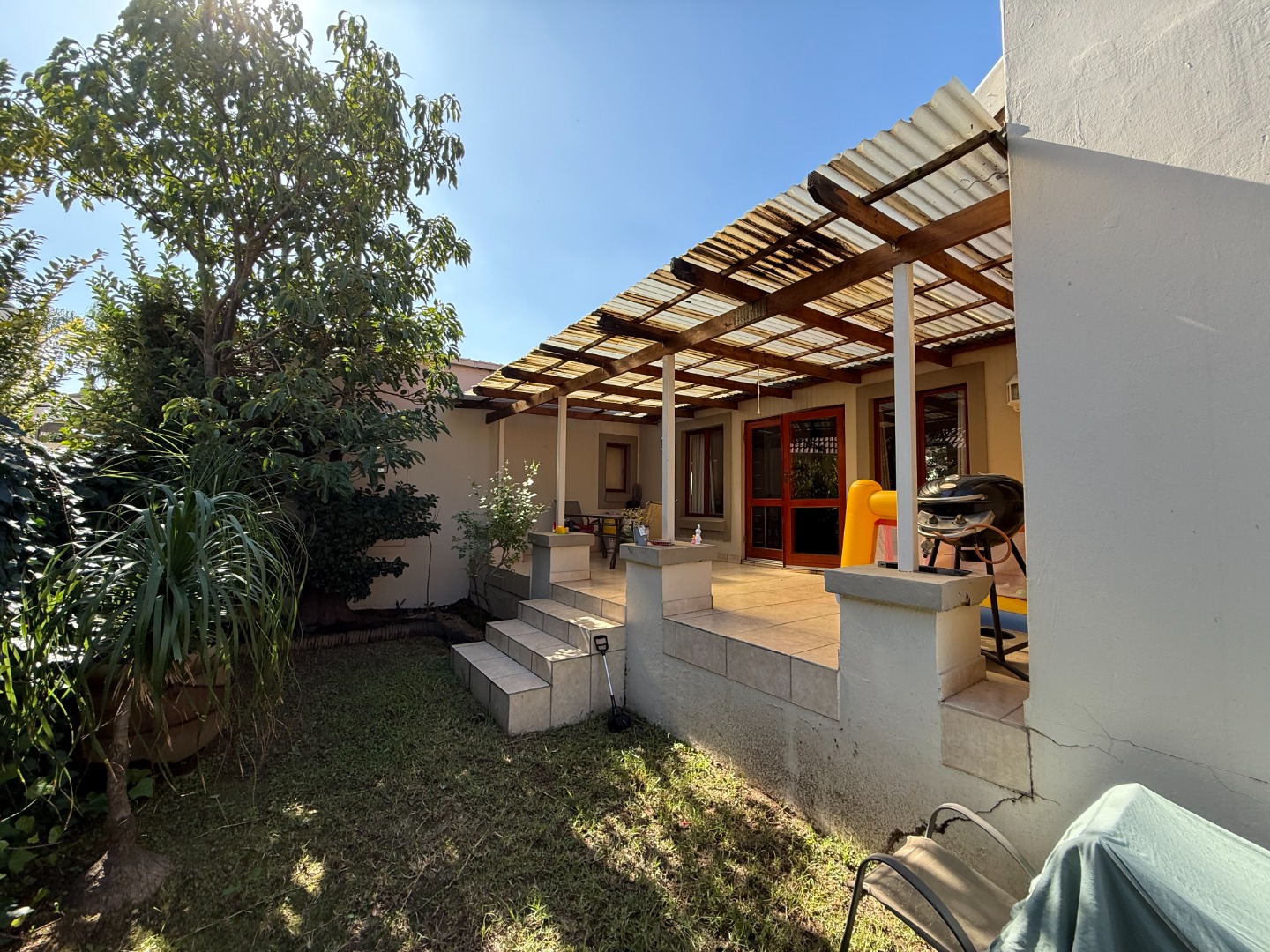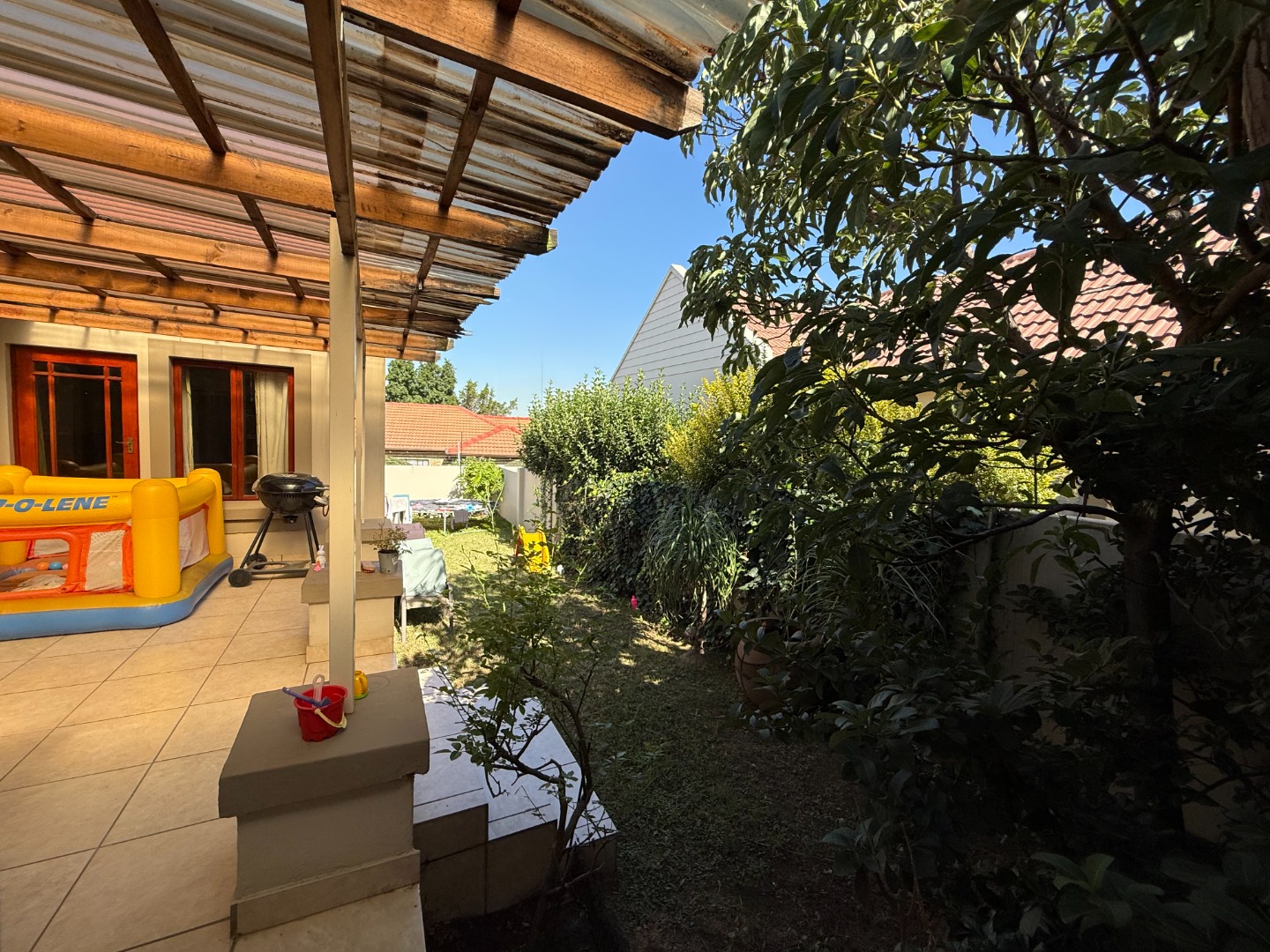The residence offers three generously sized bedrooms, each with built-in cupboards. The open-plan kitchen and lounge area creates a welcoming and functional living space, with room for two under-counter appliances and a double-door fridge. The lounge extends seamlessly onto a covered patio, overlooking a private garden – perfect for relaxing or entertaining guests.
