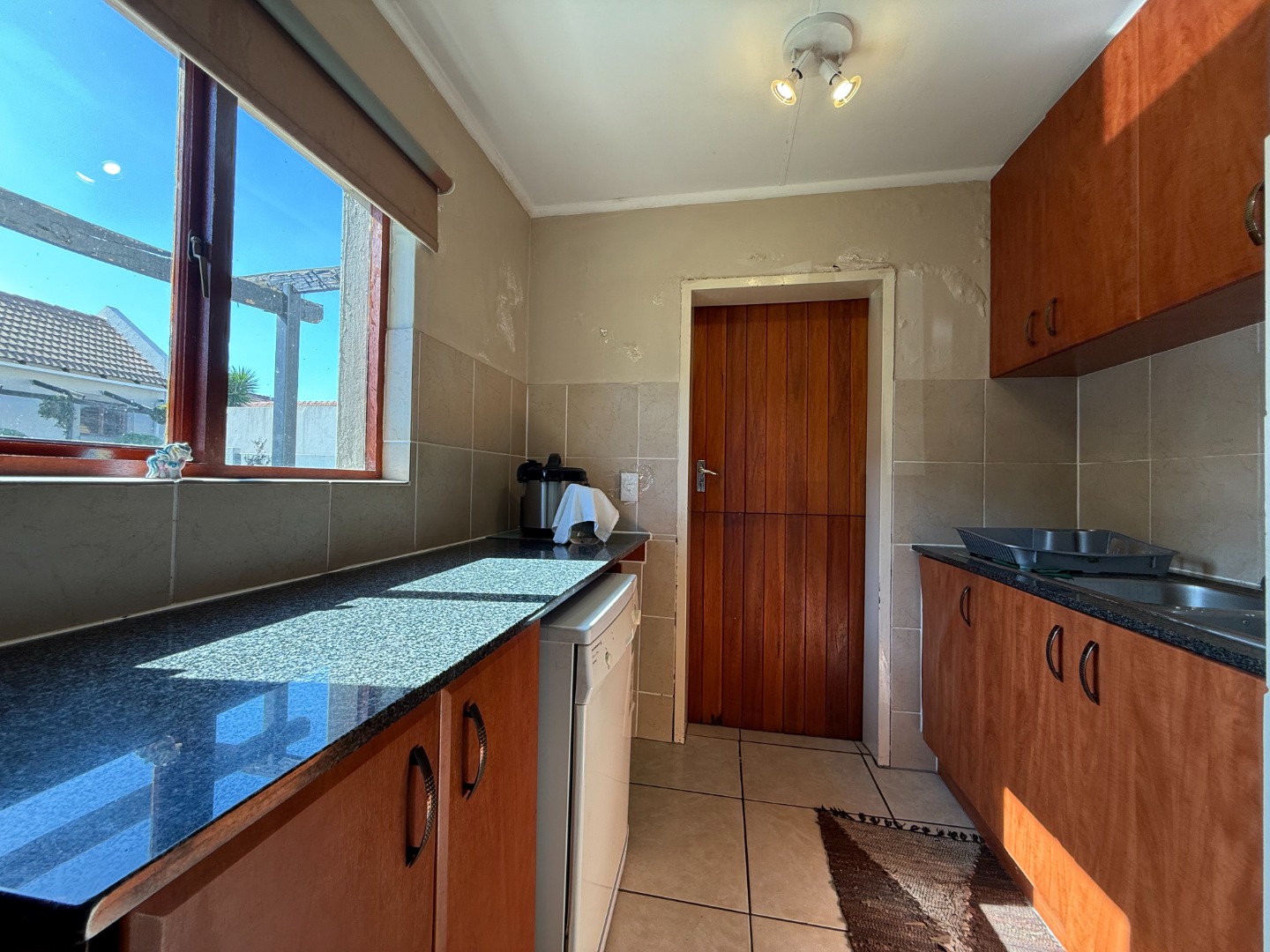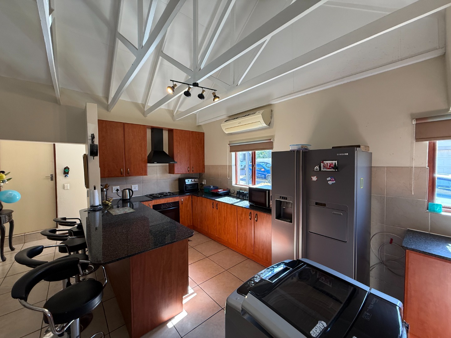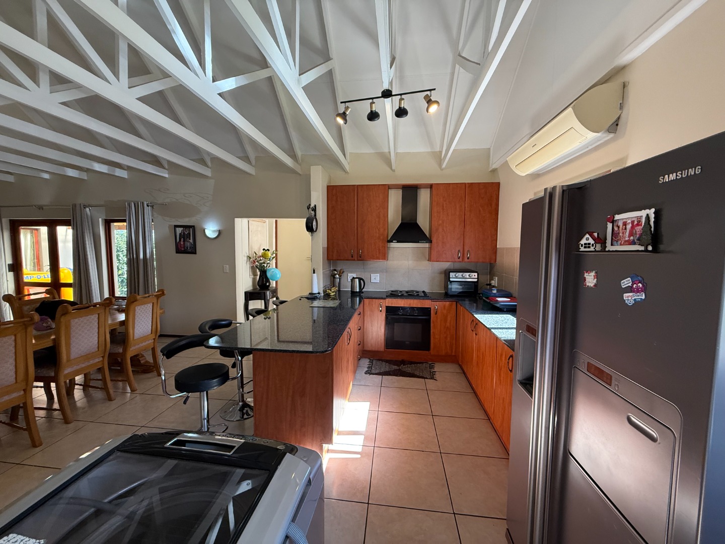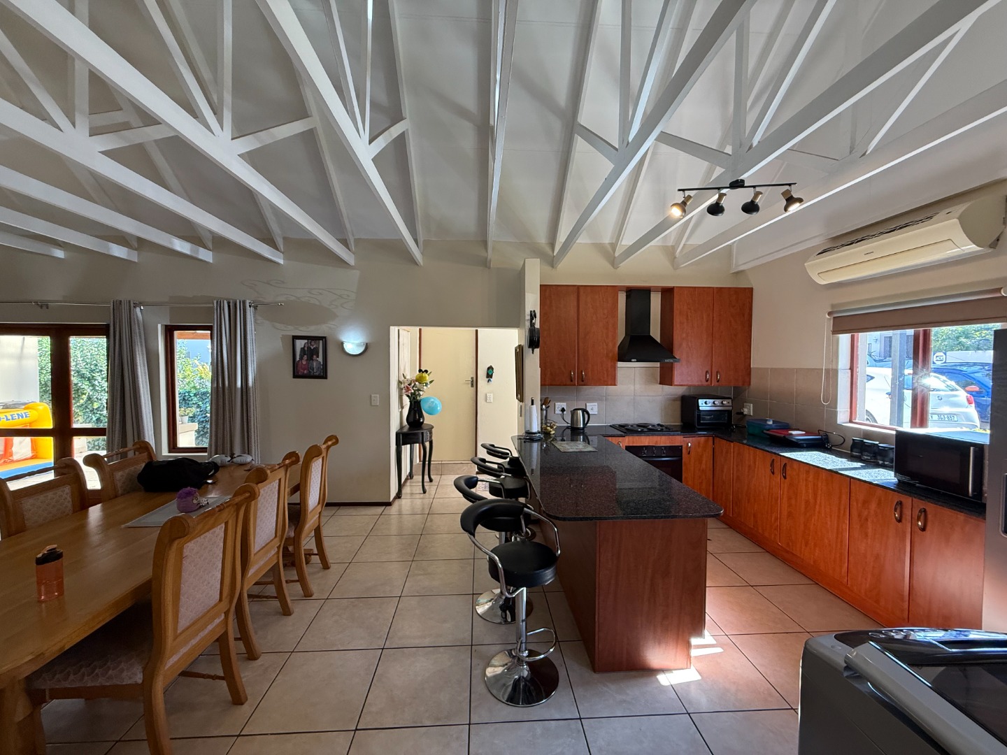 The residence offers three generously sized bedrooms, each with built-in cupboards. The open-plan kitchen and lounge area creates a welcoming and functional living space, with room for two under-counter appliances and a double-door fridge. The lounge extends seamlessly onto a covered patio, overlooking a private garden – perfect for relaxing or entertaining guests.
