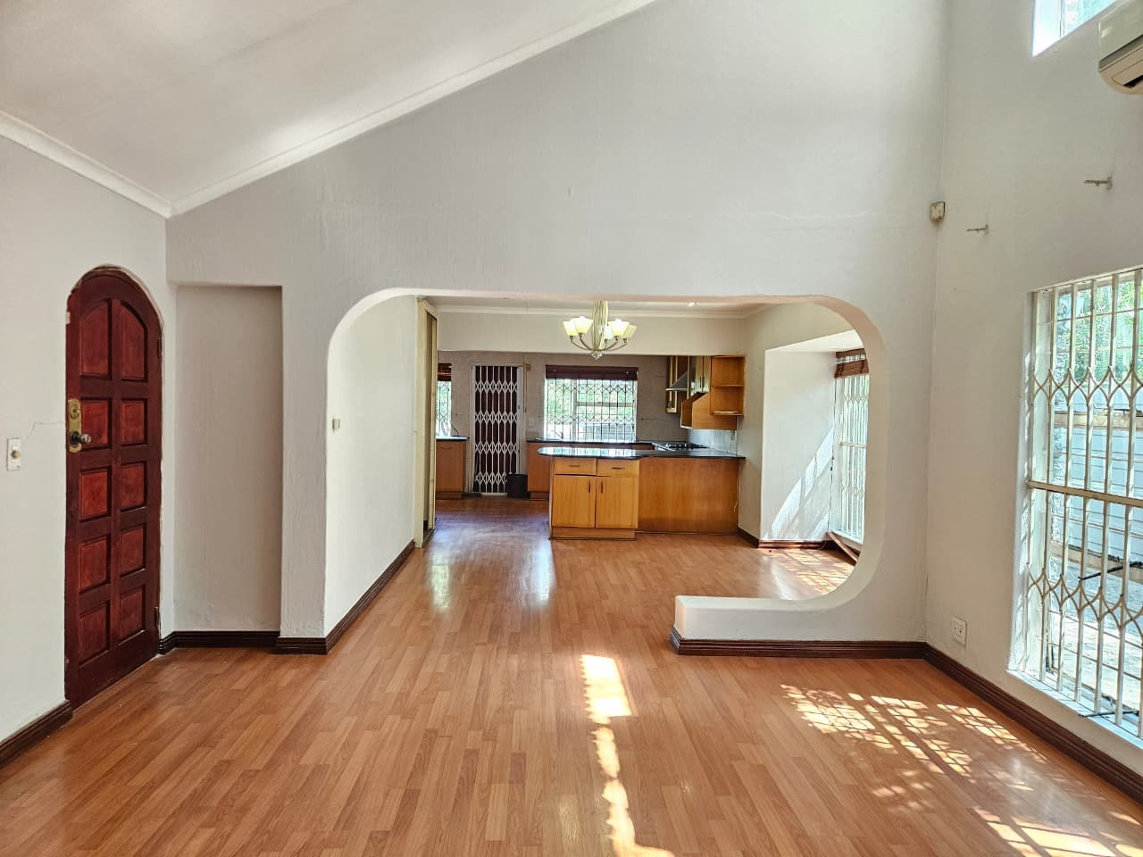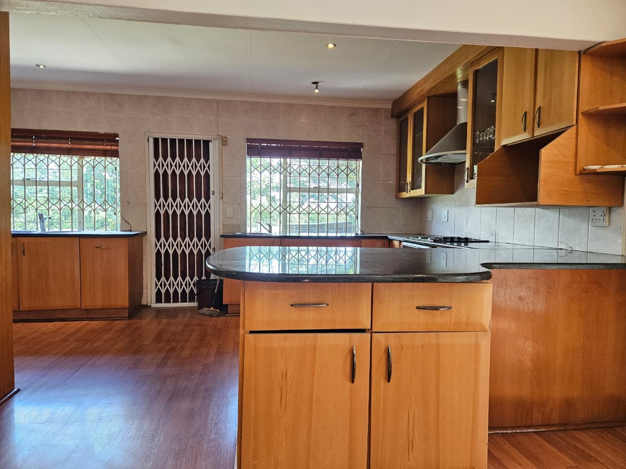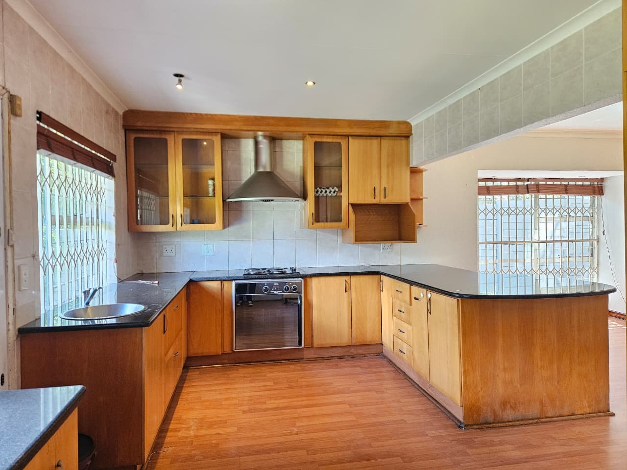 Step inside to discover an inviting open-plan layout, featuring a comfortable lounge and a dedicated dining room, perfect for both daily living and entertaining. The well-appointed kitchen boasts light wood cabinetry, dark countertops, a built-in hob, and a practical island, benefiting from ample natural light through windows fitted with security bars. Accommodation includes three generously sized bedrooms and three bathrooms, with one offering the privacy and convenience of an en-suite.