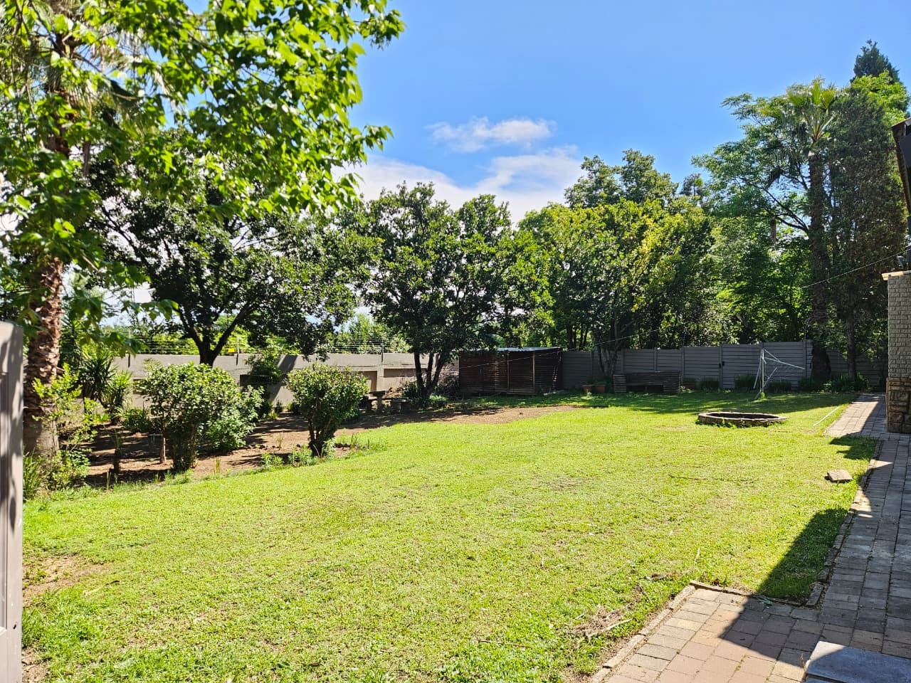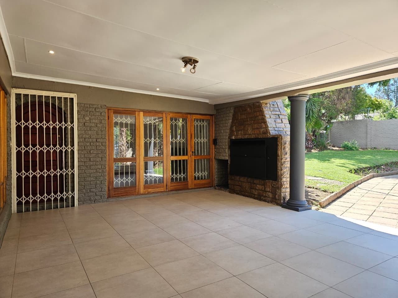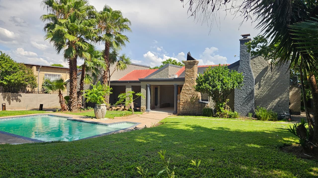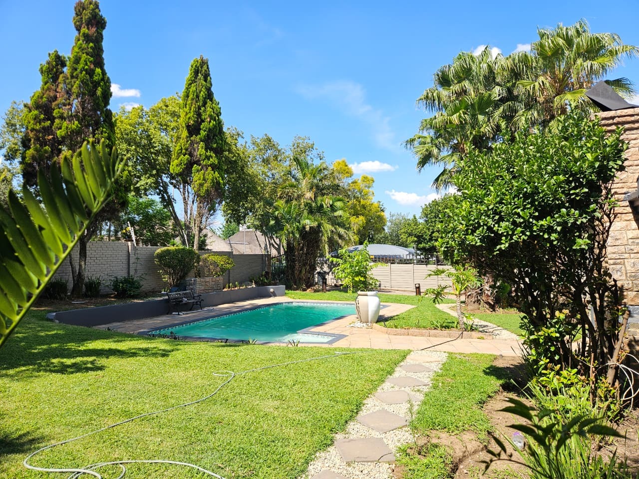 The expansive outdoor area is a true highlight, set on a substantial 1500 sqm erf. It features a sparkling swimming pool, surrounded by a lush, irrigated garden with mature trees and established beds, providing a serene retreat. A spacious covered patio, complete with tiled flooring and a built-in braai, offers an ideal setting for al fresco dining and entertaining, with wooden folding doors opening directly to the garden. An additional outdoor stone seating area provides another spot for relaxation.