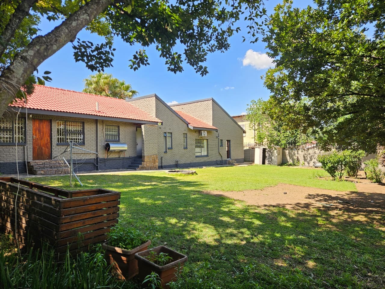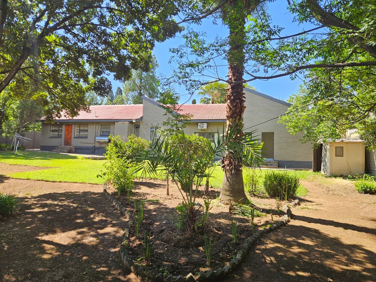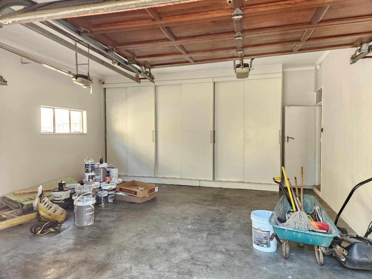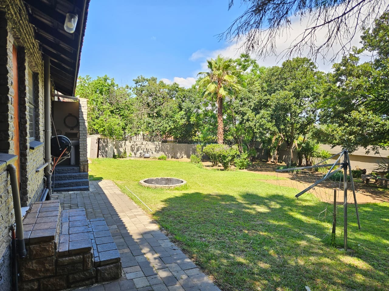 The expansive outdoor area is a true highlight, set on a substantial 1500 sqm erf. It features a sparkling swimming pool, surrounded by a lush, irrigated garden with mature trees and established beds, providing a serene retreat. A spacious covered patio, complete with tiled flooring and a built-in braai, offers an ideal setting for al fresco dining and entertaining, with wooden folding doors opening directly to the garden. An additional outdoor stone seating area provides another spot for relaxation.