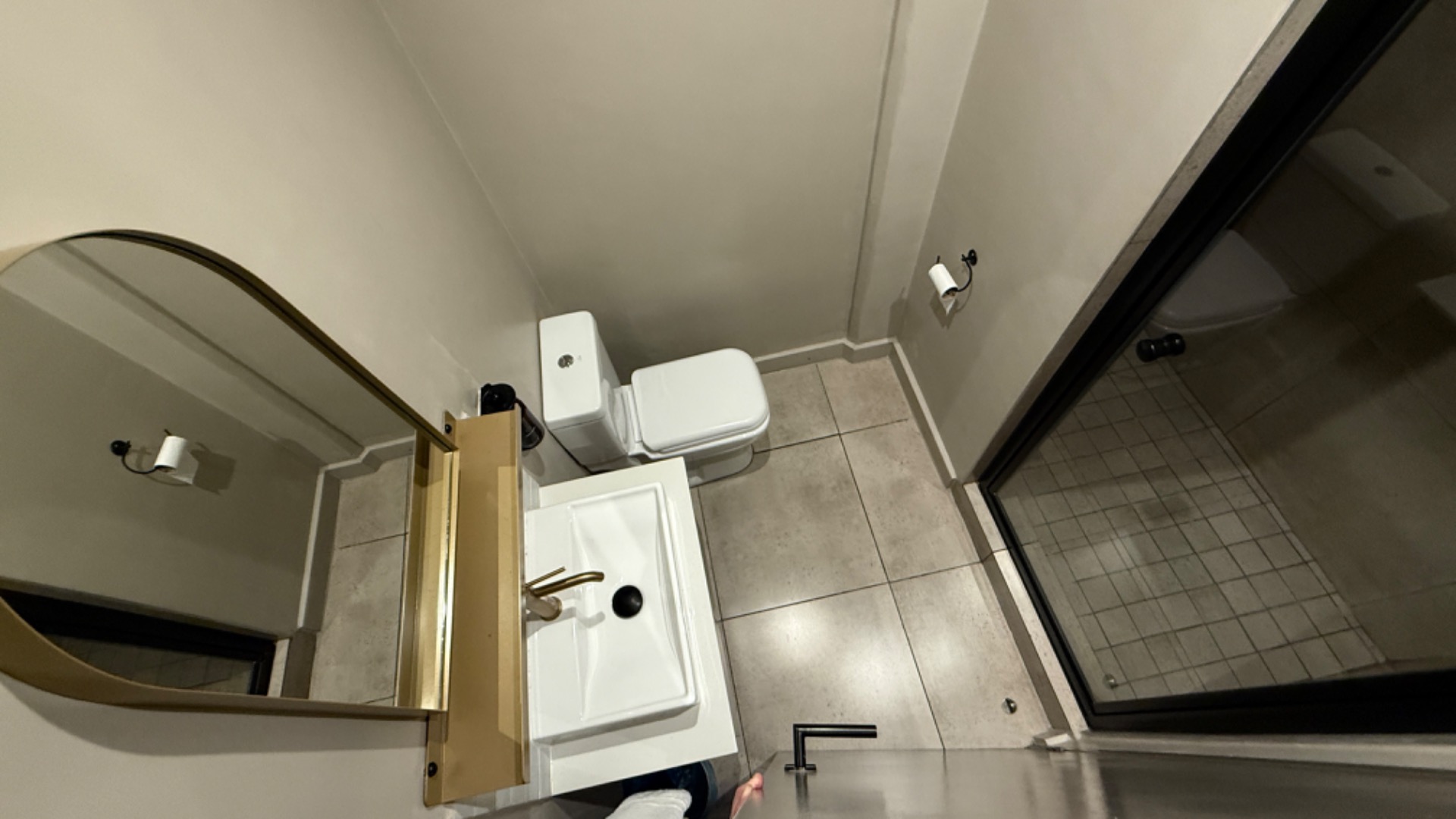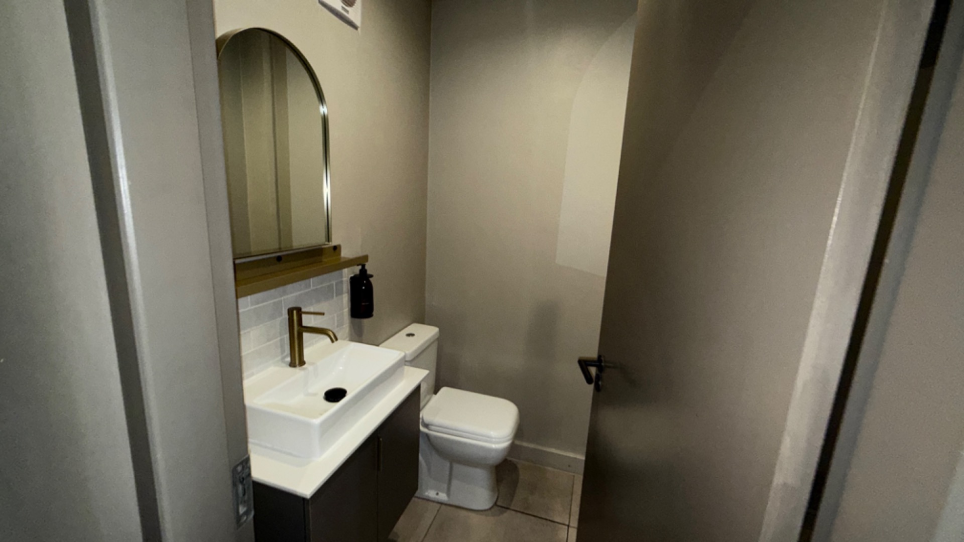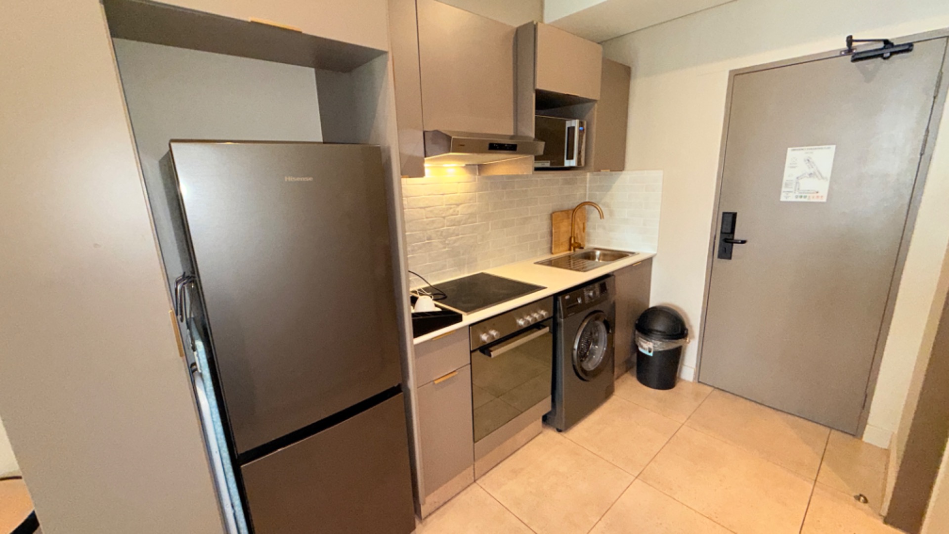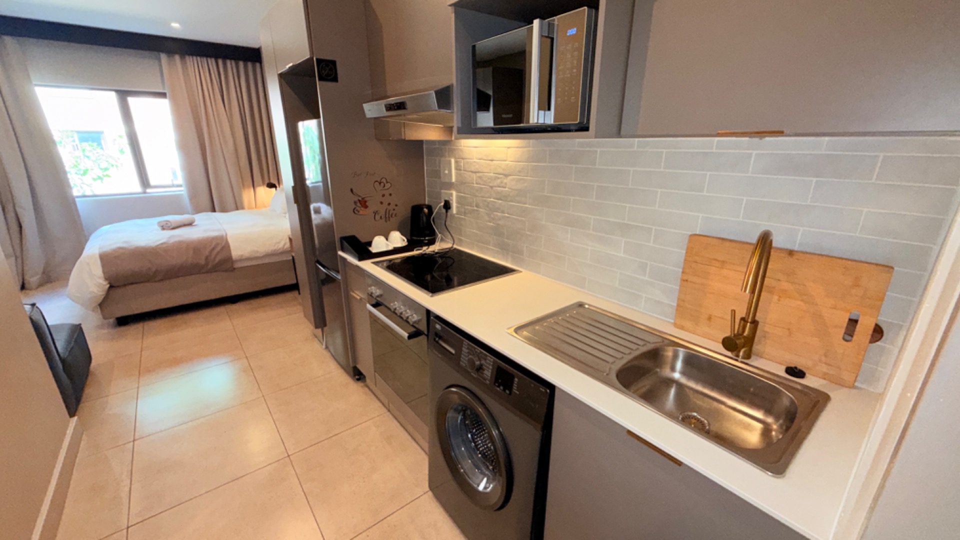 This modern studio apartment, spanning 24 square meters, offers an efficient and stylish living solution in the heart of Sandown, Sandton. The interior boasts a contemporary design with practical tiled flooring throughout. The integrated kitchenette is a highlight, featuring sleek grey cabinetry, dark stainless steel appliances including a refrigerator, integrated washing machine, glass hob, oven, and microwave. A stylish subway tile backsplash and brass-colored faucet complete this functional space, perfect for urban living.