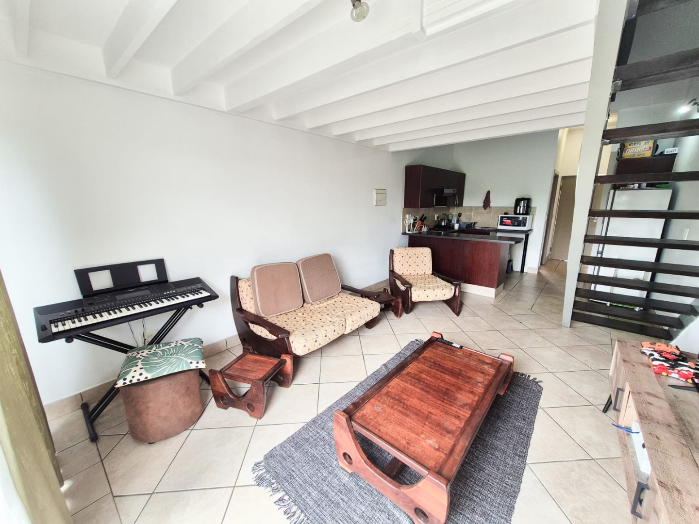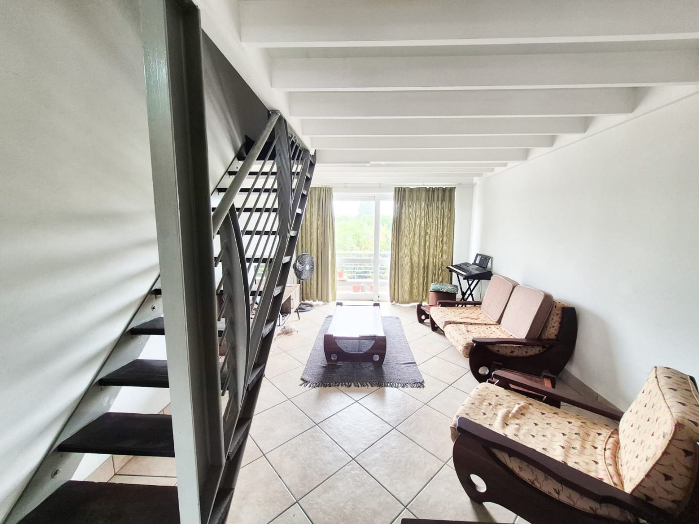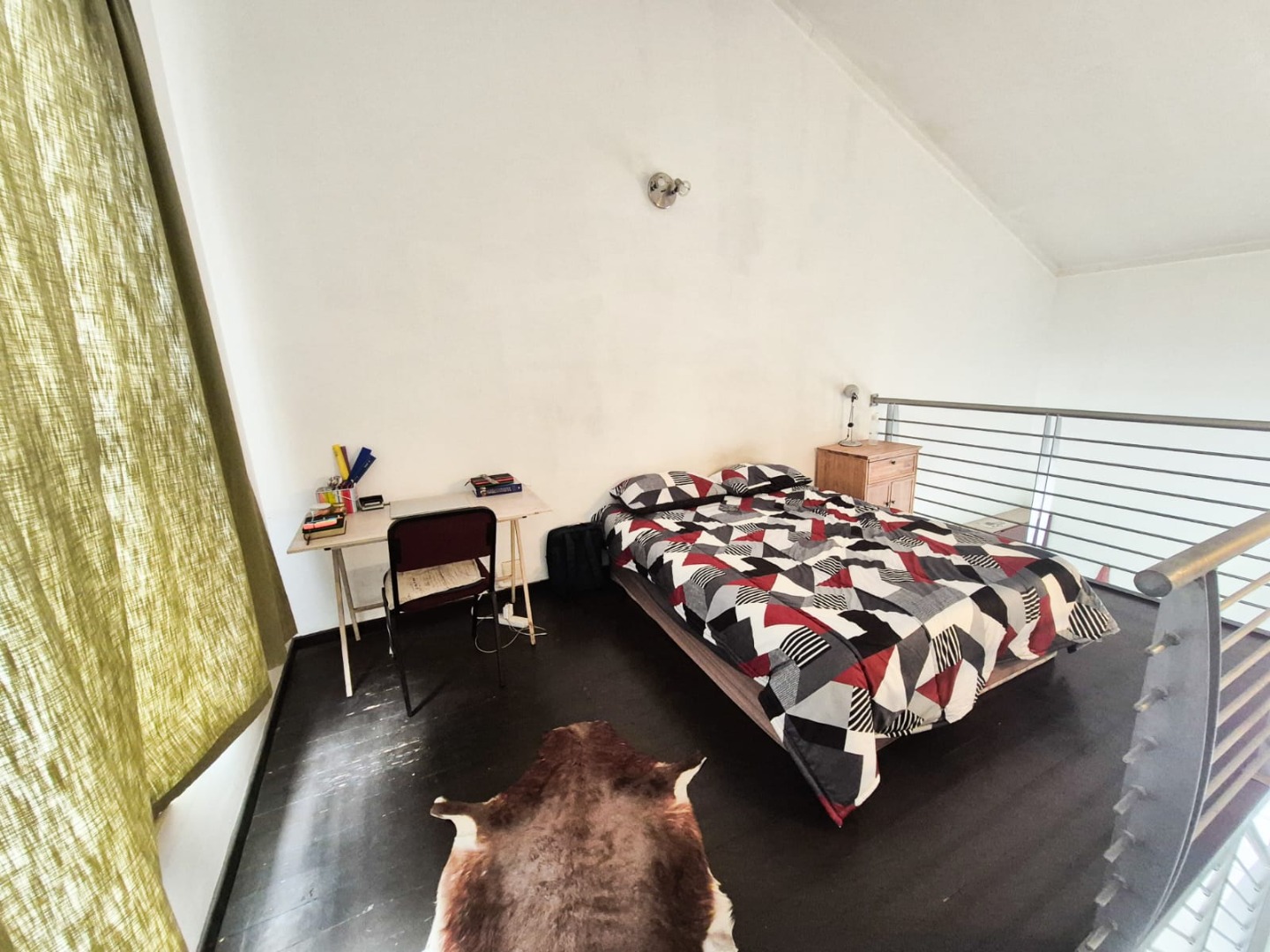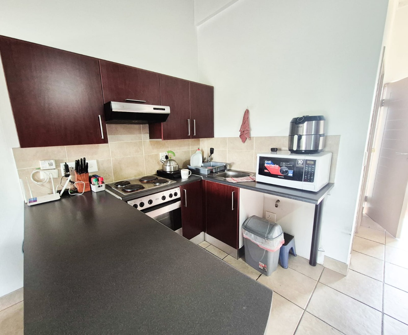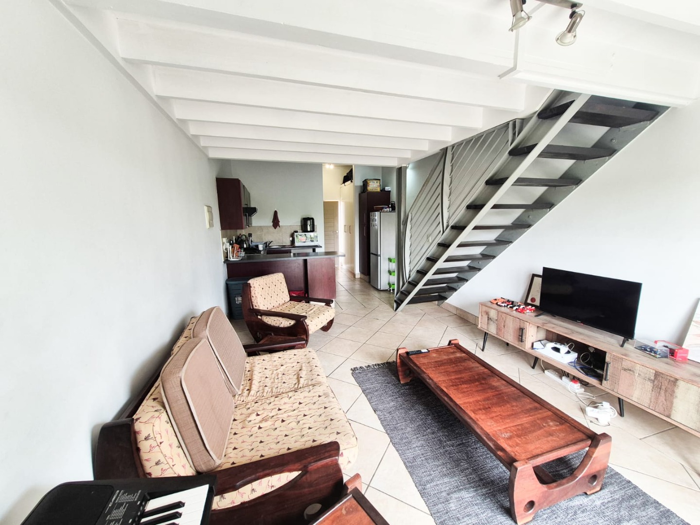 This charming 1-bedroom, 1-bathroom loft apartment in Sunninghill, Sandton, offers a super comfy and modern living space. Step inside to an open-plan lounge and family TV room with cool high beamed ceilings and easy-to-maintain tiled flooring. The modern metal staircase adds a touch of industrial chic, leading you up to the cozy loft bedroom. The compact kitchen is neat and functional, featuring dark wood cabinets and countertops, perfect for whipping up your favourite meals.