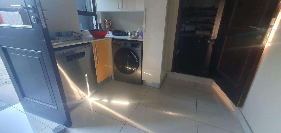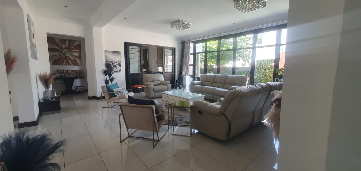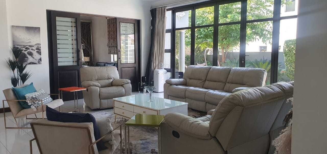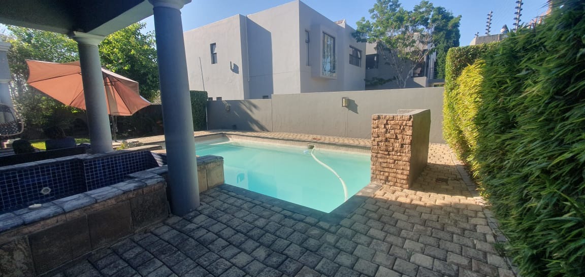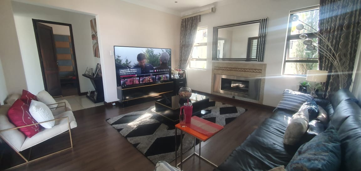 Further enhancing this distinguished property are two dedicated garages, providing secure parking. The living areas open directly onto a lush garden, offering a serene outdoor retreat. Situated within a coveted security estate, this home provides peace of mind and an exclusive community environment. This prime location offers convenient access to premier amenities and essential urban conveniences.